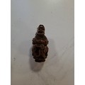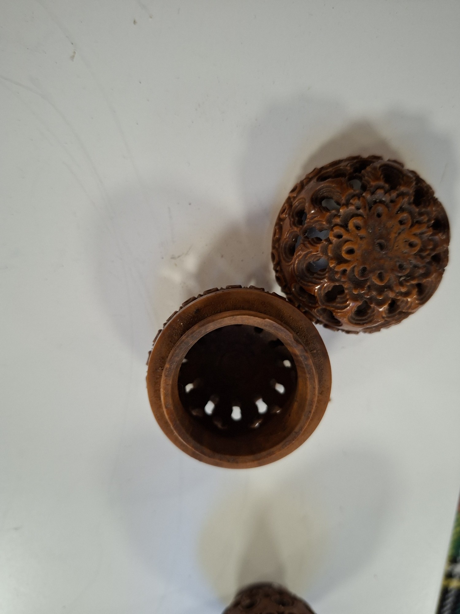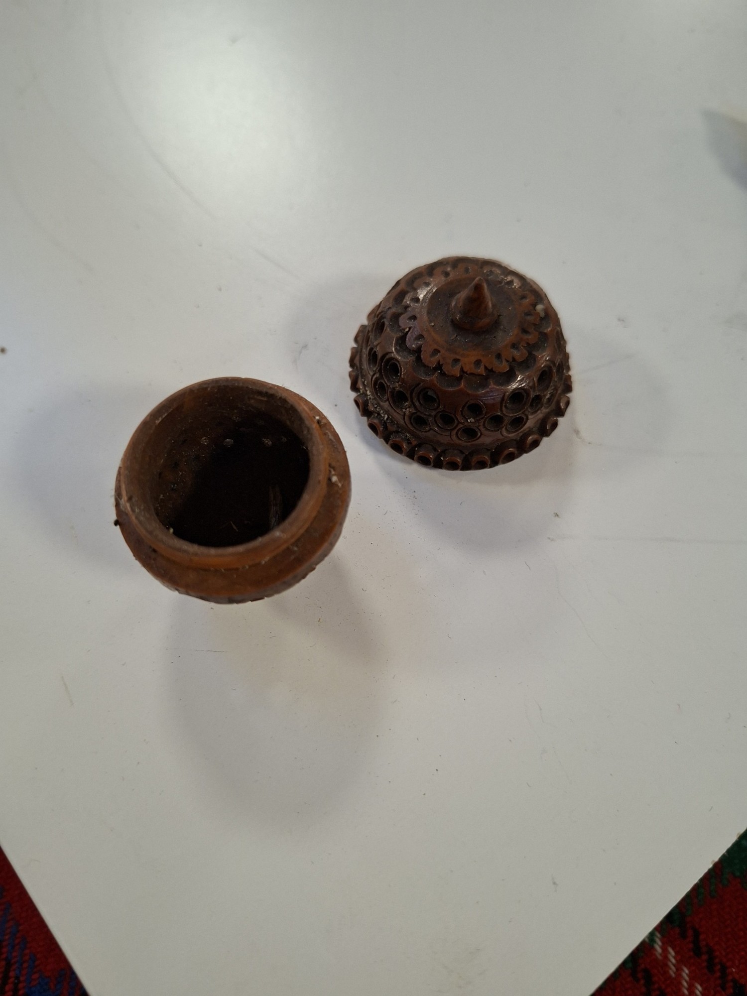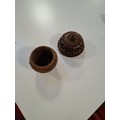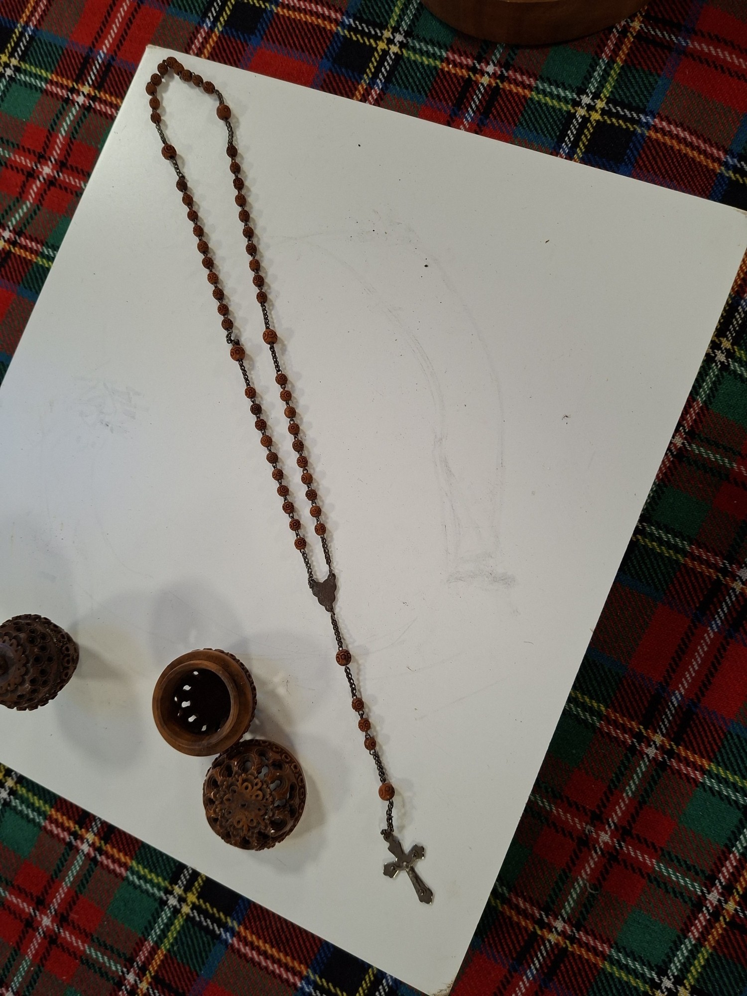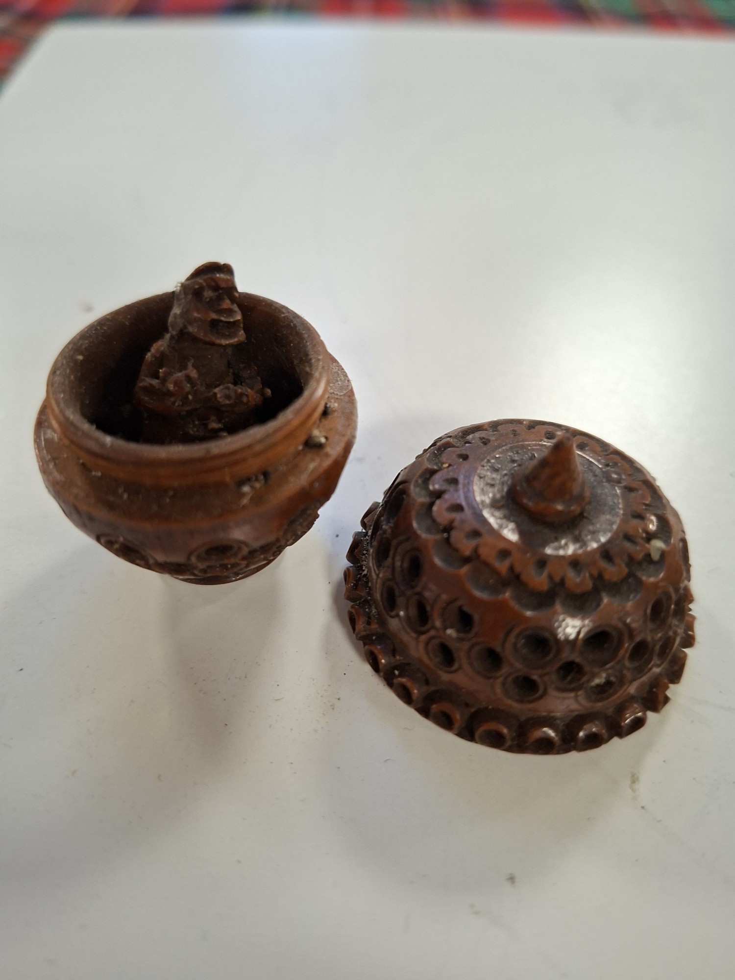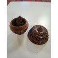 Vintage hand carved egg shaped rosary beads and case, plus antique hand carved Coquilla Nut thimble or needle holder