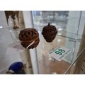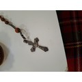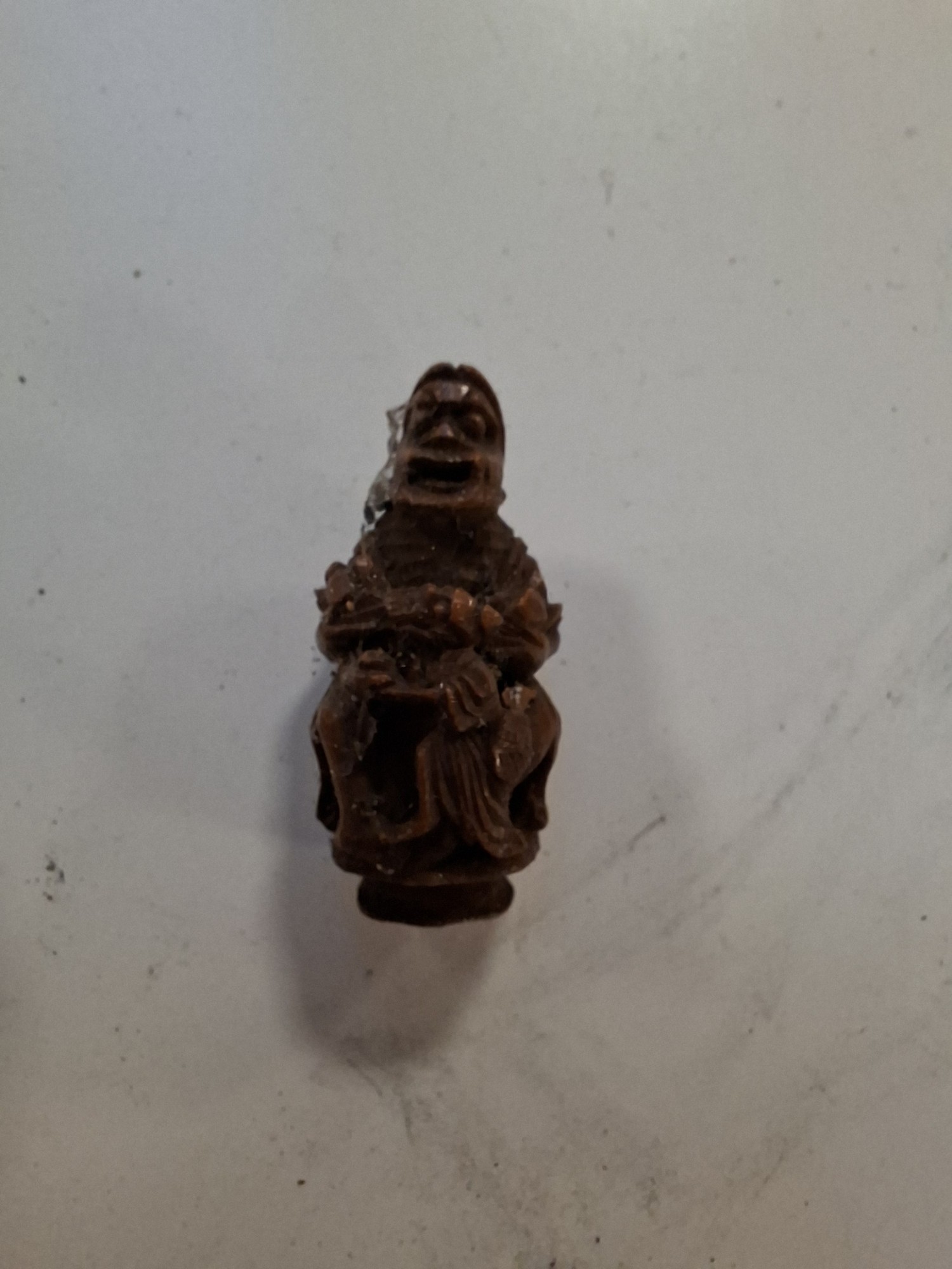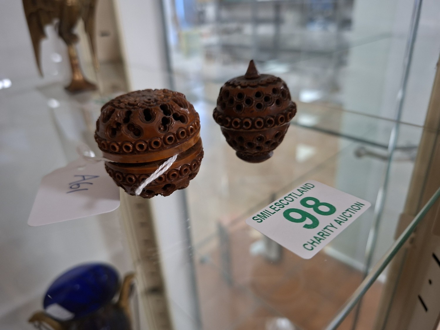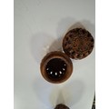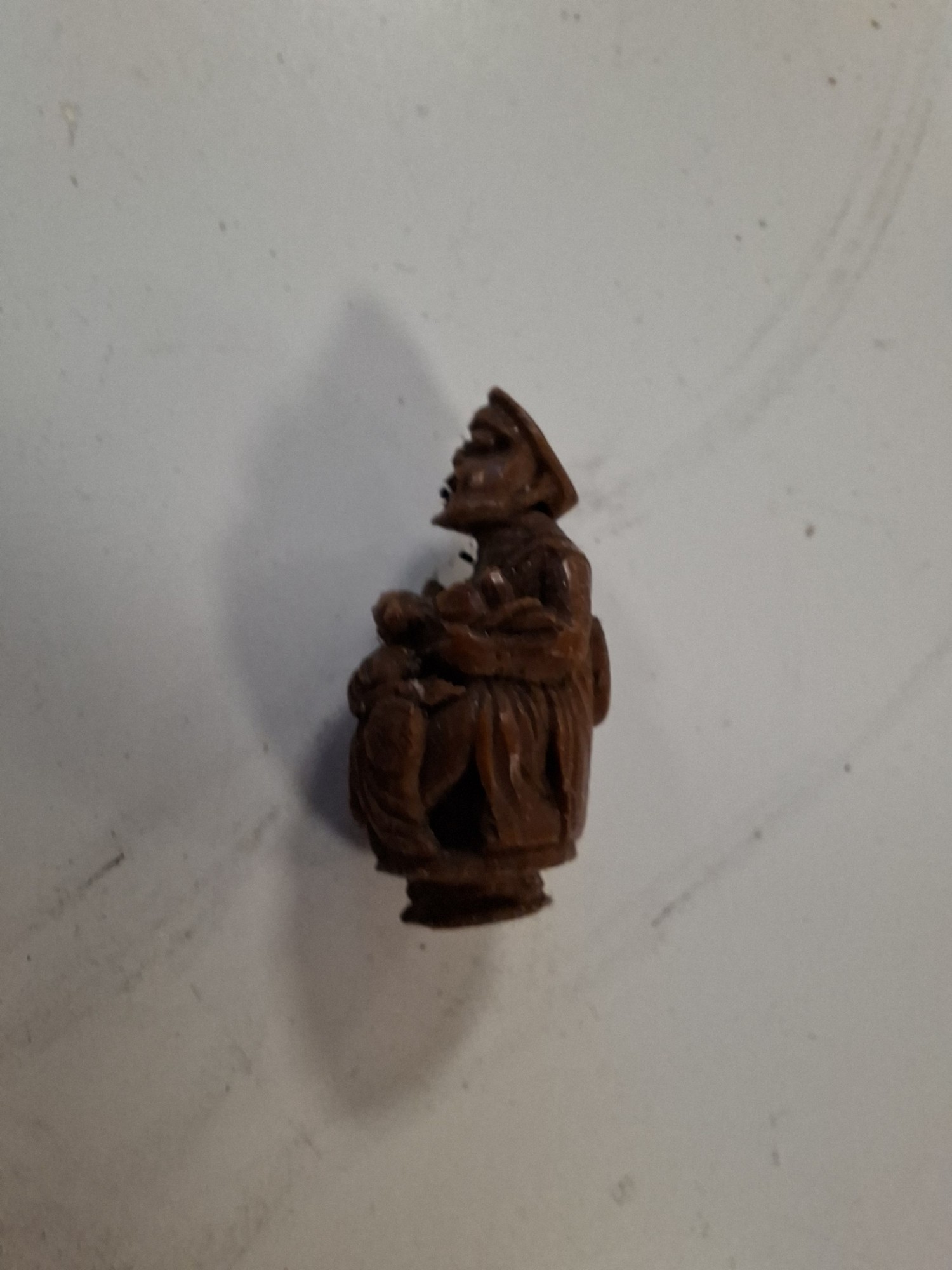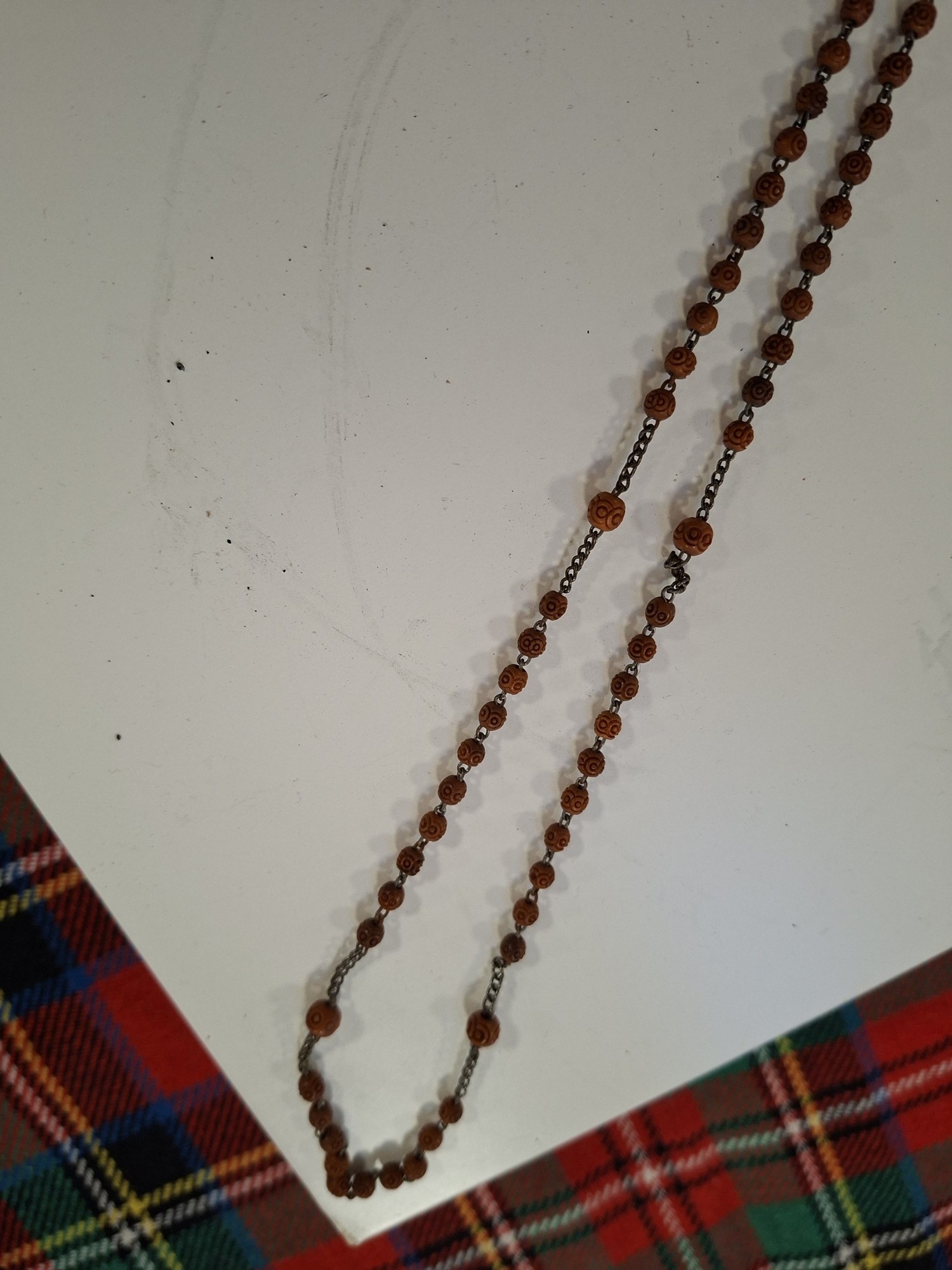 Vintage hand carved egg shaped rosary beads and case, plus antique hand carved Coquilla Nut thimble or needle holder