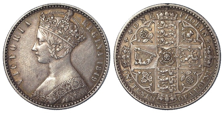 Florin 1849 "godless" gothic, WW near obliterated, ESC 2816, toned GVF-nEF, tiny edge nick.