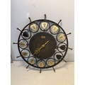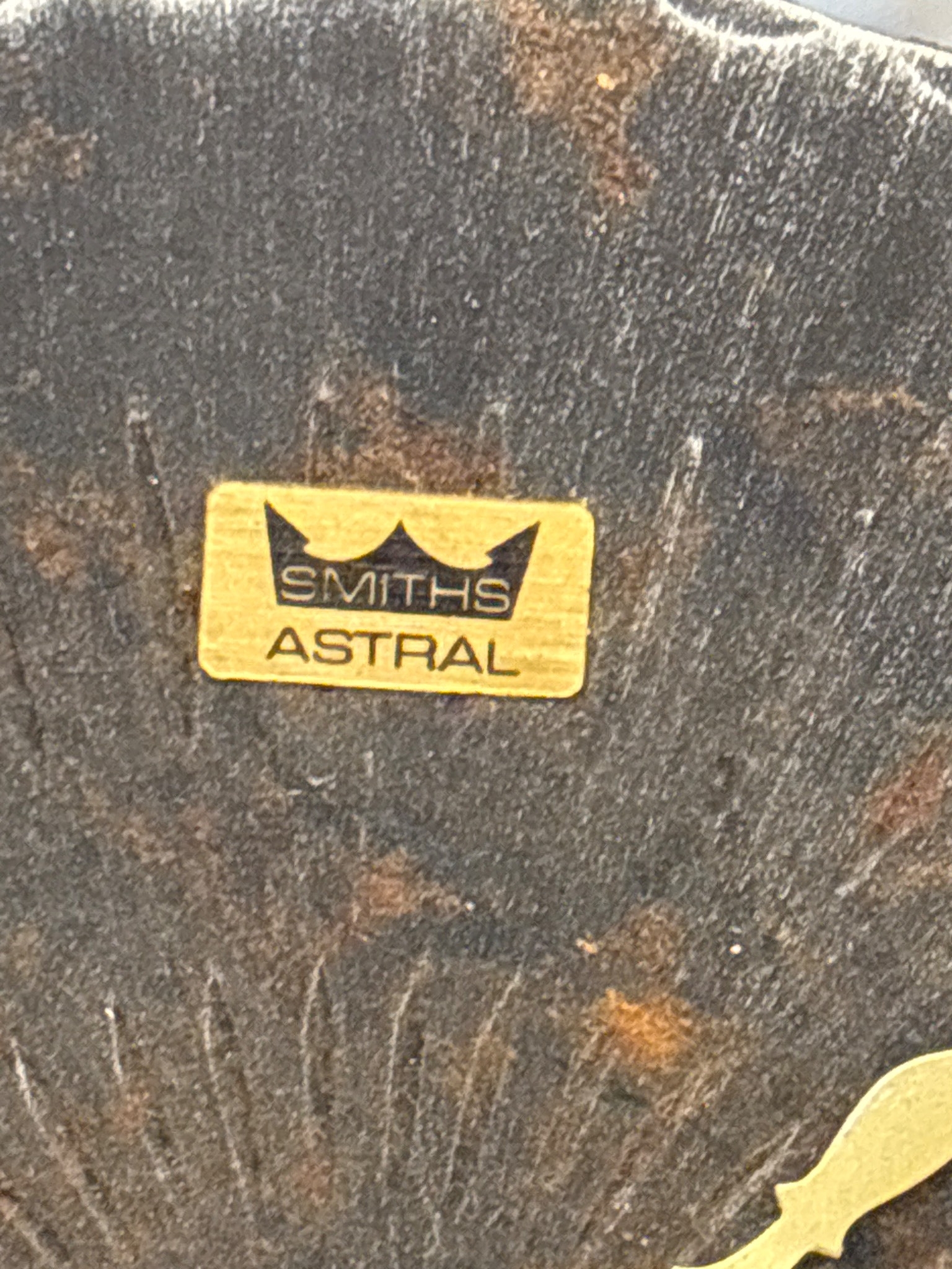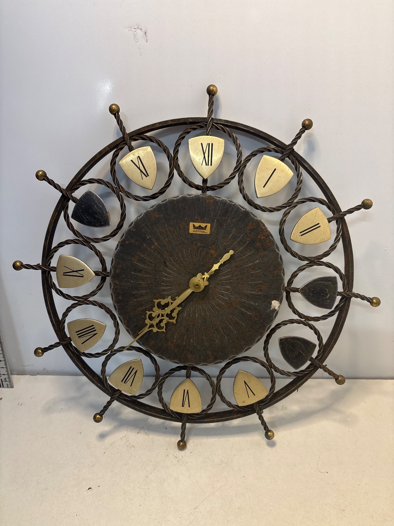 Smiths Astral wall clock featuring a wrought iron frame, Roman numeral markers, and decorative hands. Shows wear consistent with age.