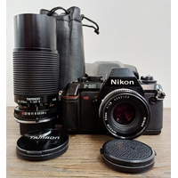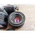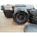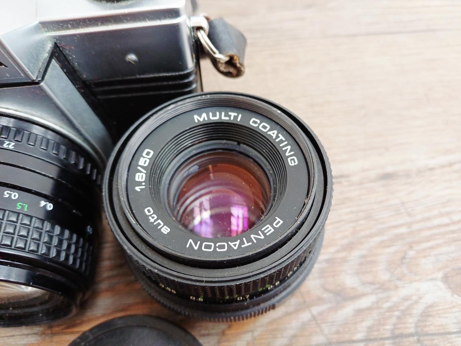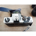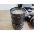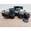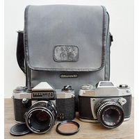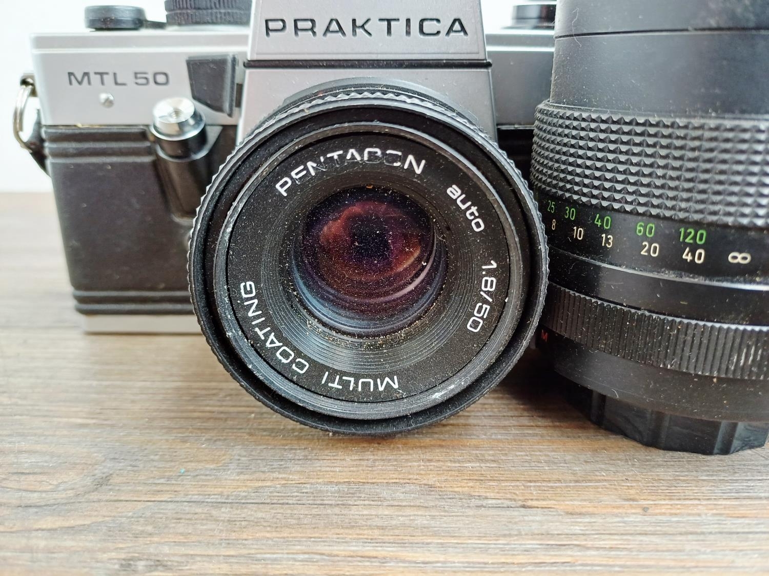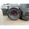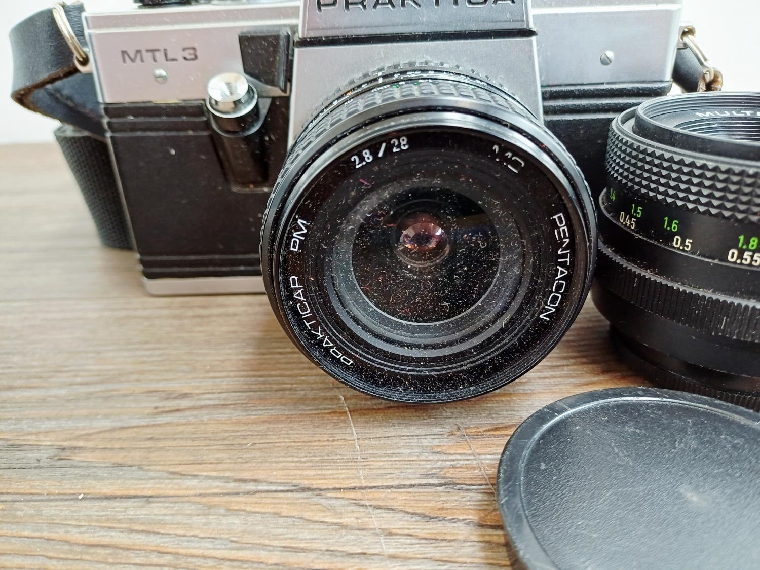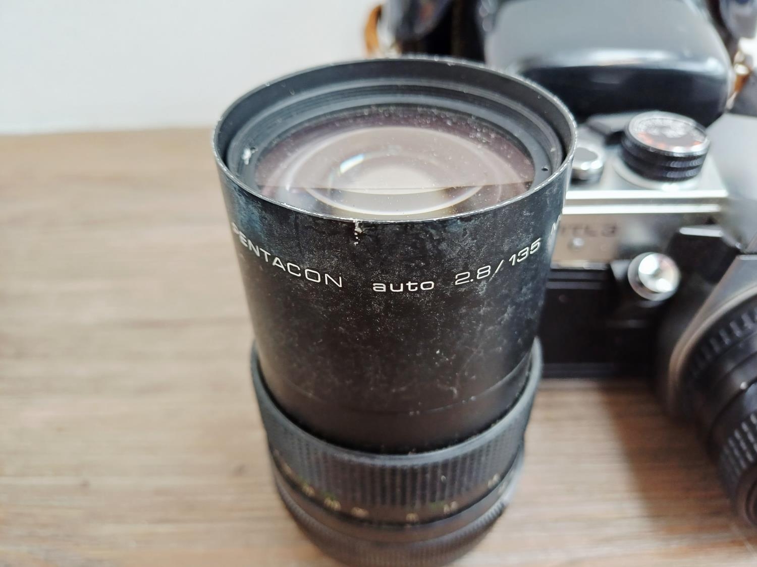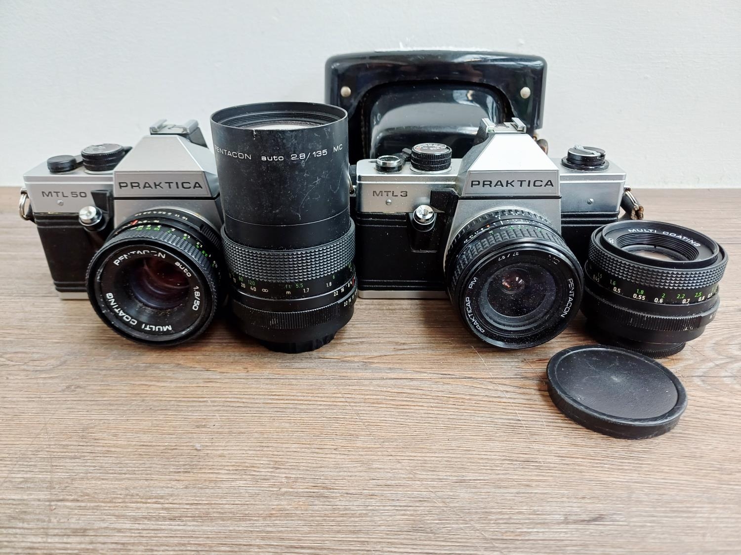 Two Pentacon Praktica M42-mount 35mm SLR cameras, one MTL50 fitted with auto 1:1.8 50mm lens with MC auto 1:2.8 135mm lens and one cased MTL3 fitted with PM MC 1:2.8 28mm lens with auto 1:1.8 50mm lens