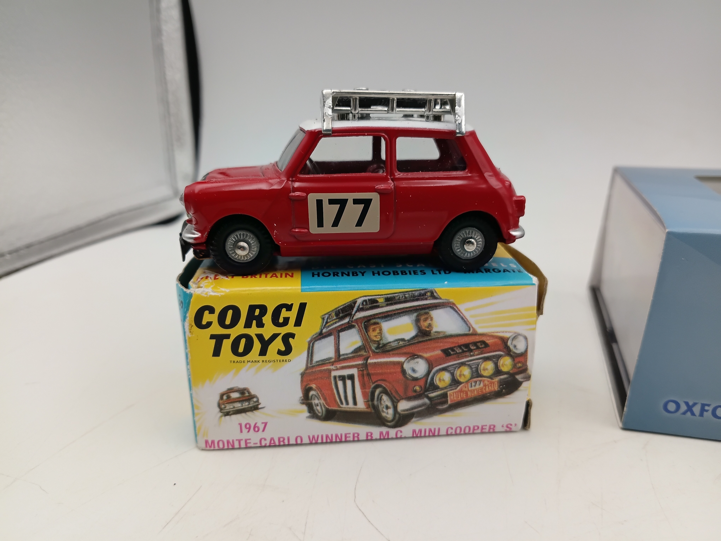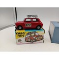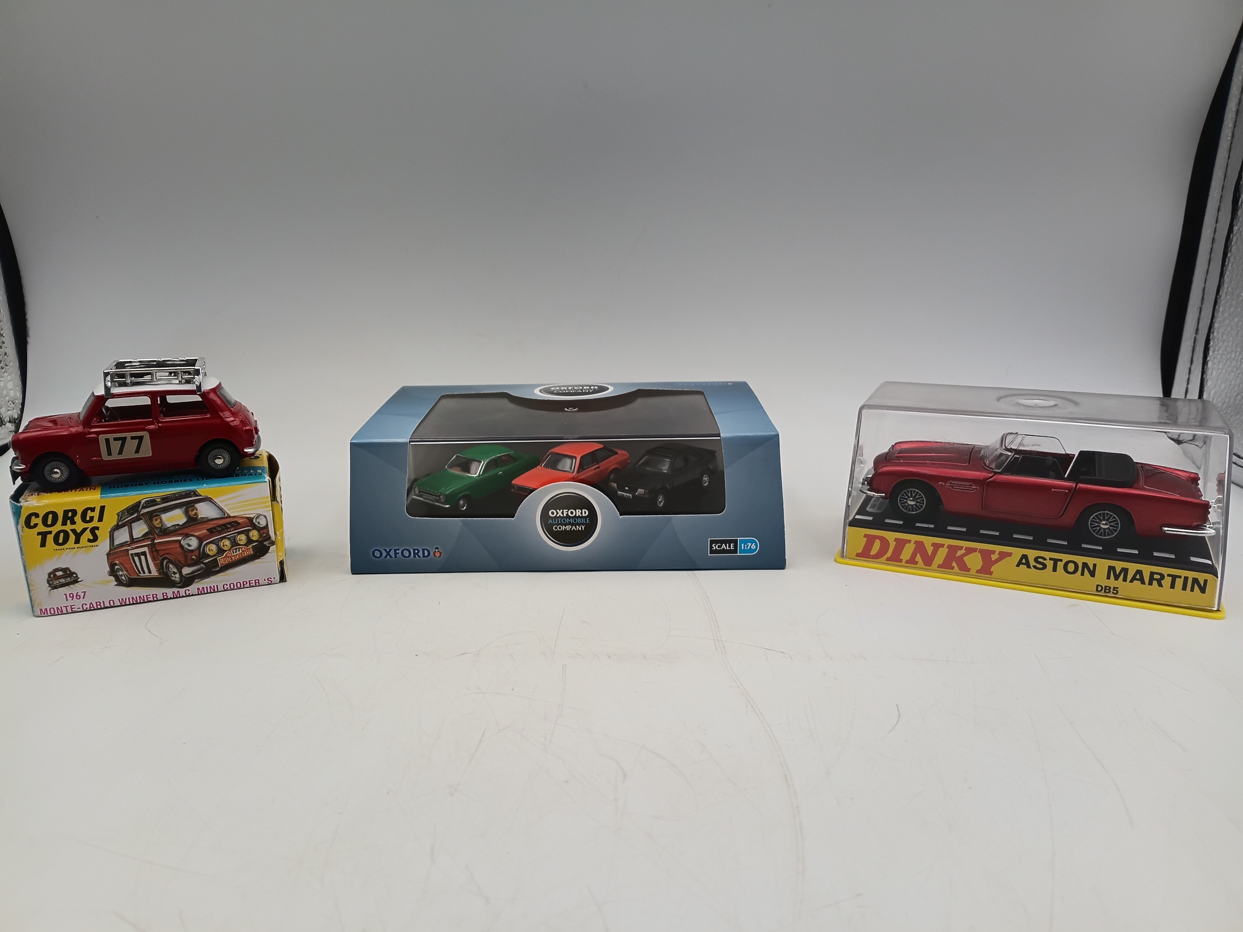A collection of 3 toy cars, to include; corgi mini cooper s, dinky Aston Martin db5 and a Oxford automobile scale 1.76 toy car set.