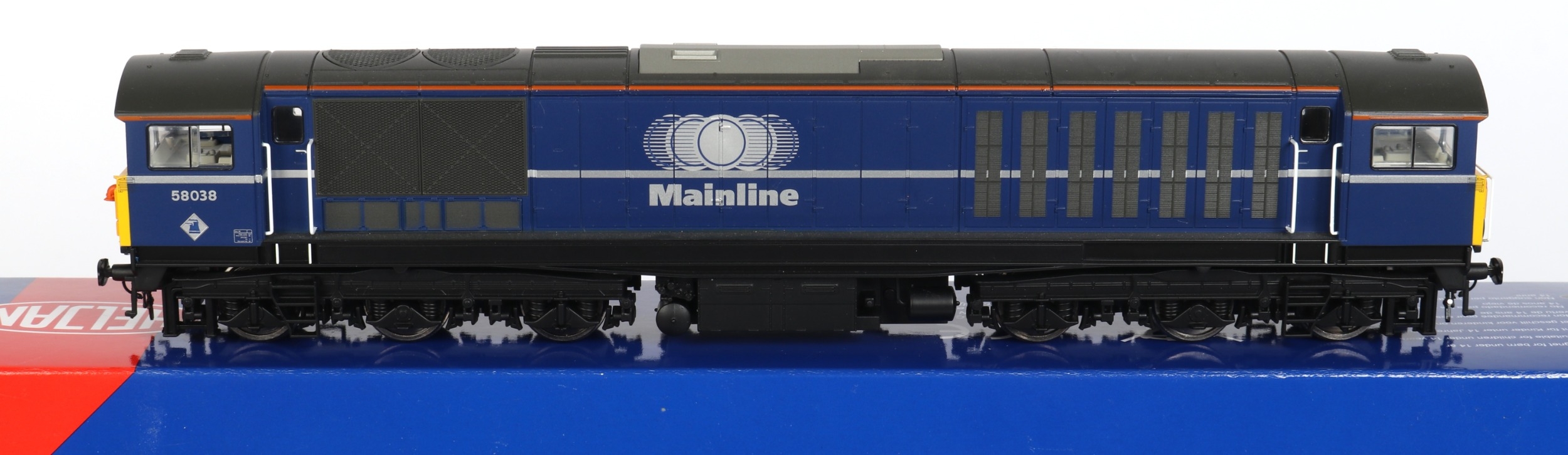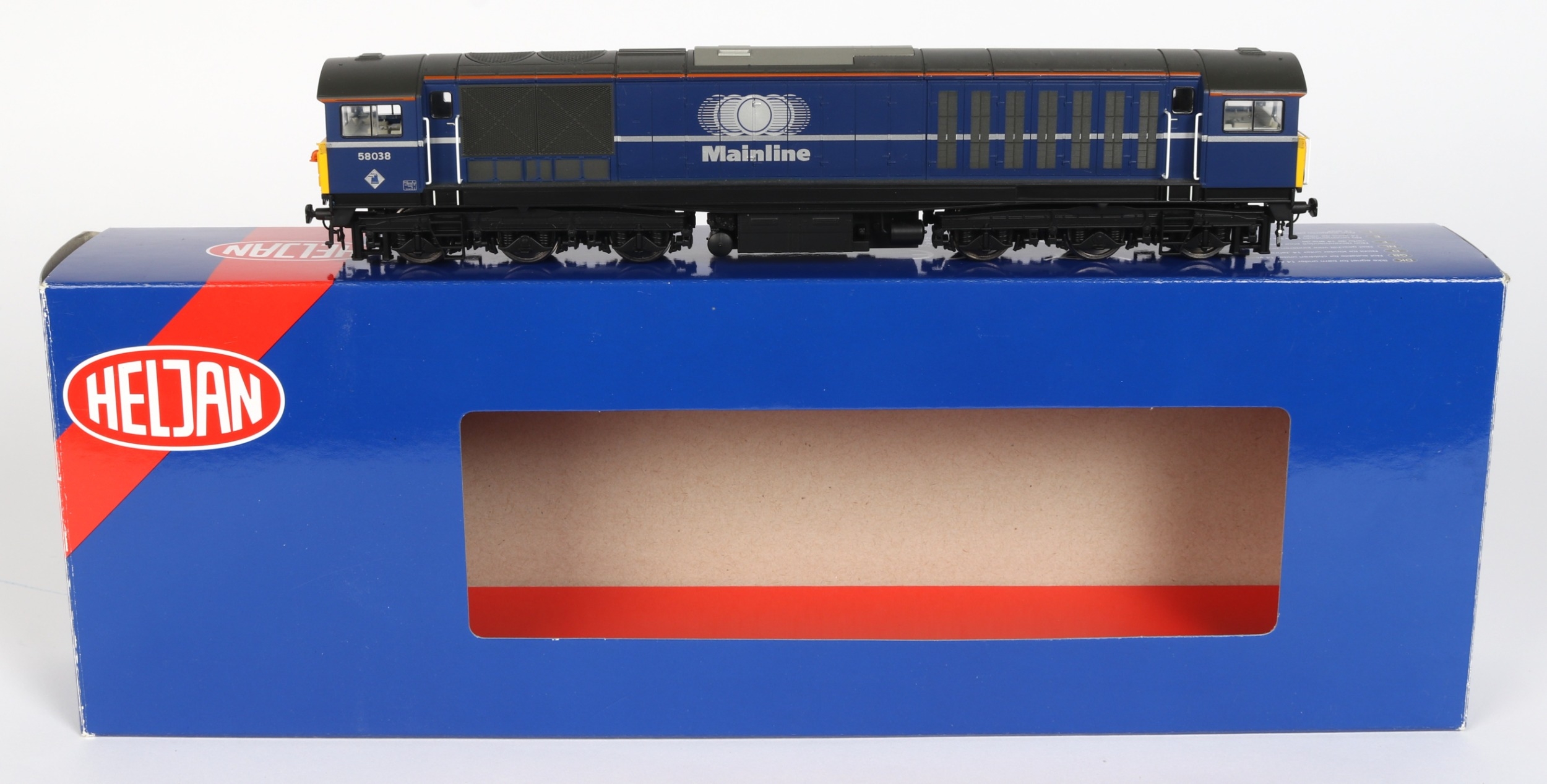 A Heljan OO gauge Mainline class 58 Co-Co Diesel Locomotive (5825). 58038 in silver lined dark blue livery. Boxed with packing and paperwork. Contents Mint. £70-90