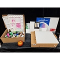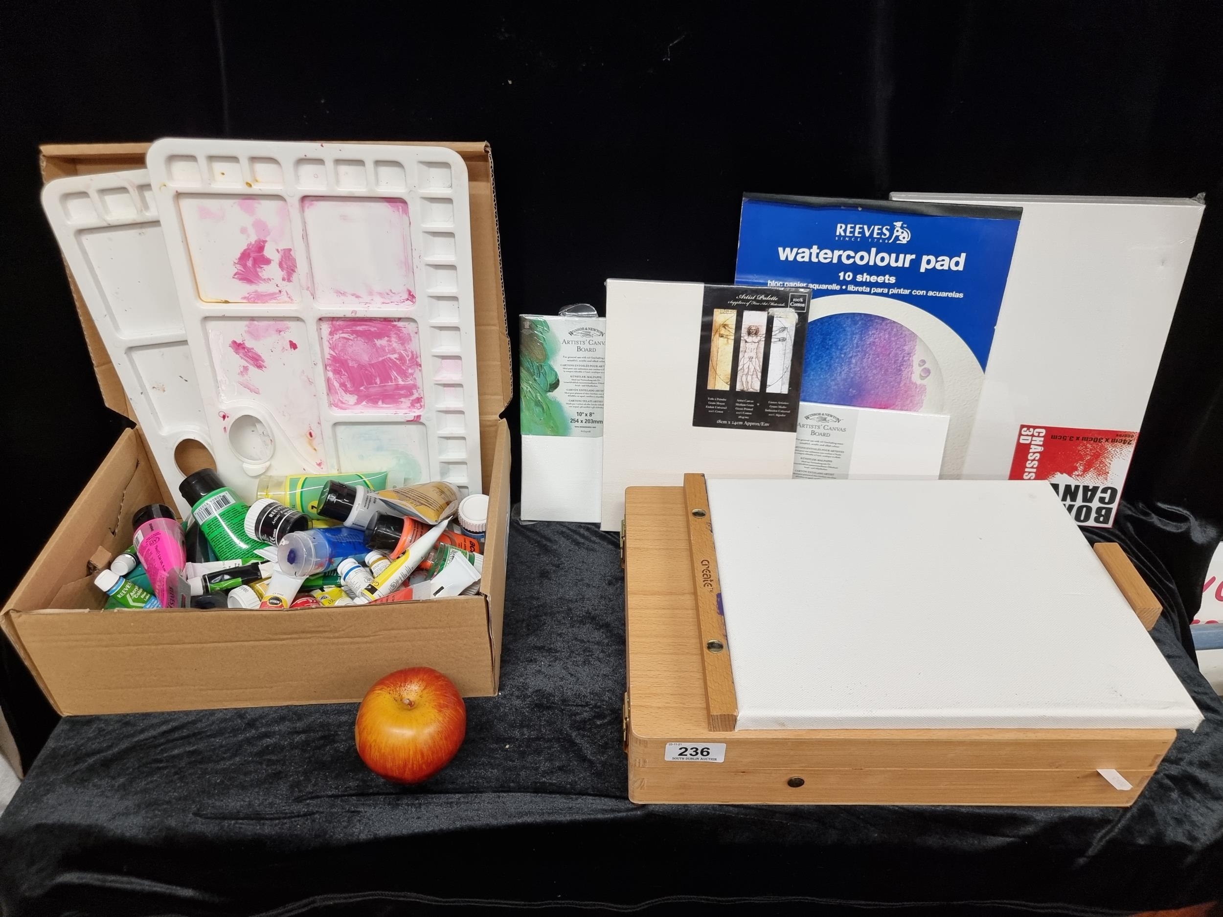 Eight painting related materials. Including a wooden paint box/ adjustable easel, an assortment of branded paints and two artists palettes etc. Great artist lot.