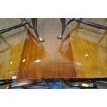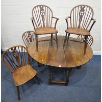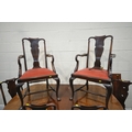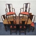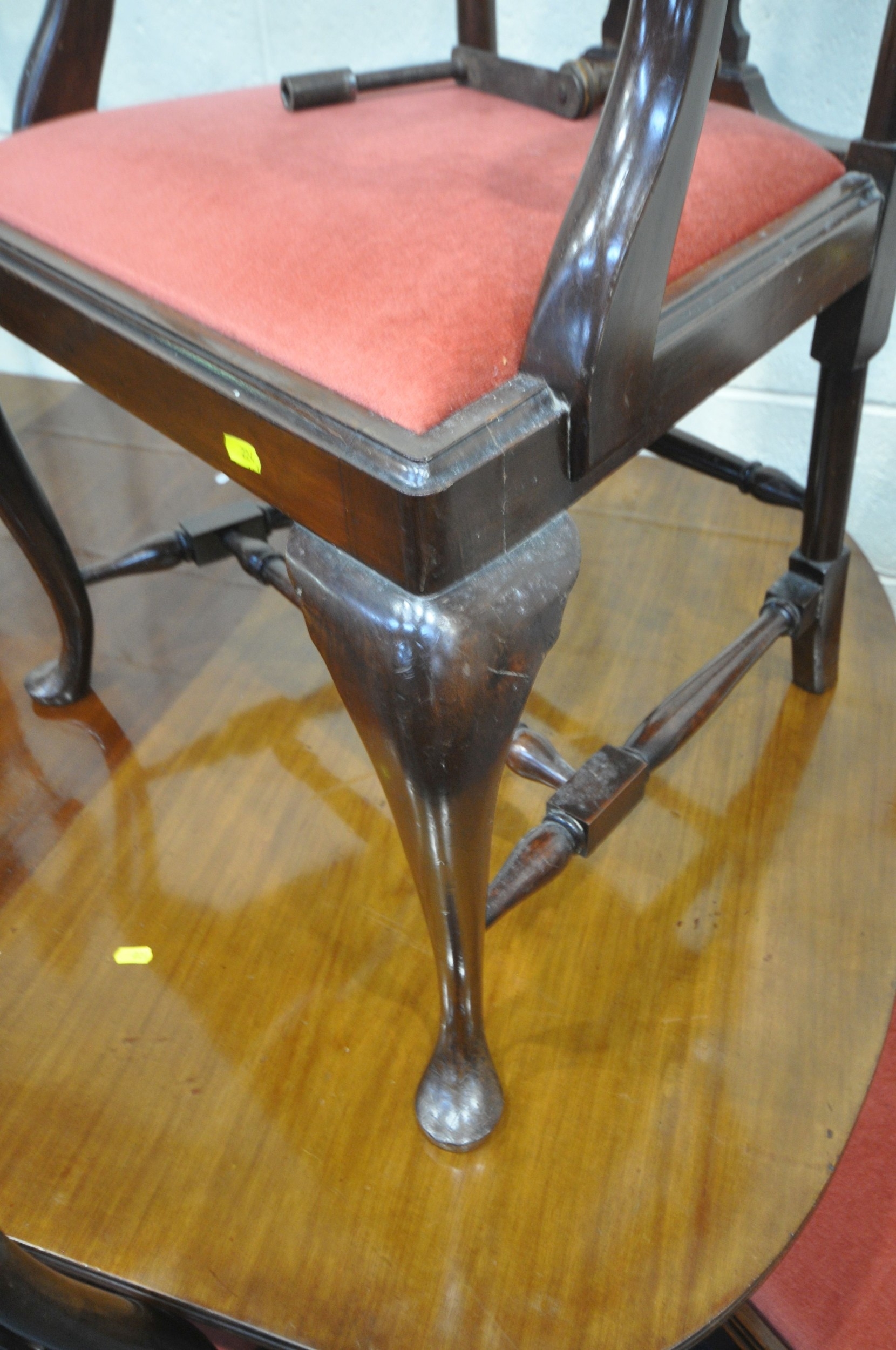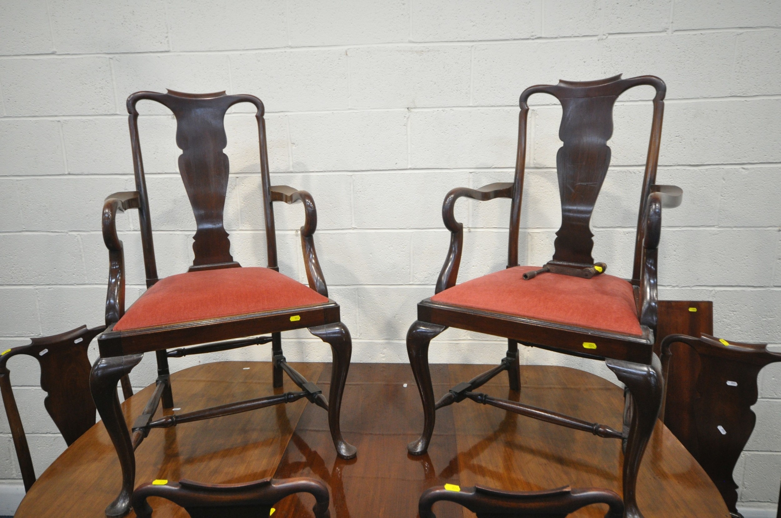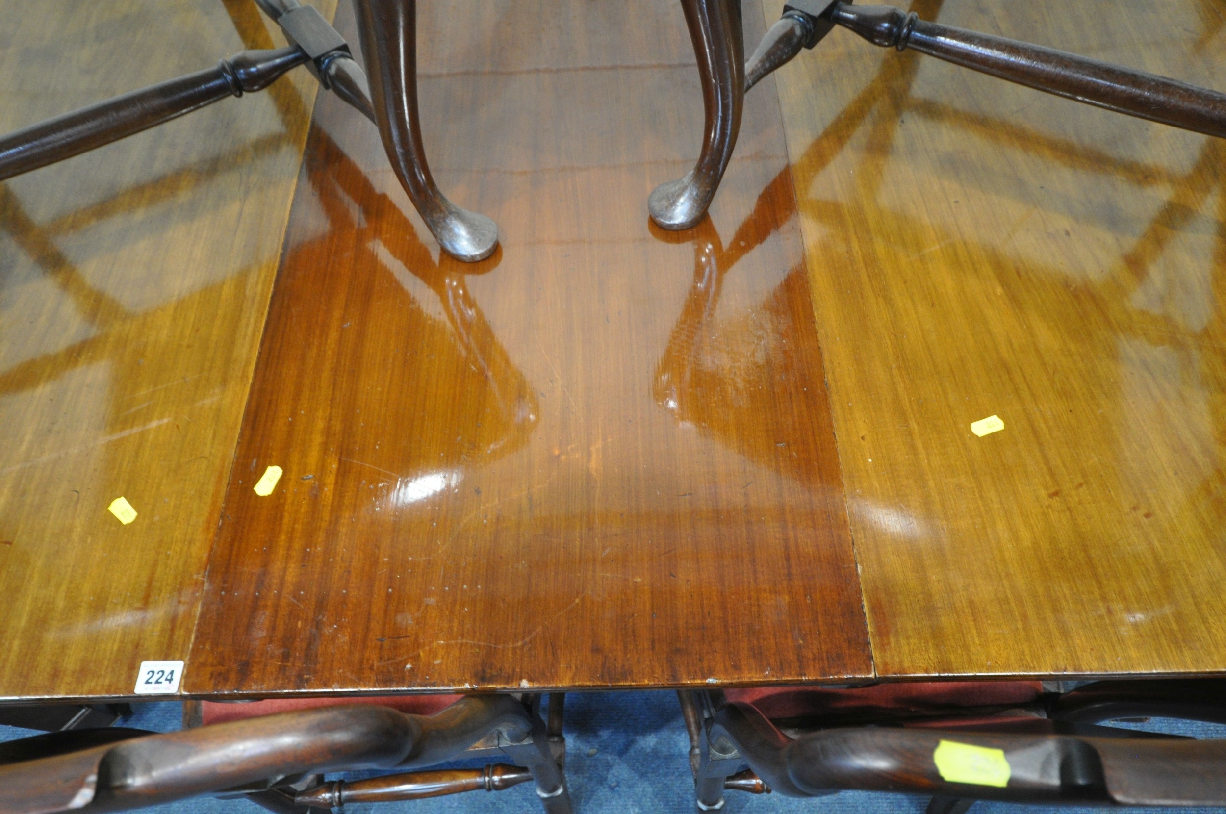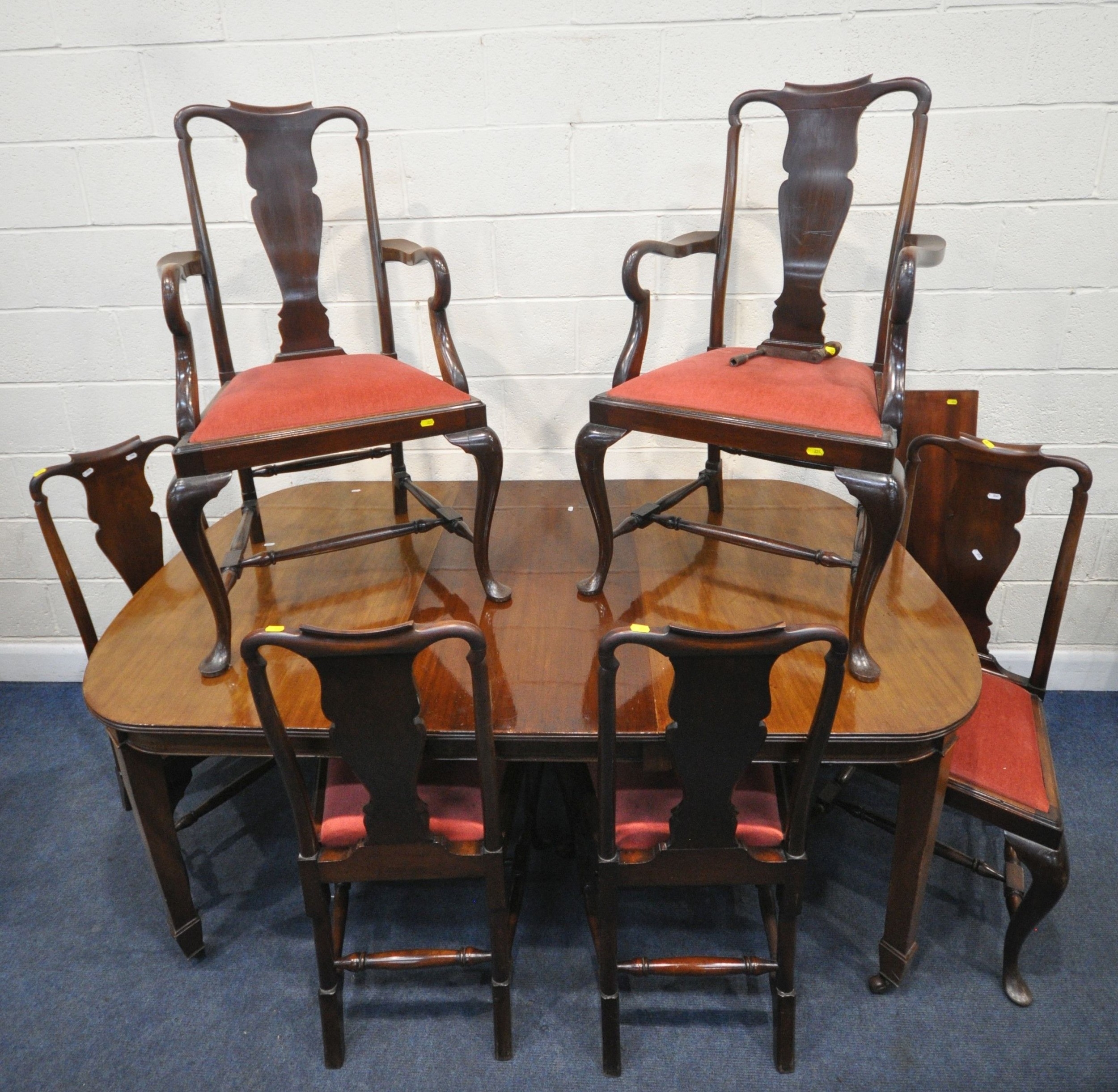 AN EDWARDIAN MAHOGANY WIND OUT DINING TABLE, with two additional leaves, raised on square tapered legs, with castors, extended length 204cm x closed length 131cm x depth 106cm x height 75cm, along with a set of six splat back chairs, including two carvers, condition report: one winding handle, marks, scuffs, discolouration, doesn't fully close, previous restoration, other wear and usage (10)