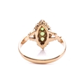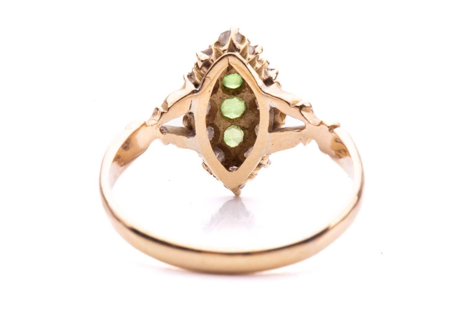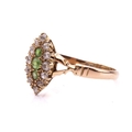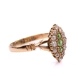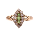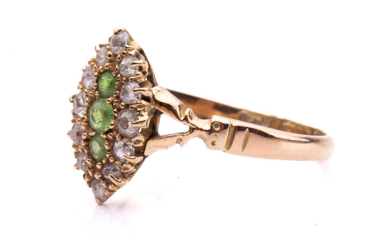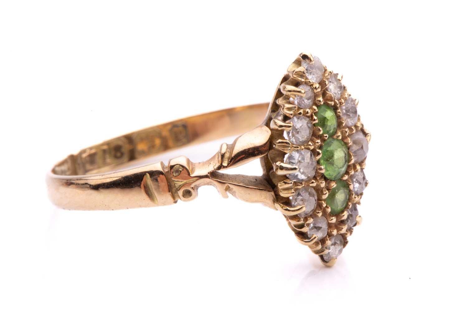 A Victorian demantoid garnet and diamond ring, the marquise shape cluster set with demantoid garnets and old cut diamonds, to split scrolling shoulders leading to the shank with hallmarks for 18ct gold, Birmingham, 1898, ring size N 1/2. Total weight 2.5g.