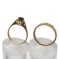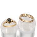 18ct and 10k gold rings, the 18ct set with a single sapphire in a flower head, size P, weight 2.7 grams; together with a gold stamped 10k band set with three diamonds, size P, weight 2.8 grams.