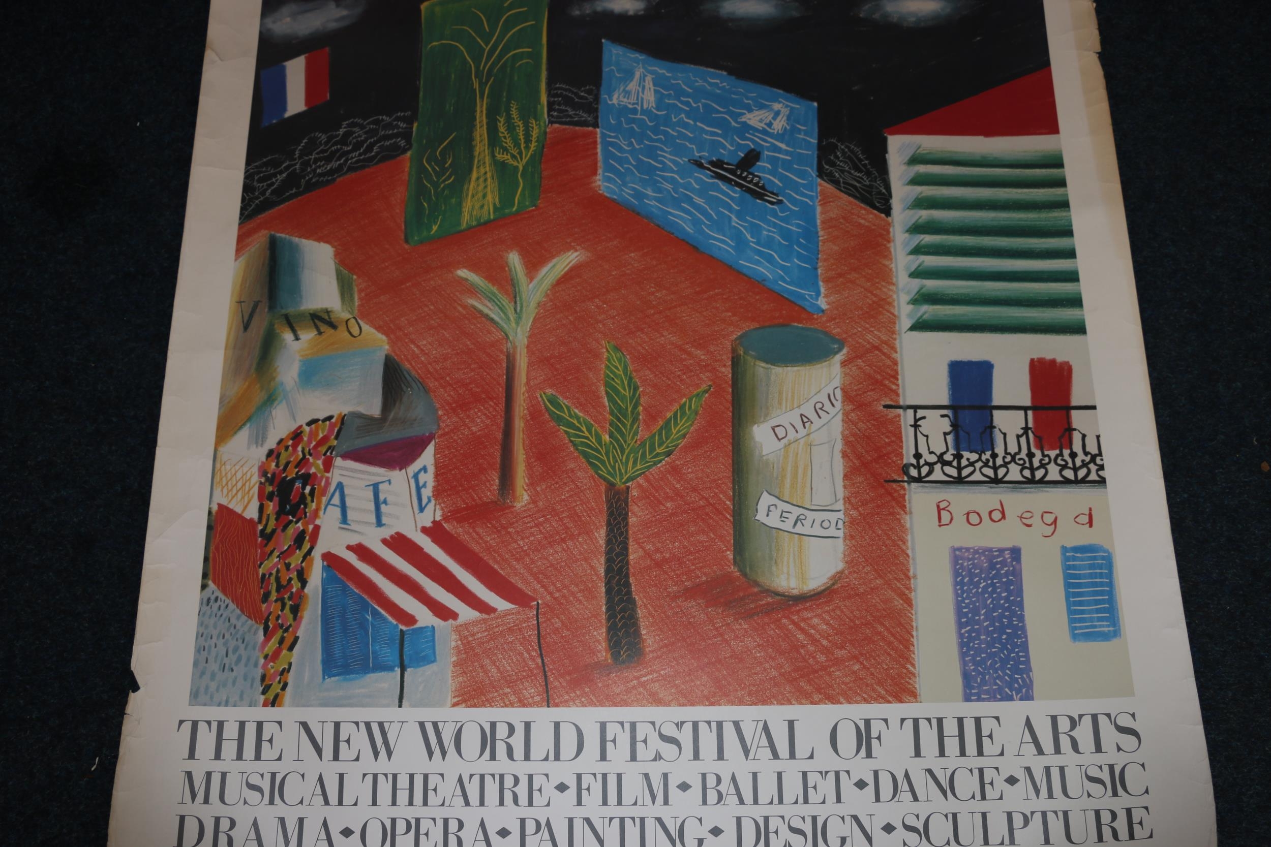 Two 'The New World Festival of Arts' exhibition posters 1980, David Hockney "The Zanzibar with postcards and Kiosk", 95cm x 91cm and another. (3)