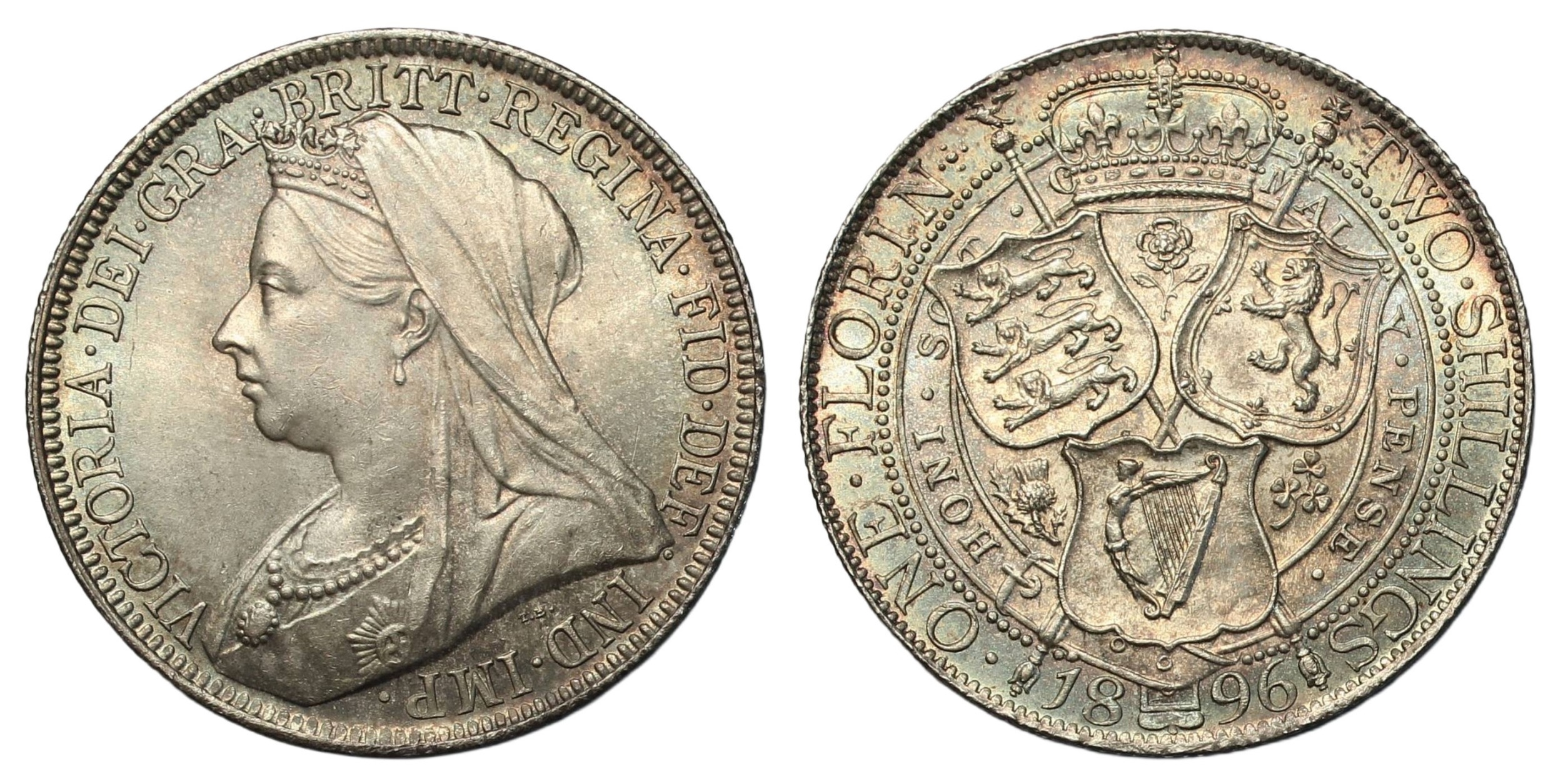 Victoria (1837-1901) Florin, 1896 Old veiled bust left, rev. three shields within garter, date below, (SCBC 3939, ESC.880, Bull 2966). Beautifully toned, mint state