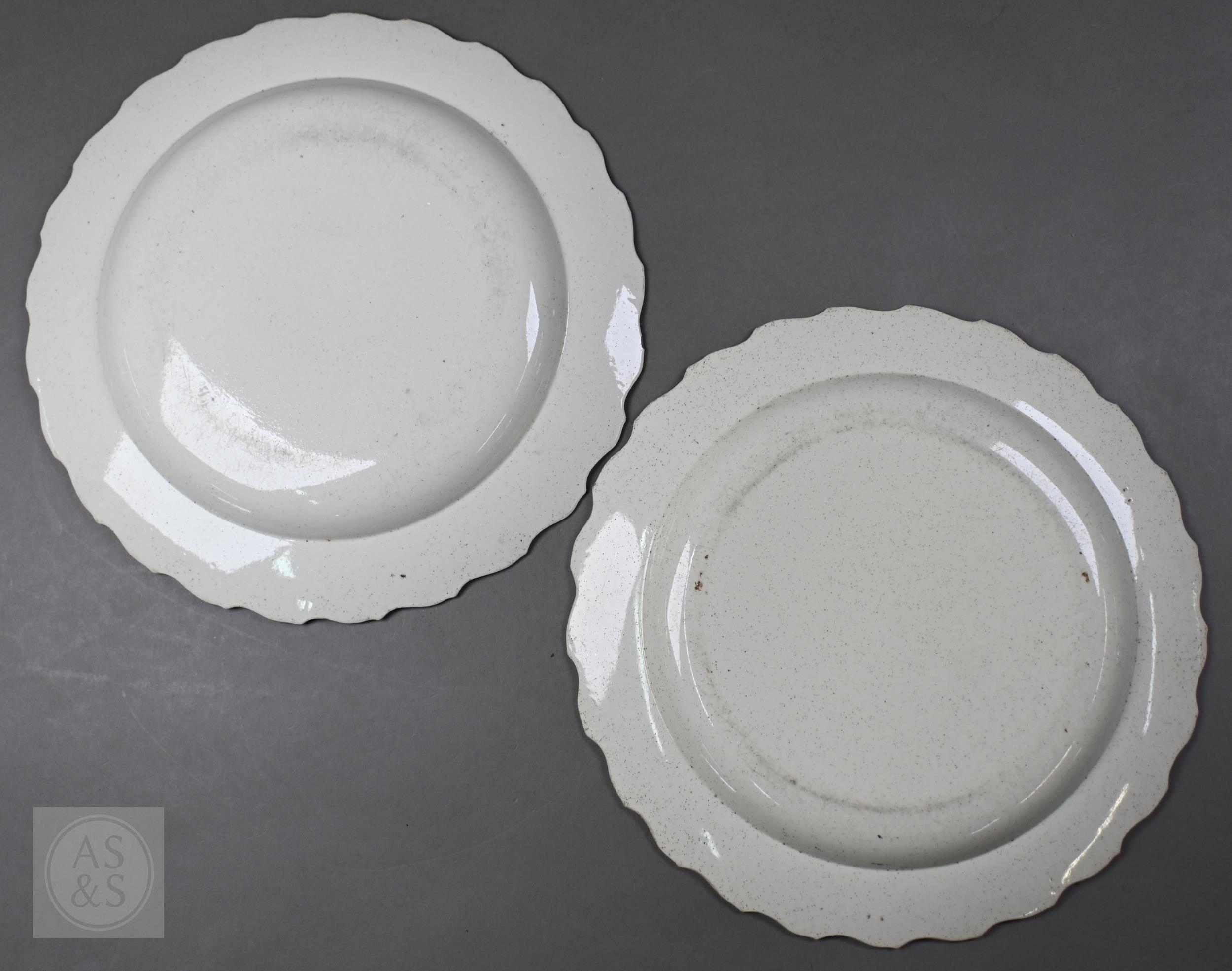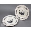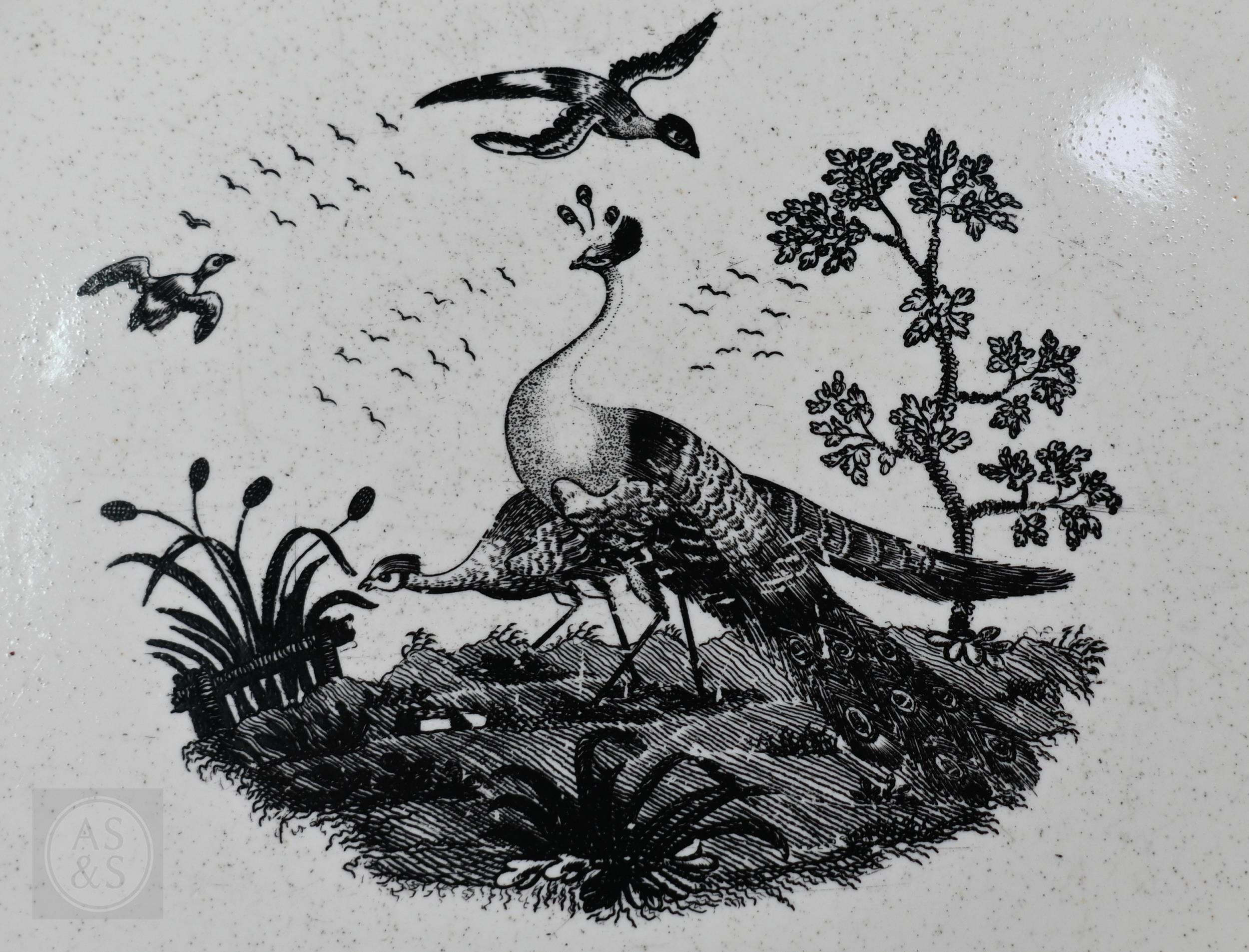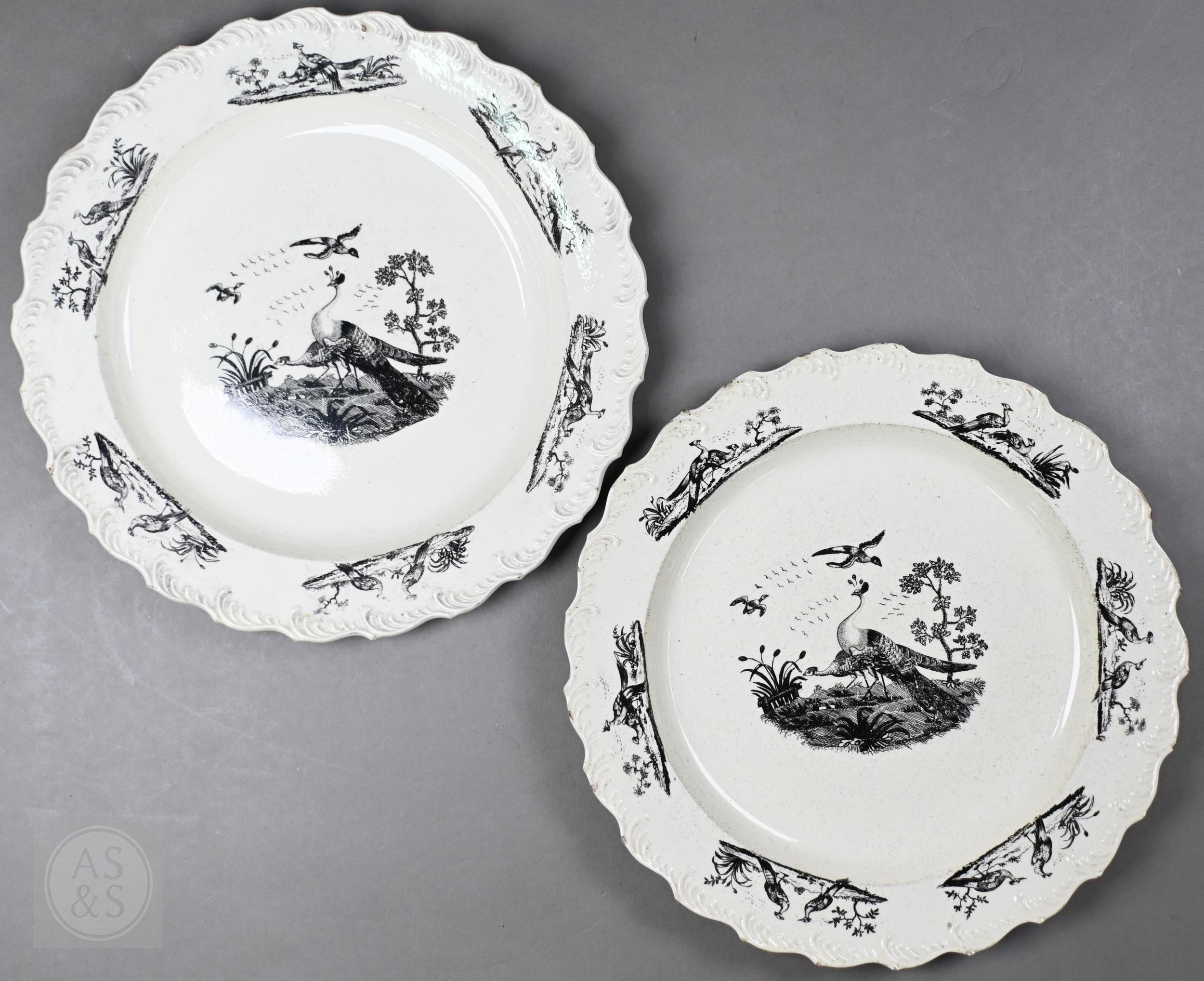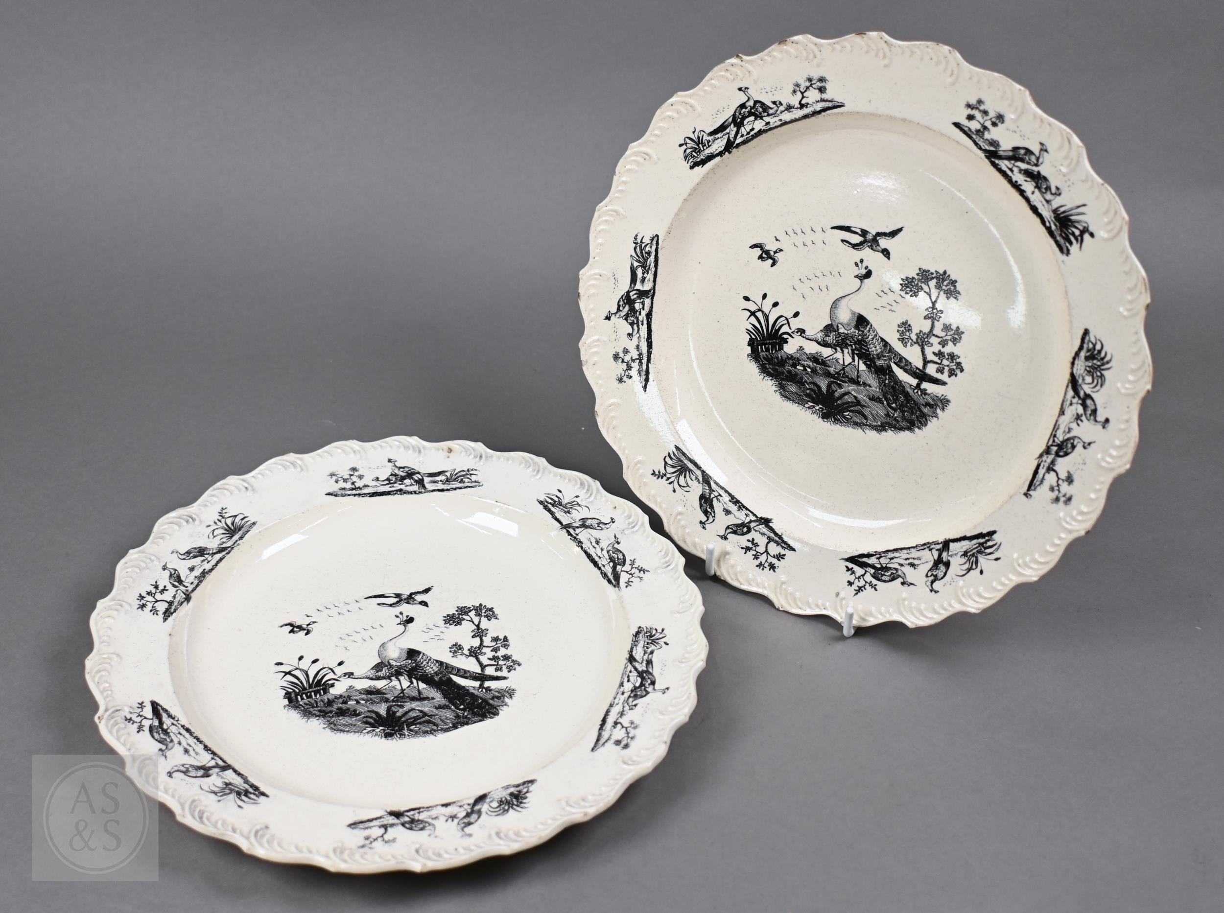 A pair of 18th century Wedgwood creamware plates, transfer-printed with 'Liverpool Birds', 25 cm diameter, to/w two early 19th century (possibly Ridgway) blue and white lozenge dishes, printed with 'Eastern Port' pattern (4)