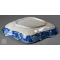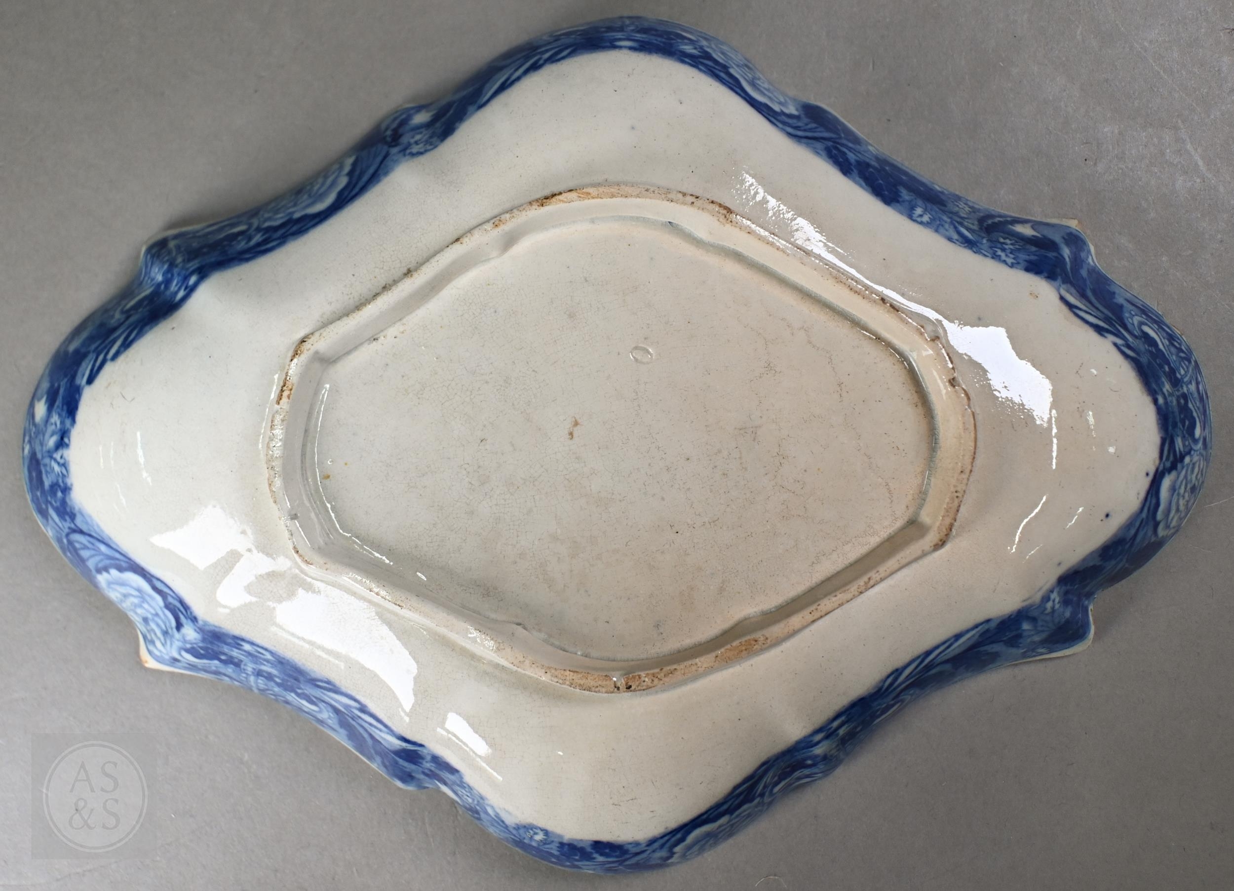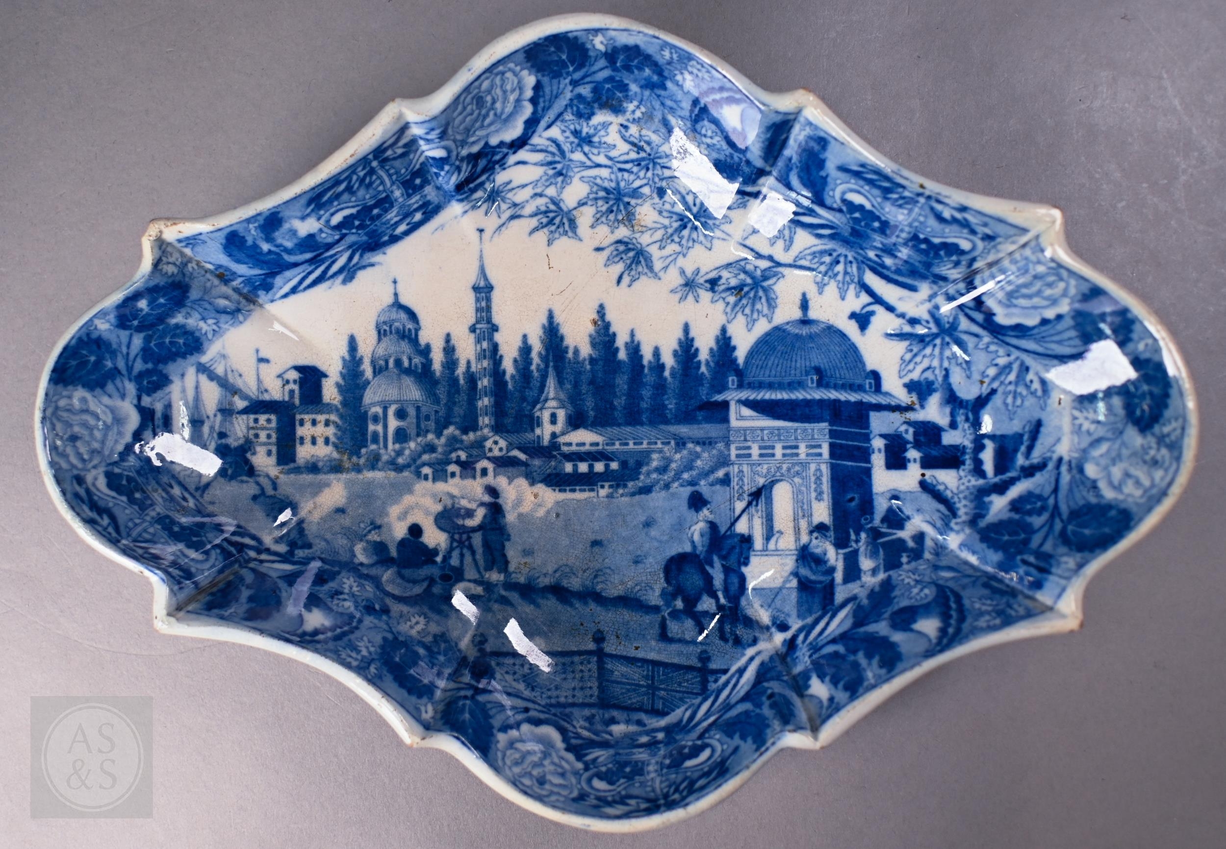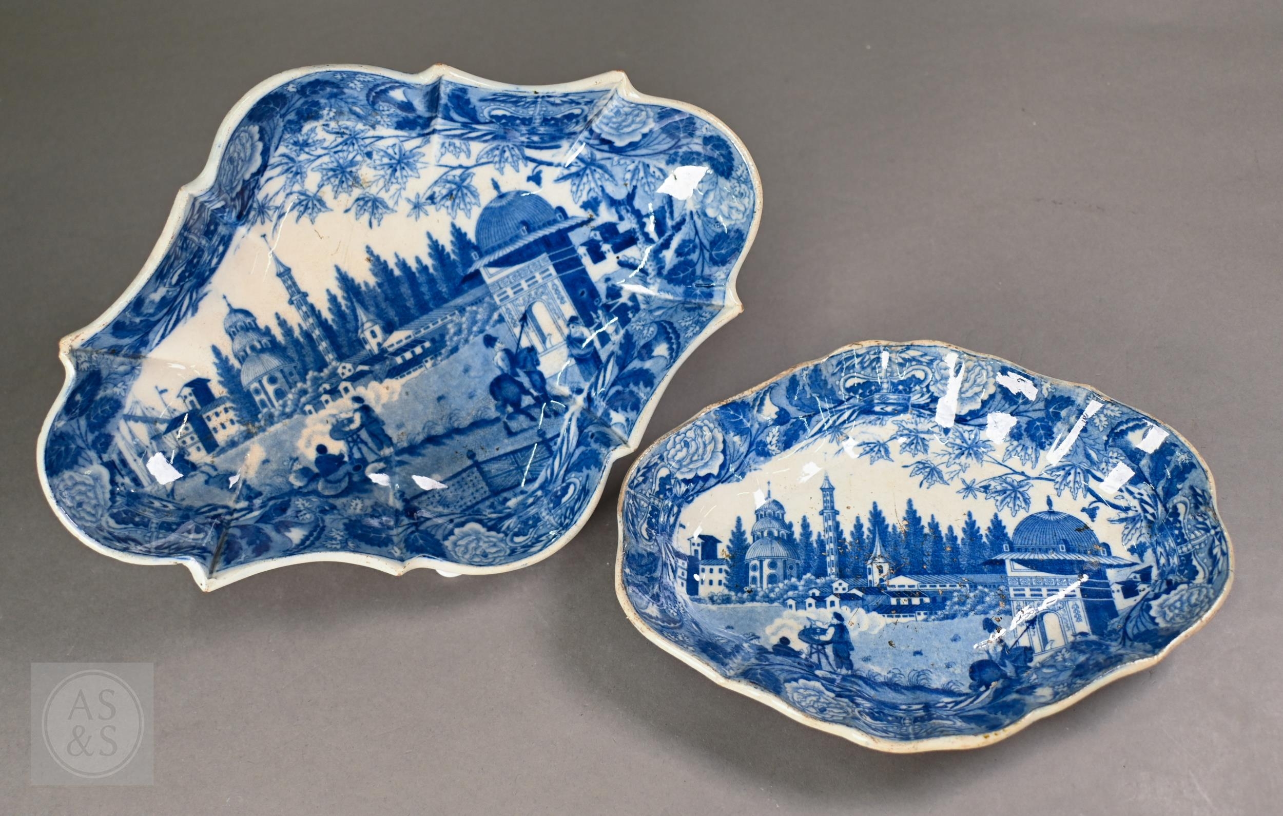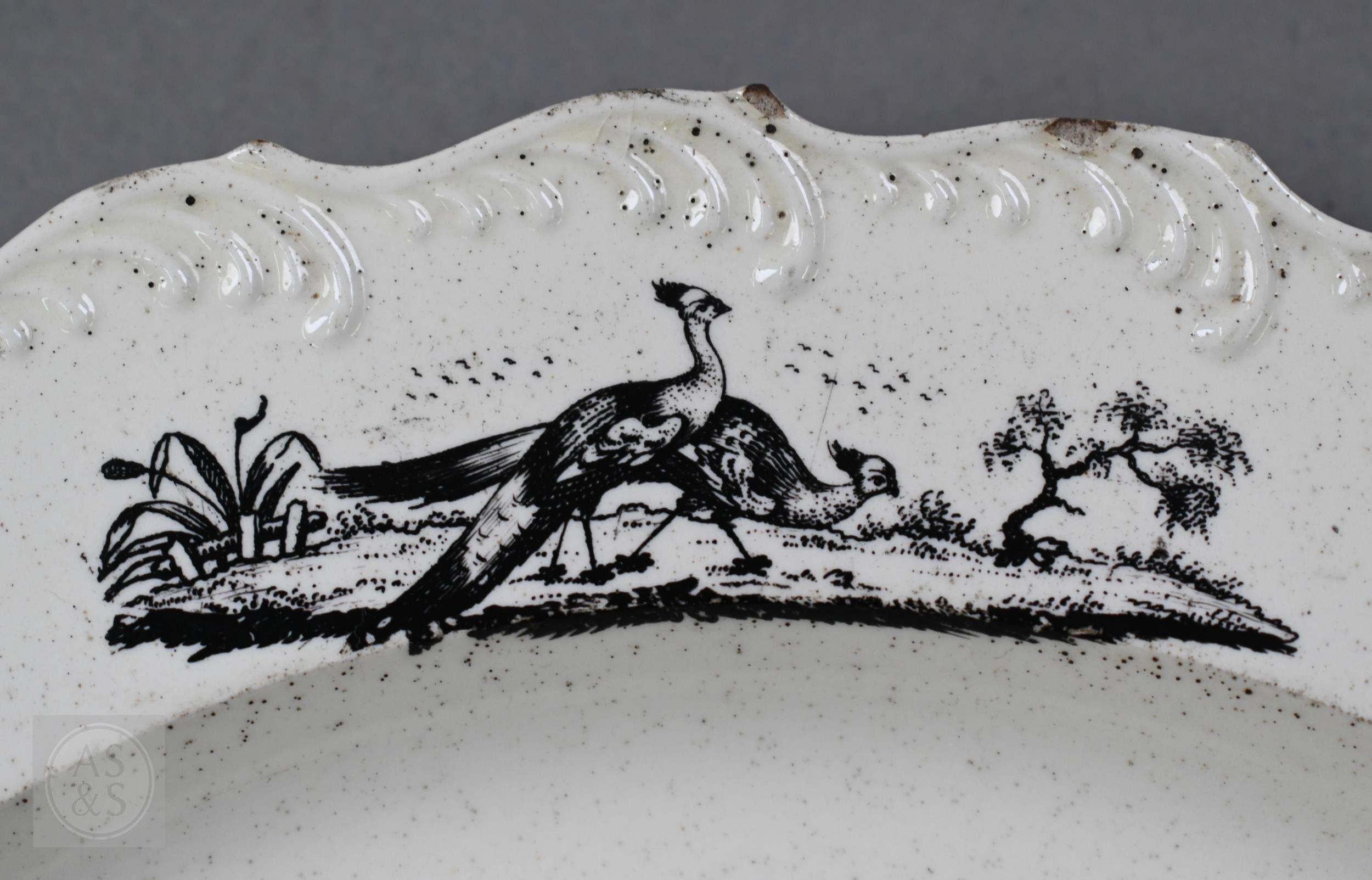 A pair of 18th century Wedgwood creamware plates, transfer-printed with 'Liverpool Birds', 25 cm diameter, to/w two early 19th century (possibly Ridgway) blue and white lozenge dishes, printed with 'Eastern Port' pattern (4)
