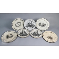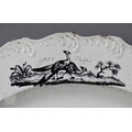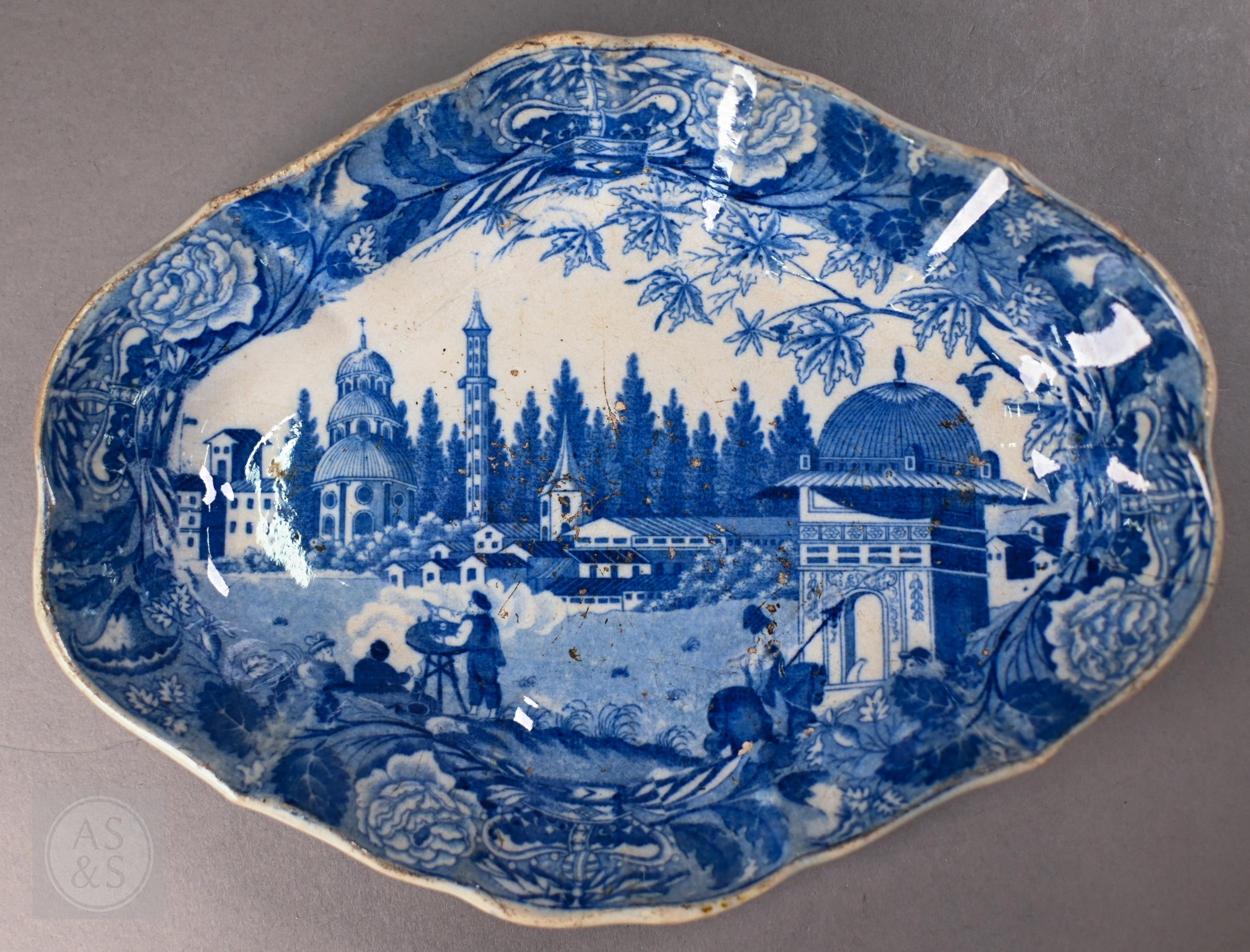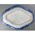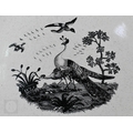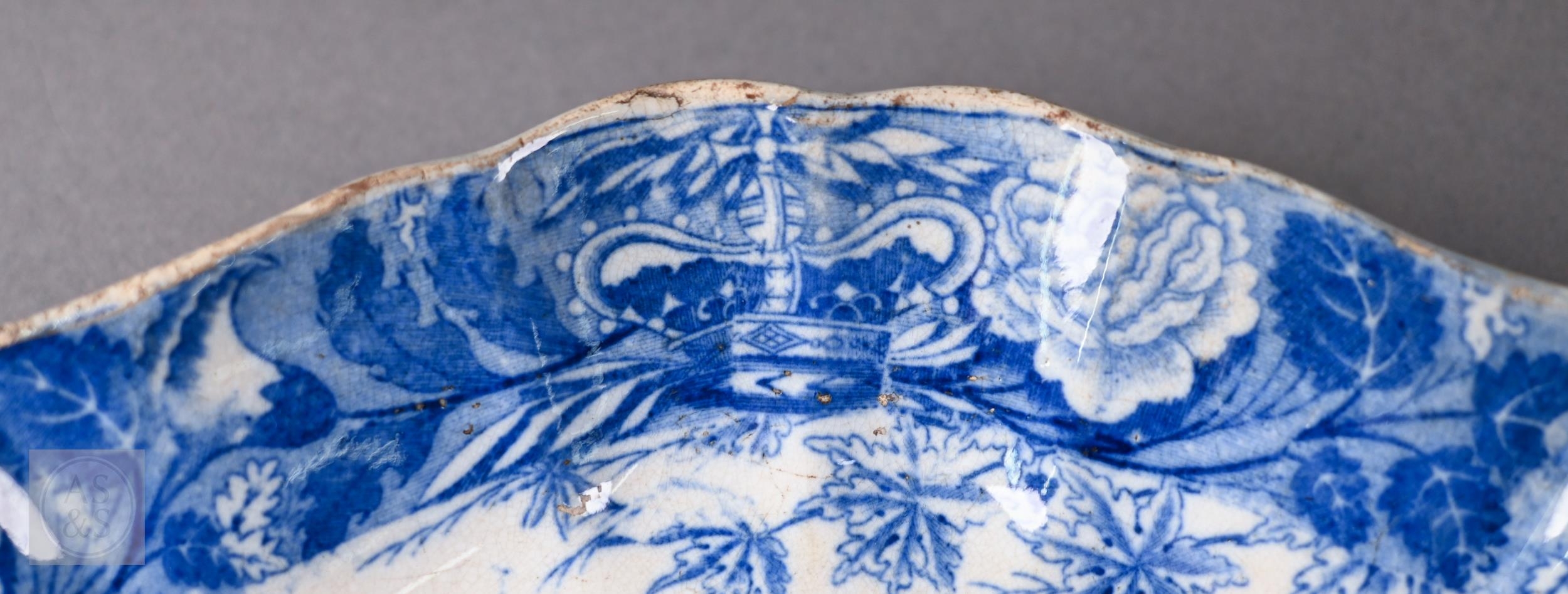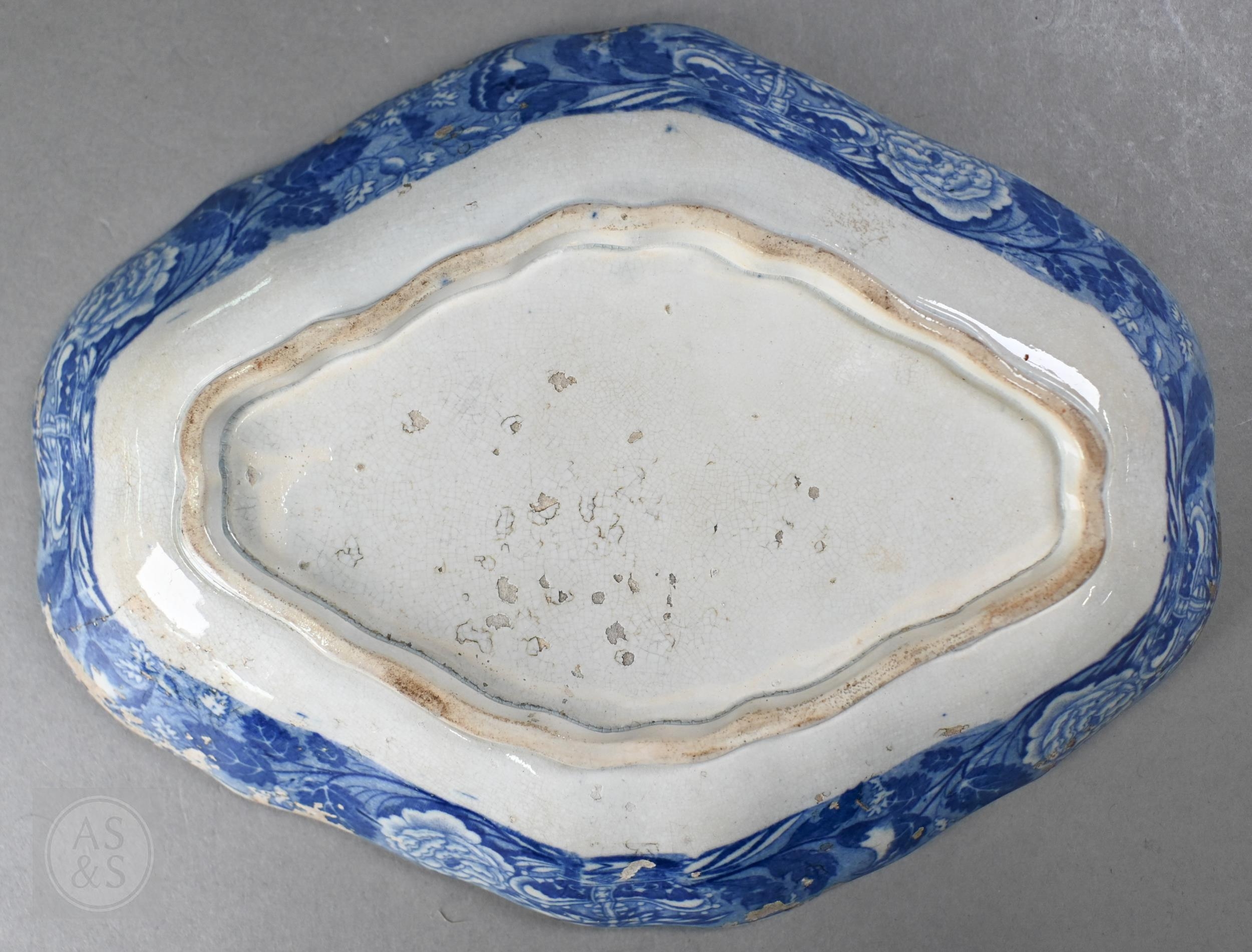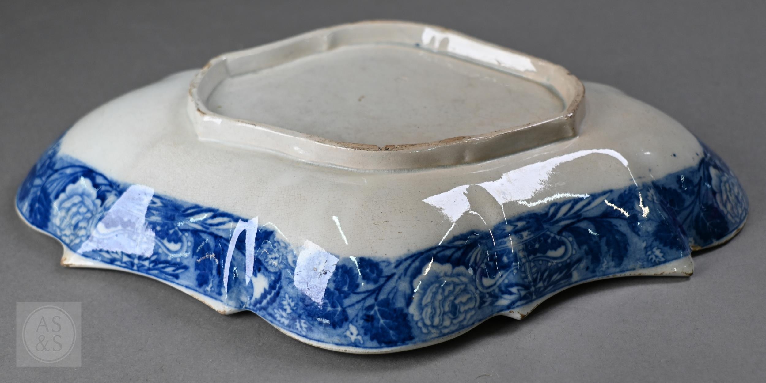 A pair of 18th century Wedgwood creamware plates, transfer-printed with 'Liverpool Birds', 25 cm diameter, to/w two early 19th century (possibly Ridgway) blue and white lozenge dishes, printed with 'Eastern Port' pattern (4)
