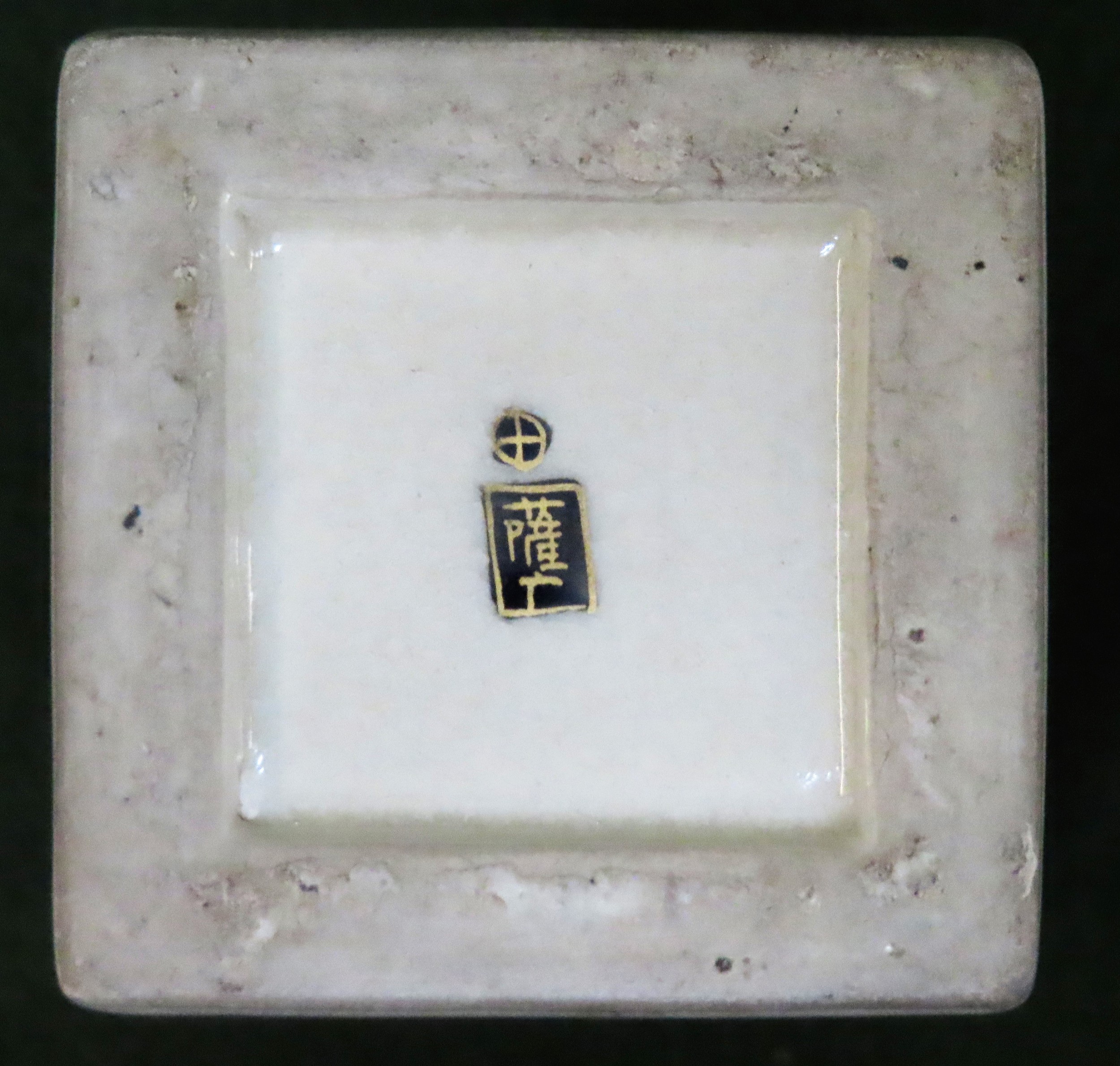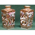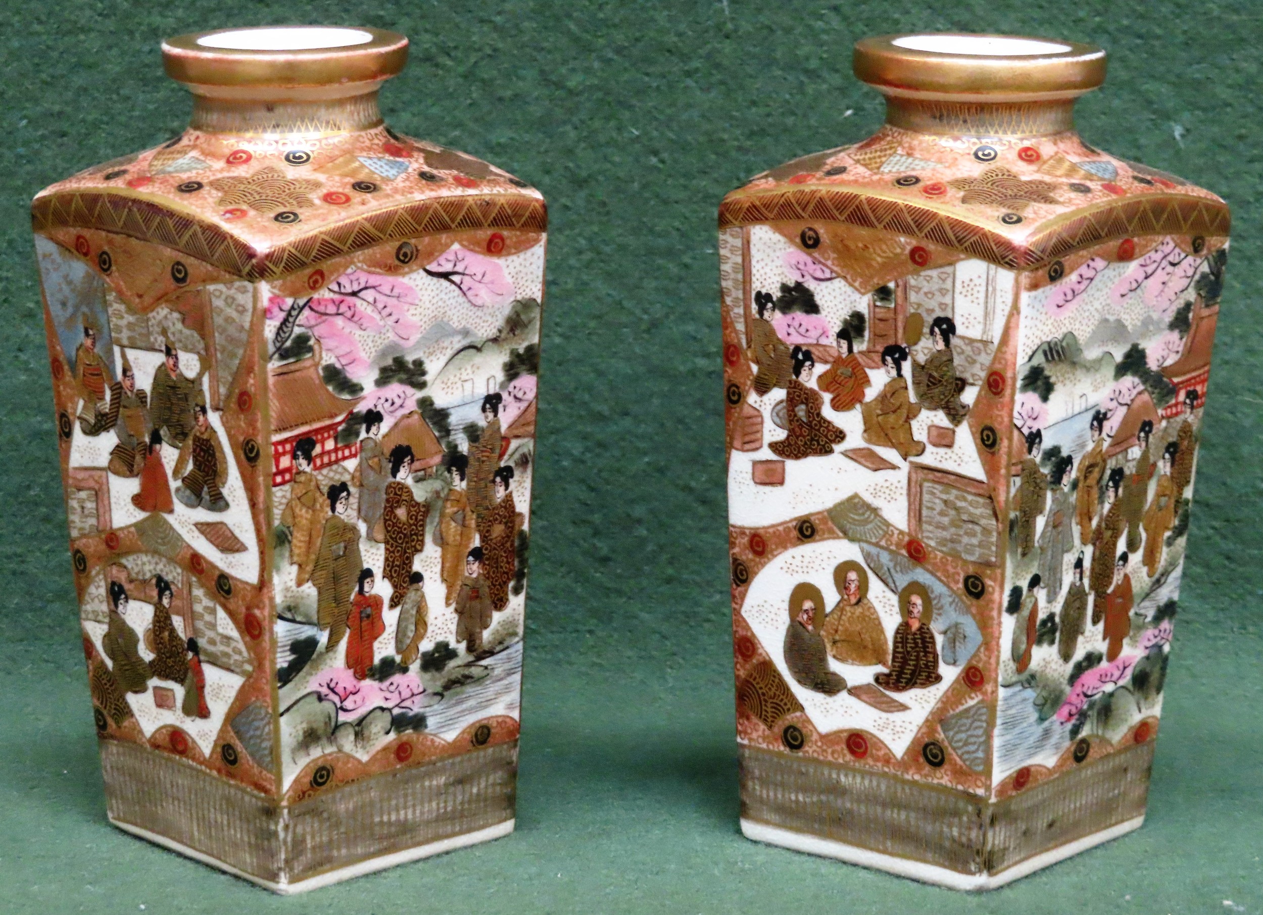 Pair of late 19th/early 20th century heavily gilded satsuma ware vases, decorated with panels depicting Oriental figures. 15.5cm