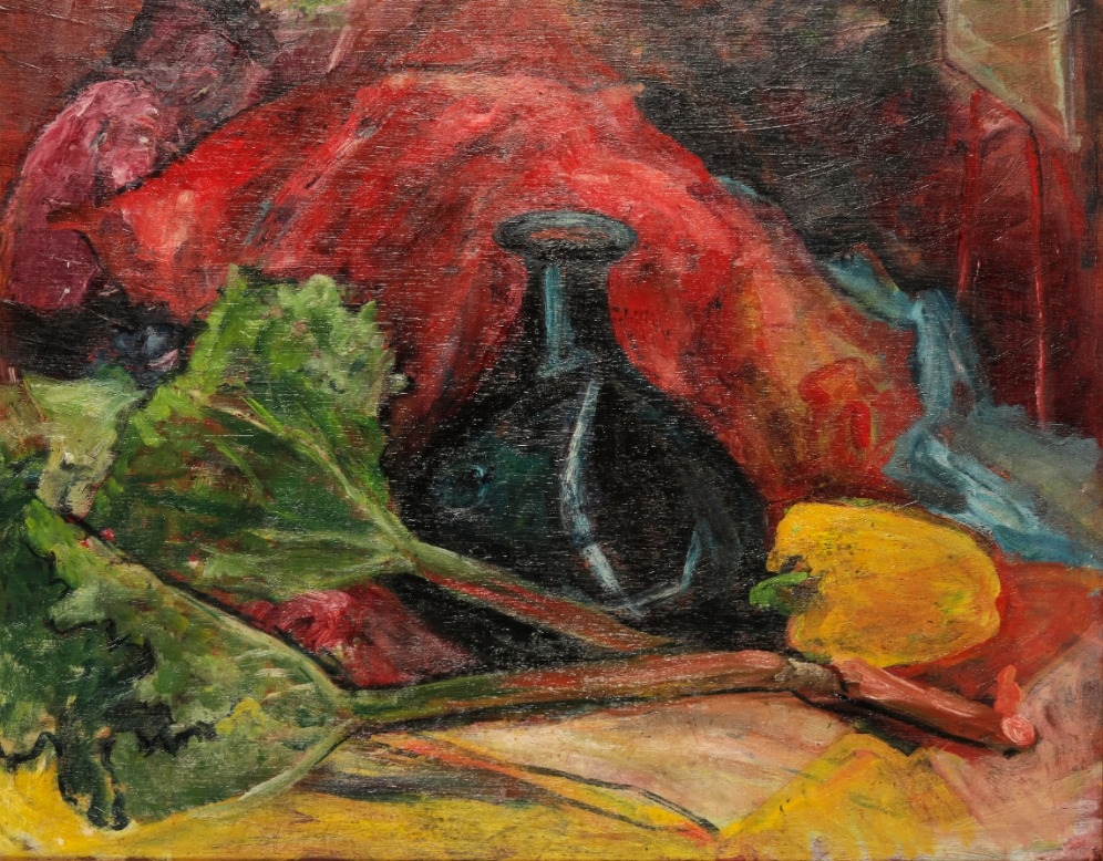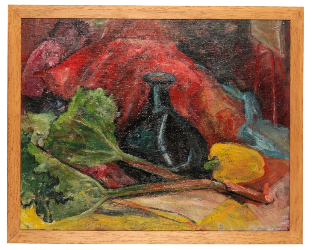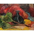 *MAVIS FREER (1927-2016) 'Green Bottle with Vegetables'oil on board, 46cm x 58.5cmProvenance: The Mavis Freer Collection, Part II.