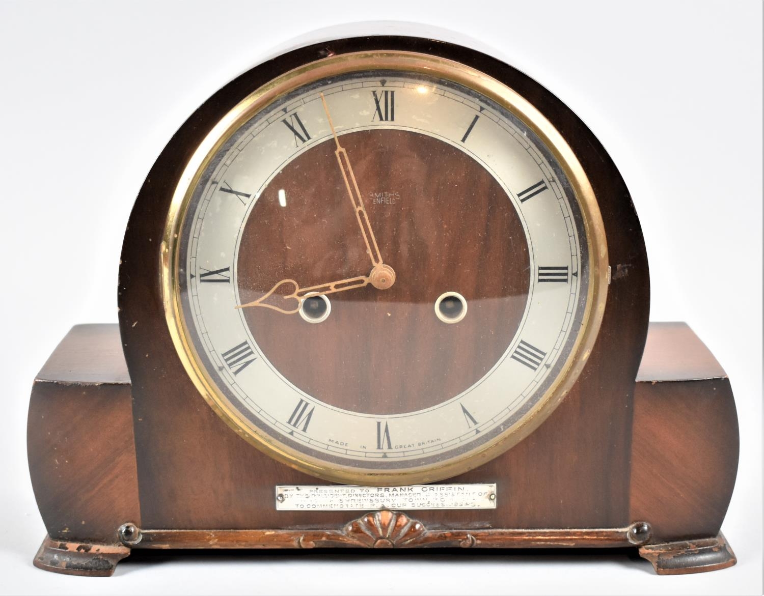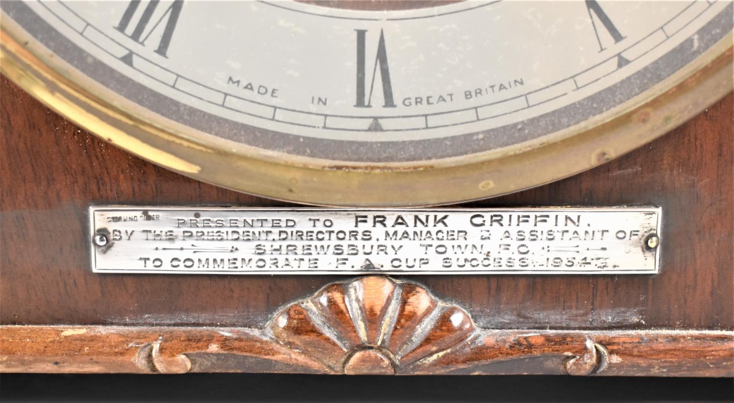 A Mid 20th Century Walnut Cased Presentation Mantle Clock, Having Sterling Silver Mount Inscribed "Presented to Frank Griffin, by the President, Directors, Manager and Assistant of Shrewsbury Town FC to Commemorate FA Cup Success 1954", Frank Griffin Scored the Winning Goal Playing for West Bromwich Albion Although He Did Begin his Career at Shrewsbury Town