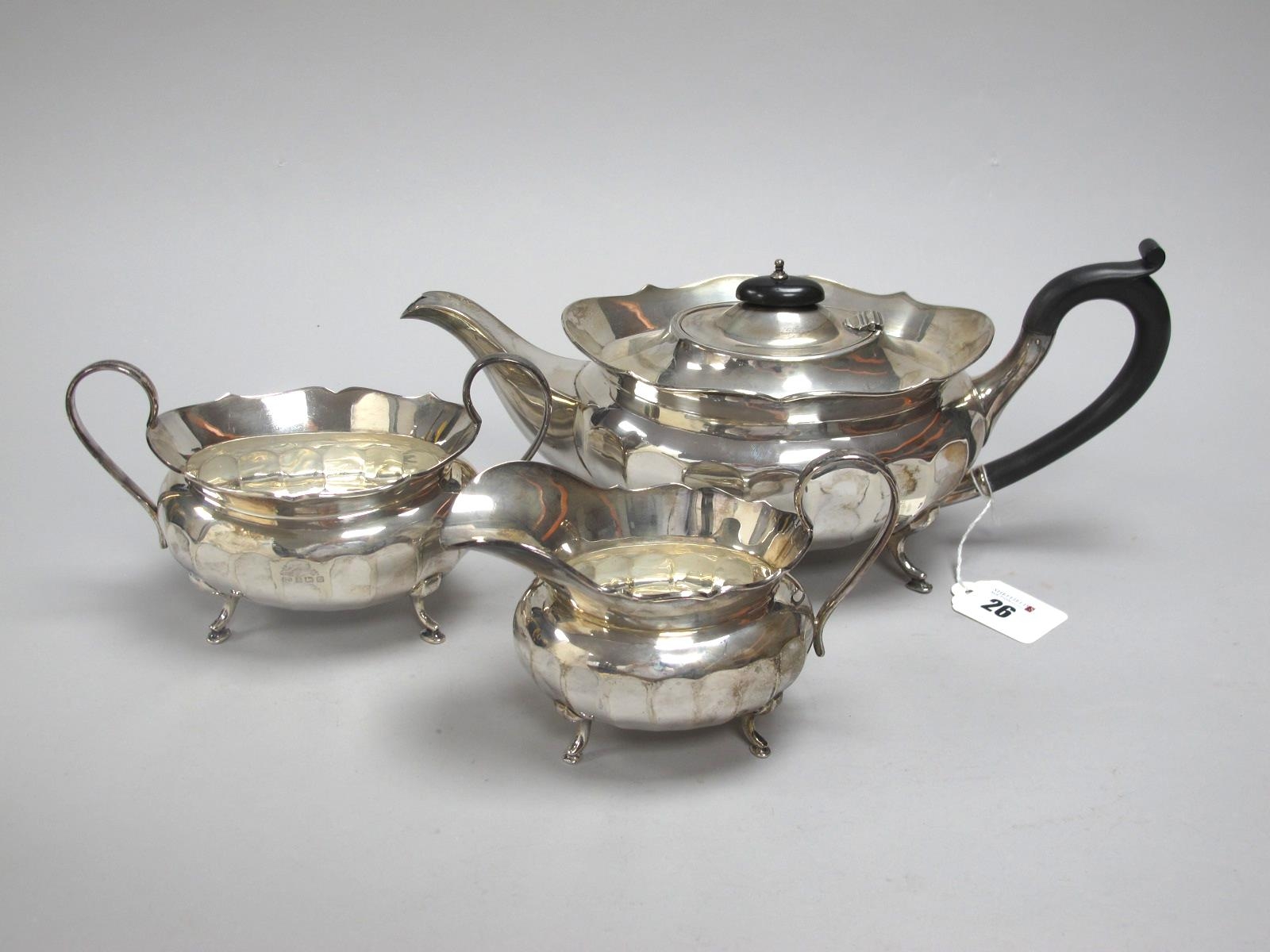 A Hallmarked Silver Three Piece Tea Set, TS, Birmingham 1931, each of panelled oval form, raised on hoof feet (total weight 1225grams). (3)