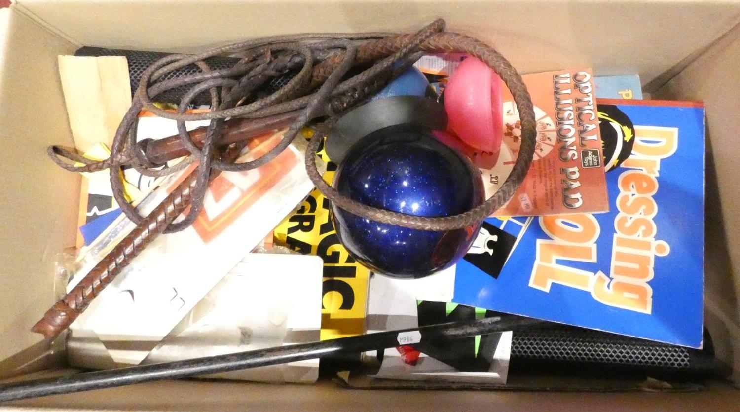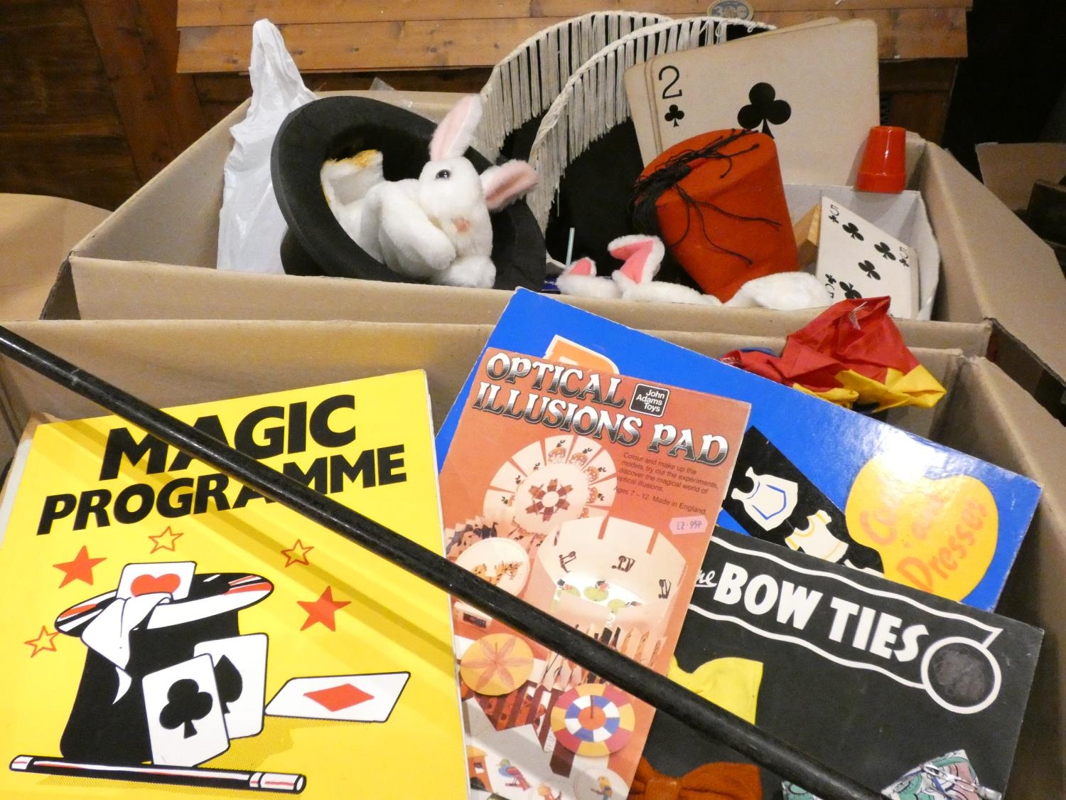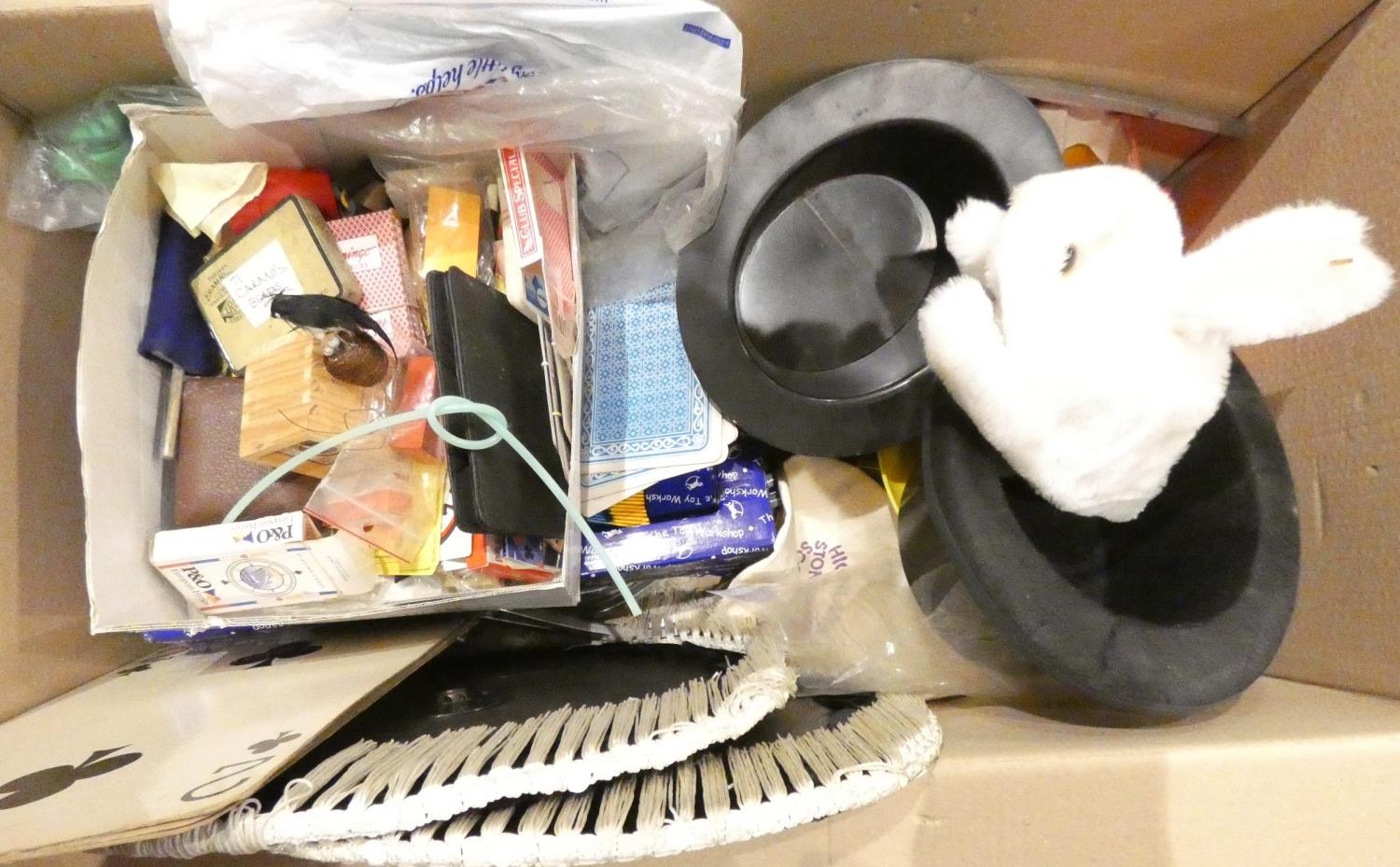 A quantity of children's magic tricks to include- wands, rabbit in a hat, playing cards, bow-ties, domino', games, etc.