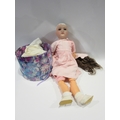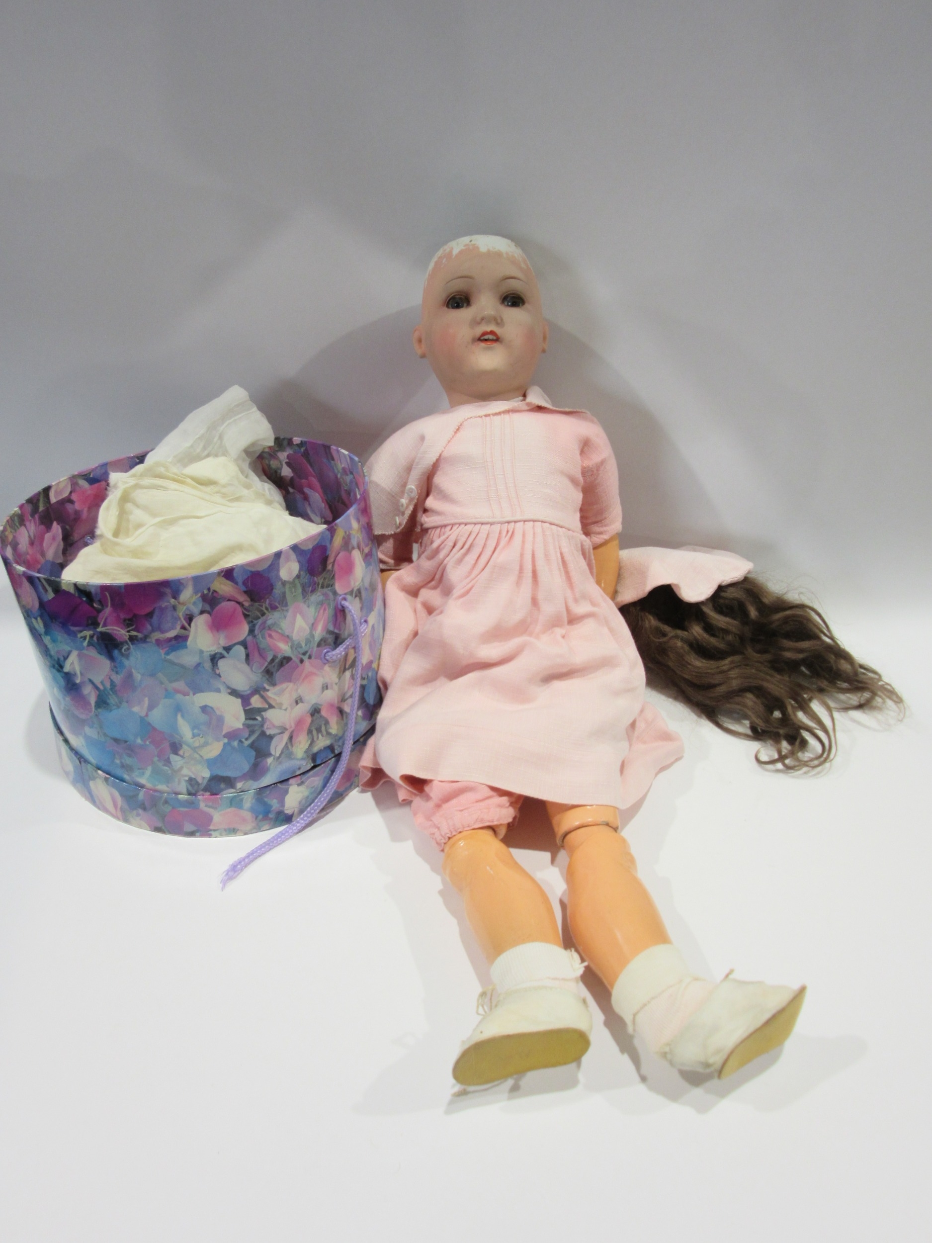 A Hugo Wiegand bisque headed doll, marked HW Germany 6 1/2 to back of head, with spare clothes