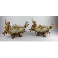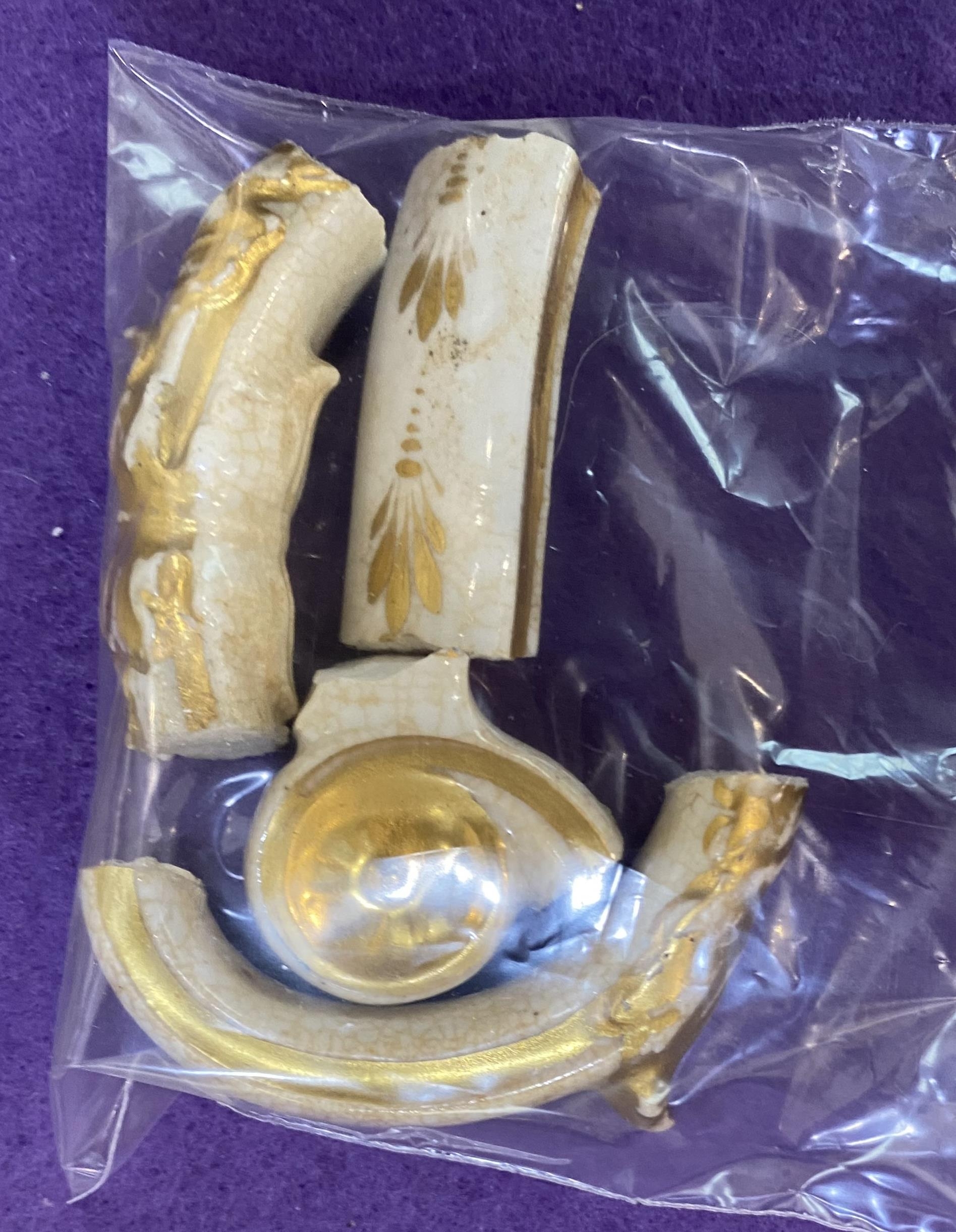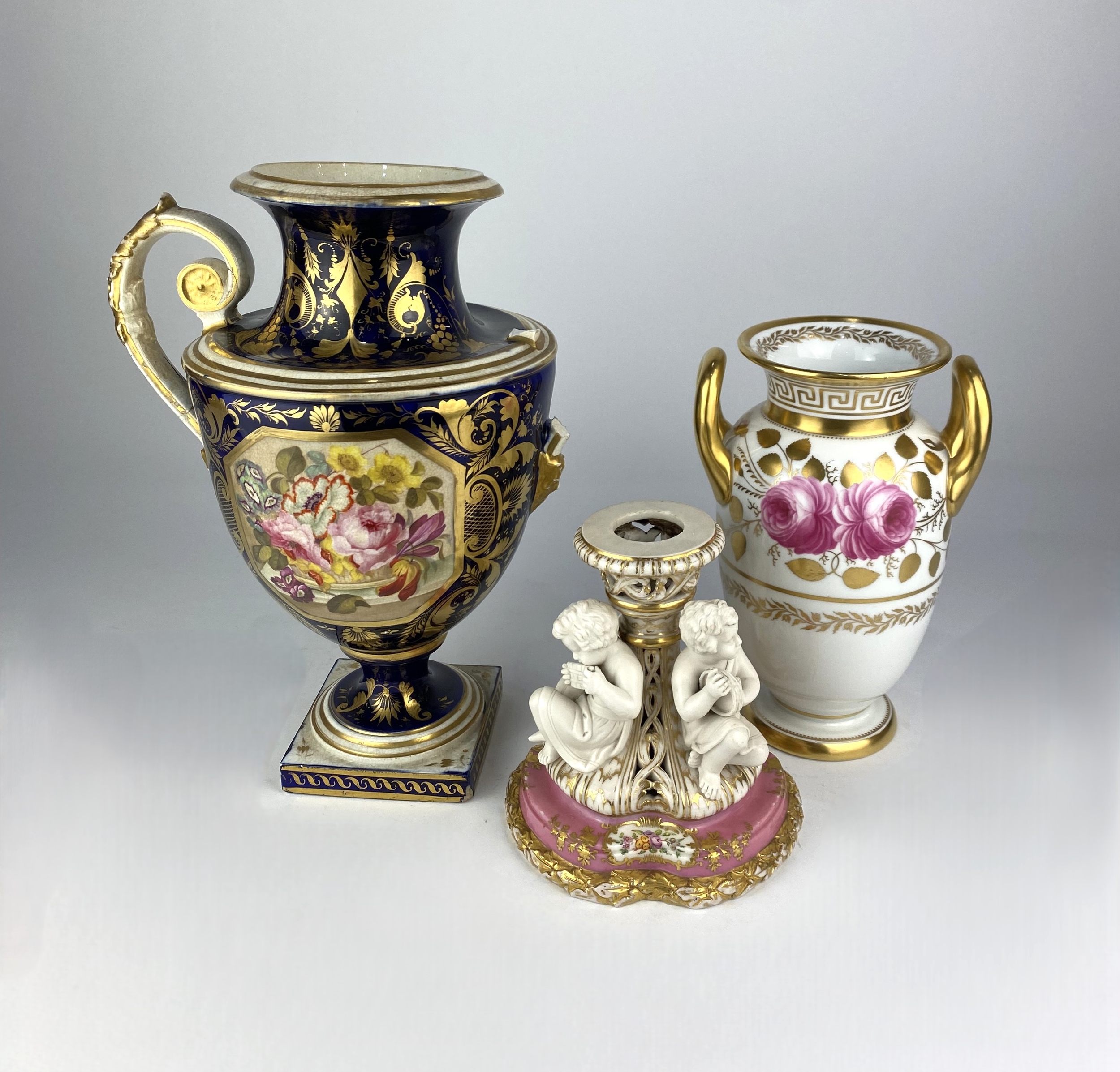 An early 19th century Derby porcelain two handled urn shaped vase with painted floral panel and gilt embellishments (one handle broken, the pieces present) 29cm high, a Spode Copeland's China two handled vase decorated with pink roses and gilt embellishments on white ground 20cm high, and a Daniell porcelain candlestick decorated with Parian cherub musicians 15cm high
