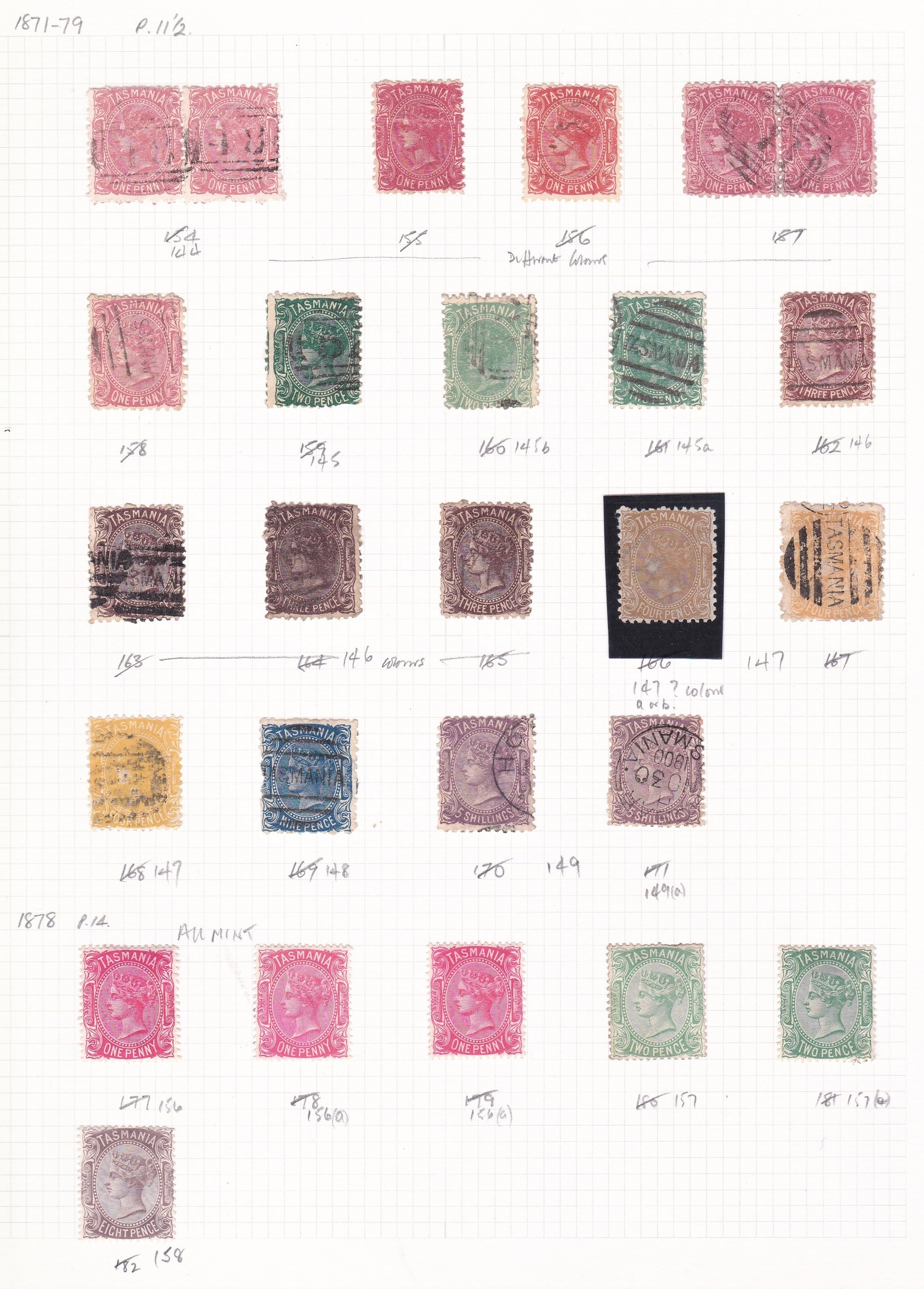 Australia (Tasmania) 1871-1879 Perf 11 1/2 mostly used range to 5/- (2) and 1878, perf 14, mint range 1d to 8d. Good lot (26)