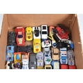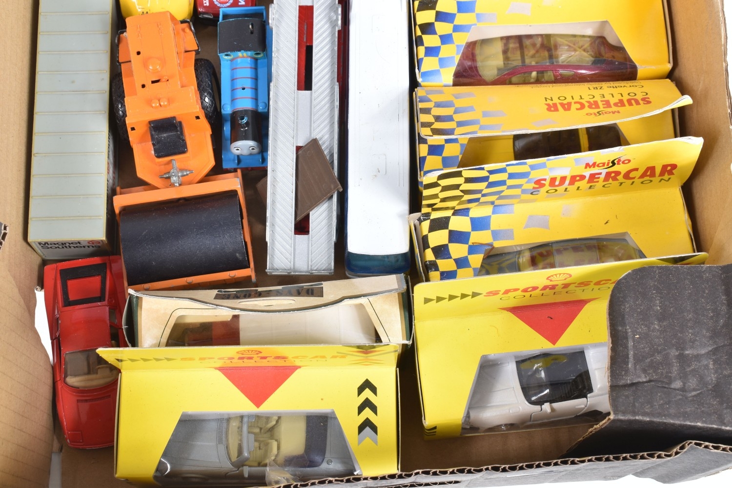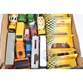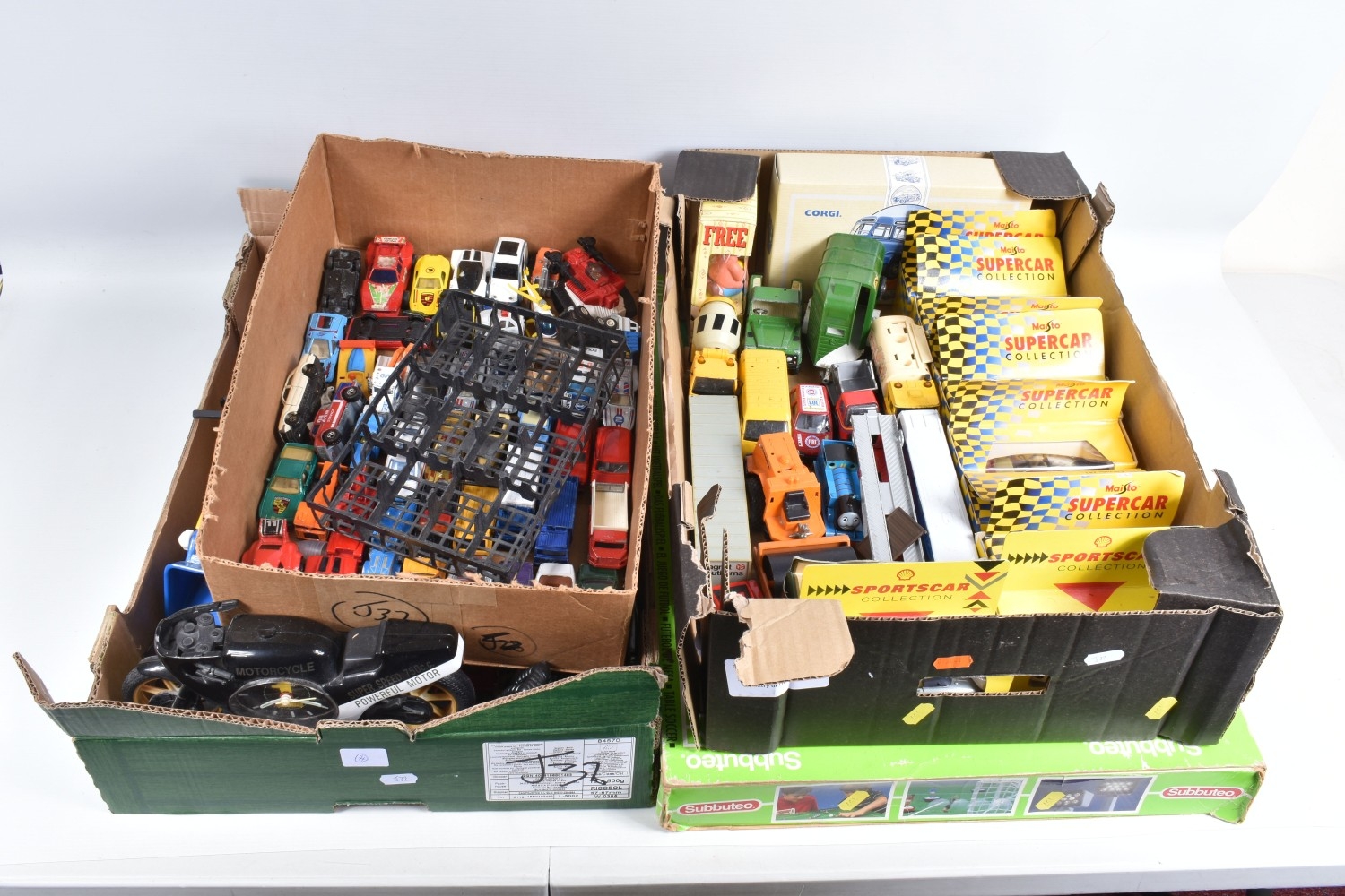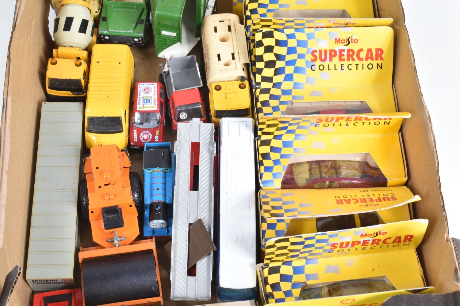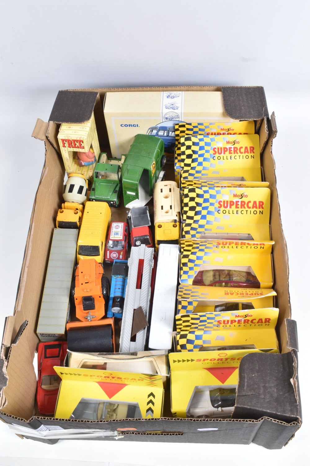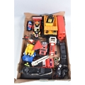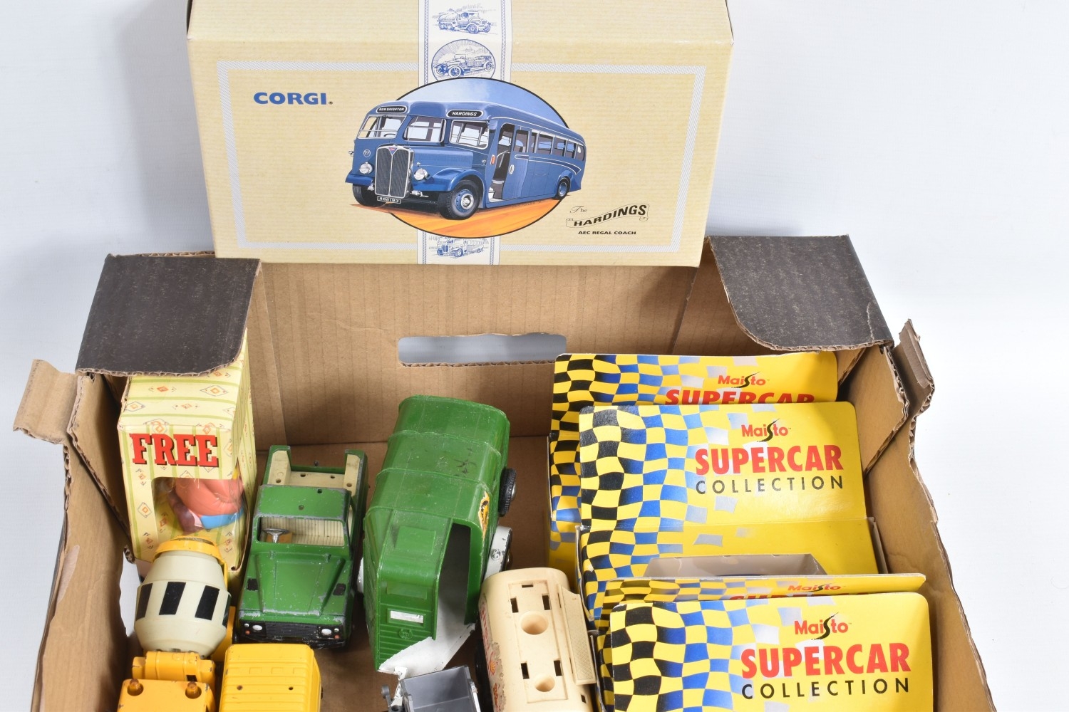A QUANTITY OF BOXED AND UNBOXED DIECAST AND PLASTIC VEHICLES, to include boxed Corgi Classics A.E.C. Regal Coach - Hardings, No.97194, with limited edition certificate, boxed Maisto Supercar collection, unboxed playworn Britains, Matchbox, Corgi, Tonka, Bburago, Buddy L, Nylint, Majorette, Guiloy etc., all in playworn condition, some with paint loss, marking and wear, some with minor damage and/or missing parts, with an incomplete boxed Subbuteo set, No.60150, both floodlights, one Irish player and quantity of literature only, rest missing, box with damage and wear (4 boxes)