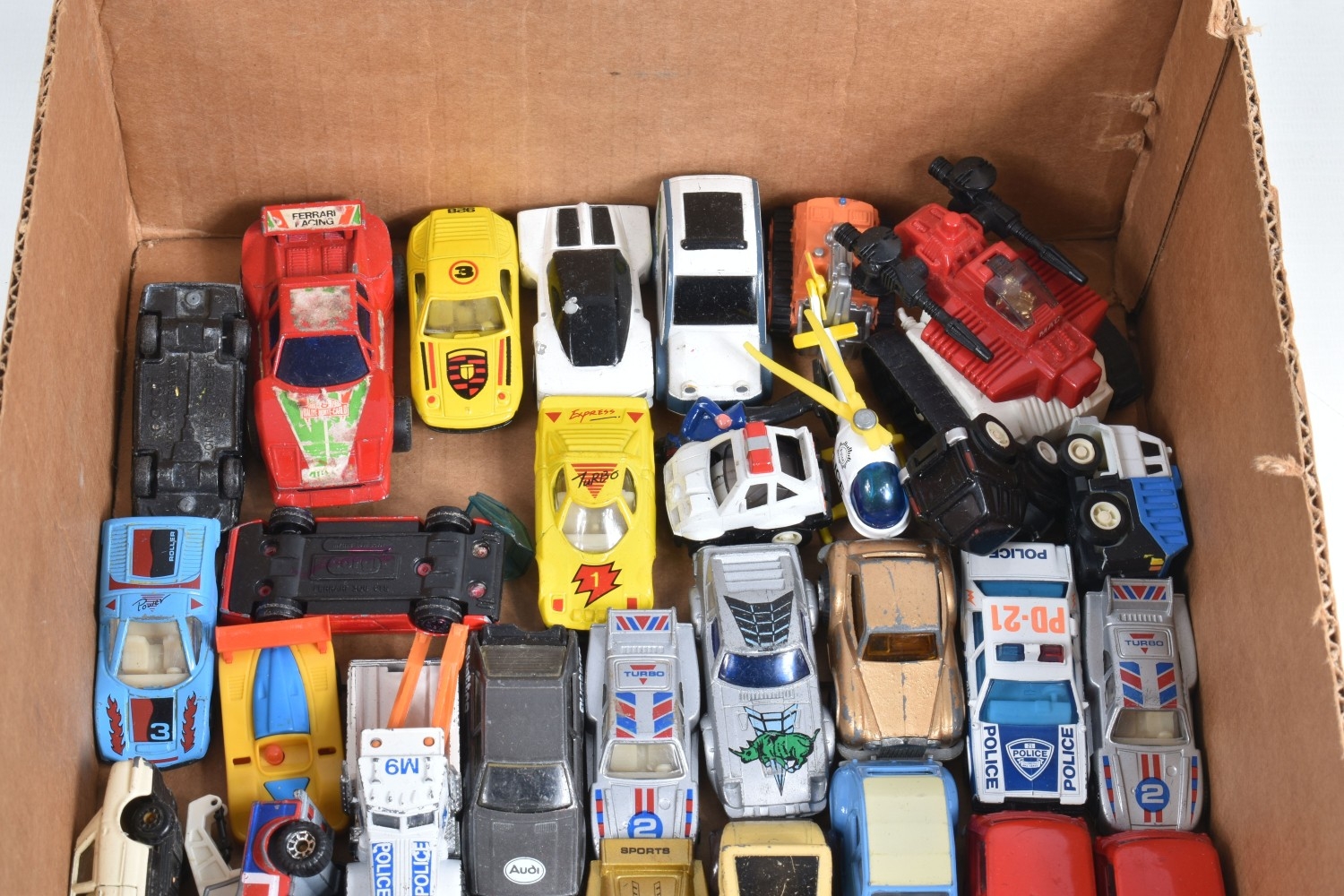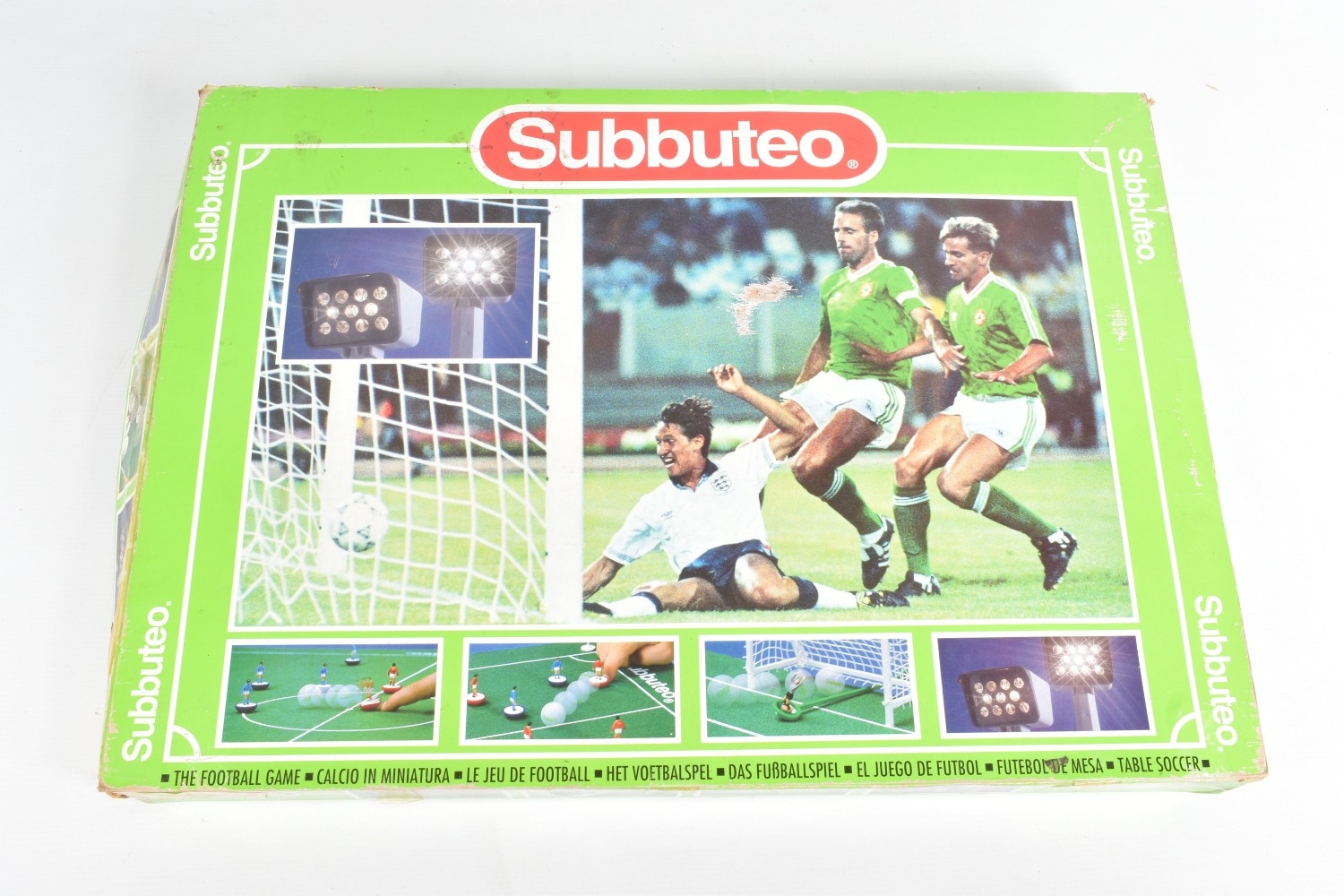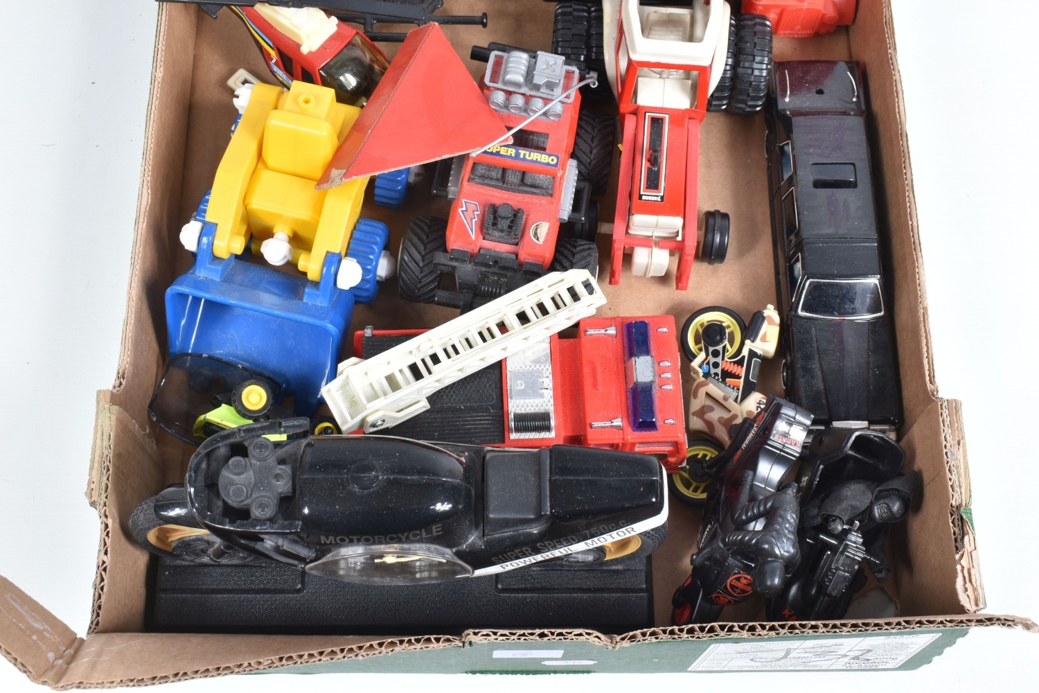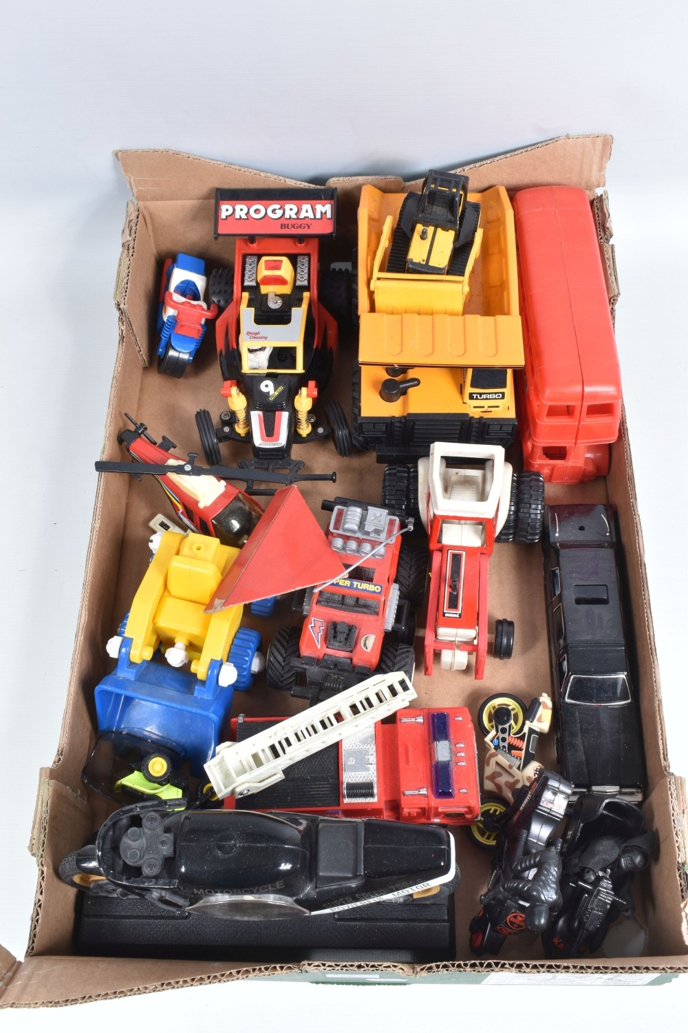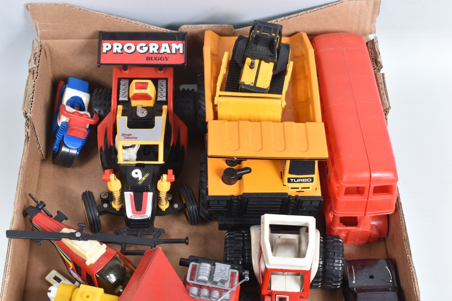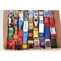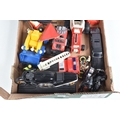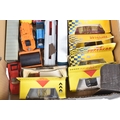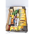 A QUANTITY OF BOXED AND UNBOXED DIECAST AND PLASTIC VEHICLES, to include boxed Corgi Classics A.E.C. Regal Coach - Hardings, No.97194, with limited edition certificate, boxed Maisto Supercar collection, unboxed playworn Britains, Matchbox, Corgi, Tonka, Bburago, Buddy L, Nylint, Majorette, Guiloy etc., all in playworn condition, some with paint loss, marking and wear, some with minor damage and/or missing parts, with an incomplete boxed Subbuteo set, No.60150, both floodlights, one Irish player and quantity of literature only, rest missing, box with damage and wear (4 boxes)