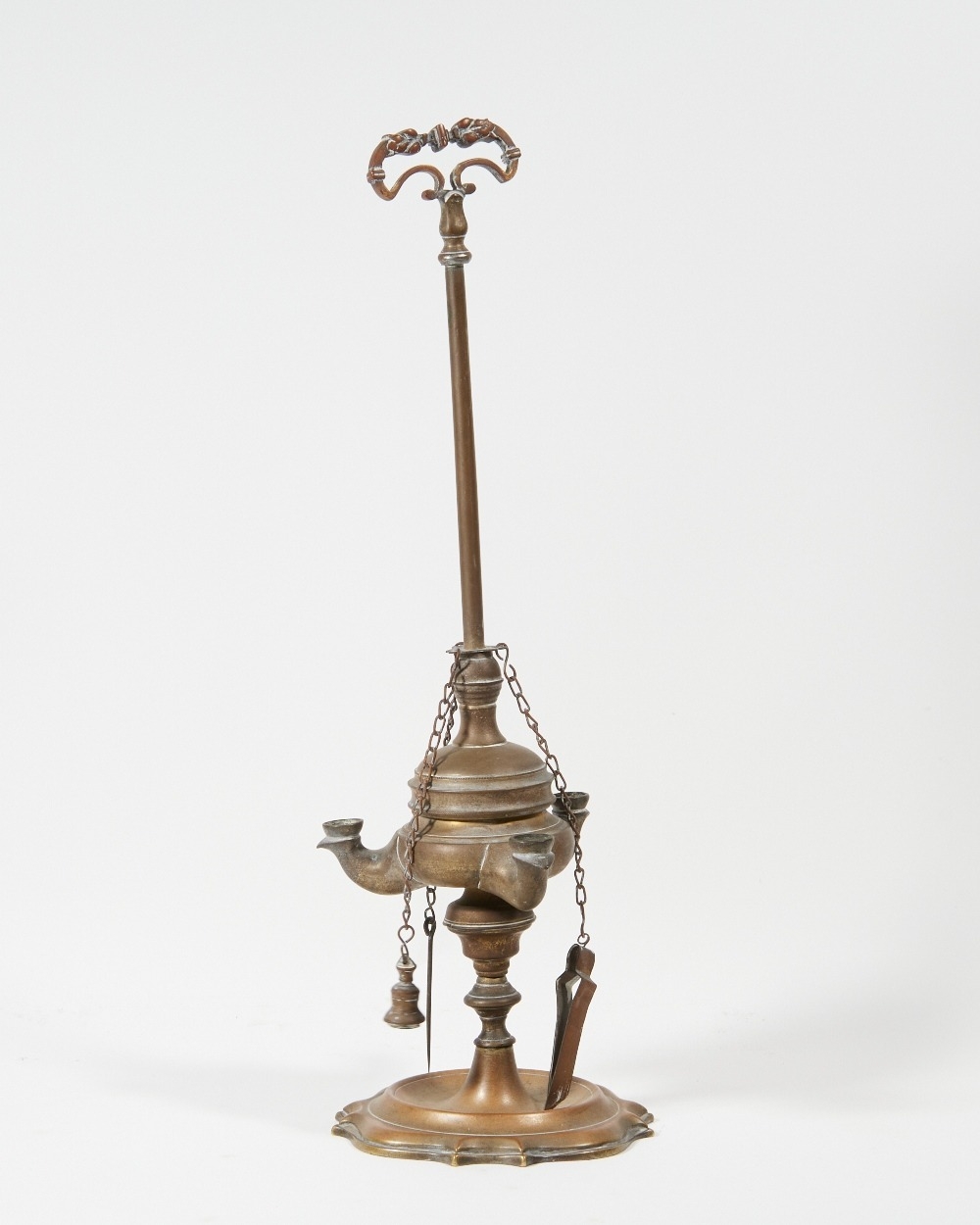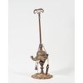 An Anglo-Indian brass oil lamp, 19th century, with three lights issuing from a central reservoir, the stem with shaped handle, the indented base with drip well, with three implements hanging on chains, 45cm high