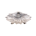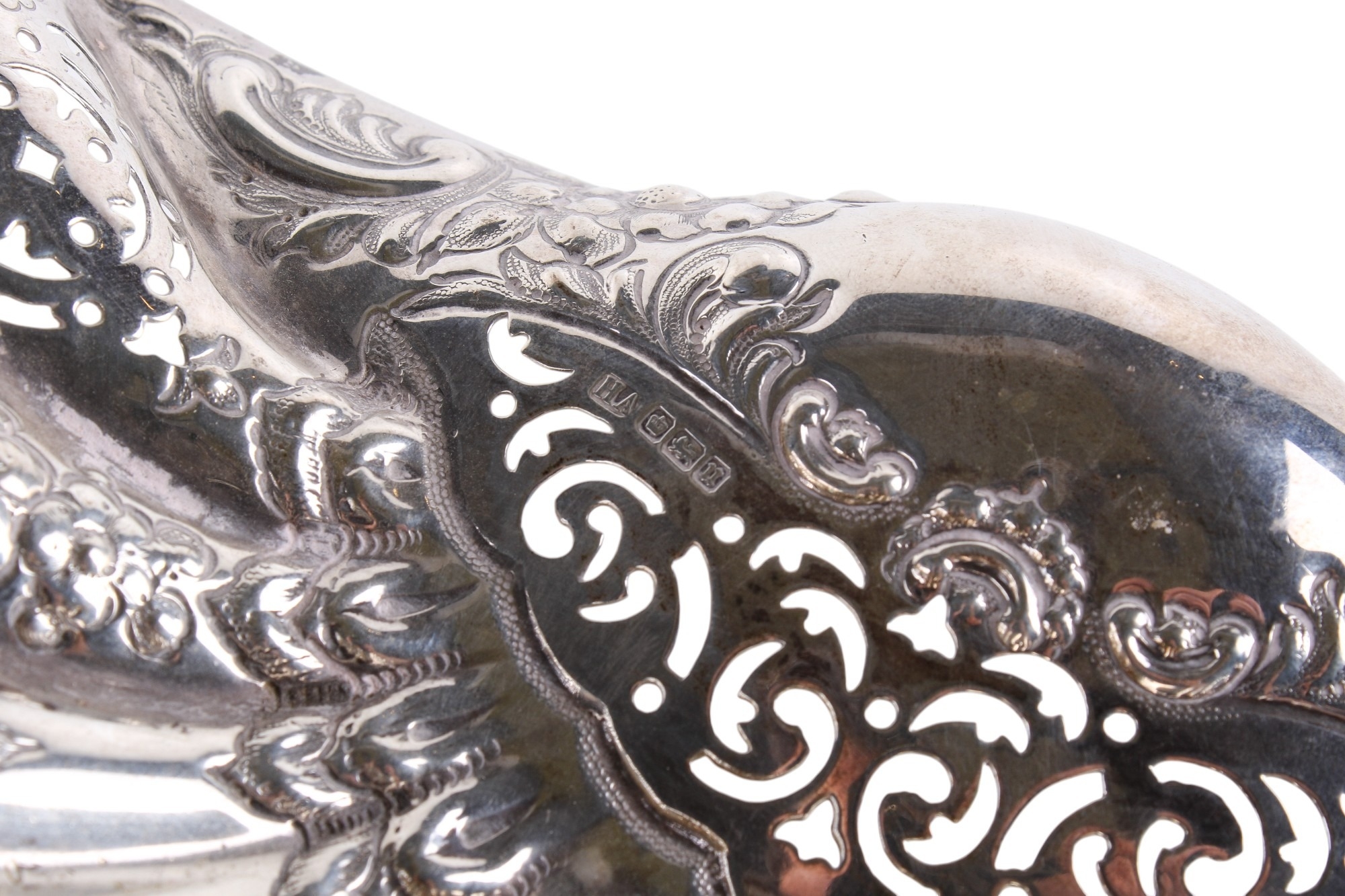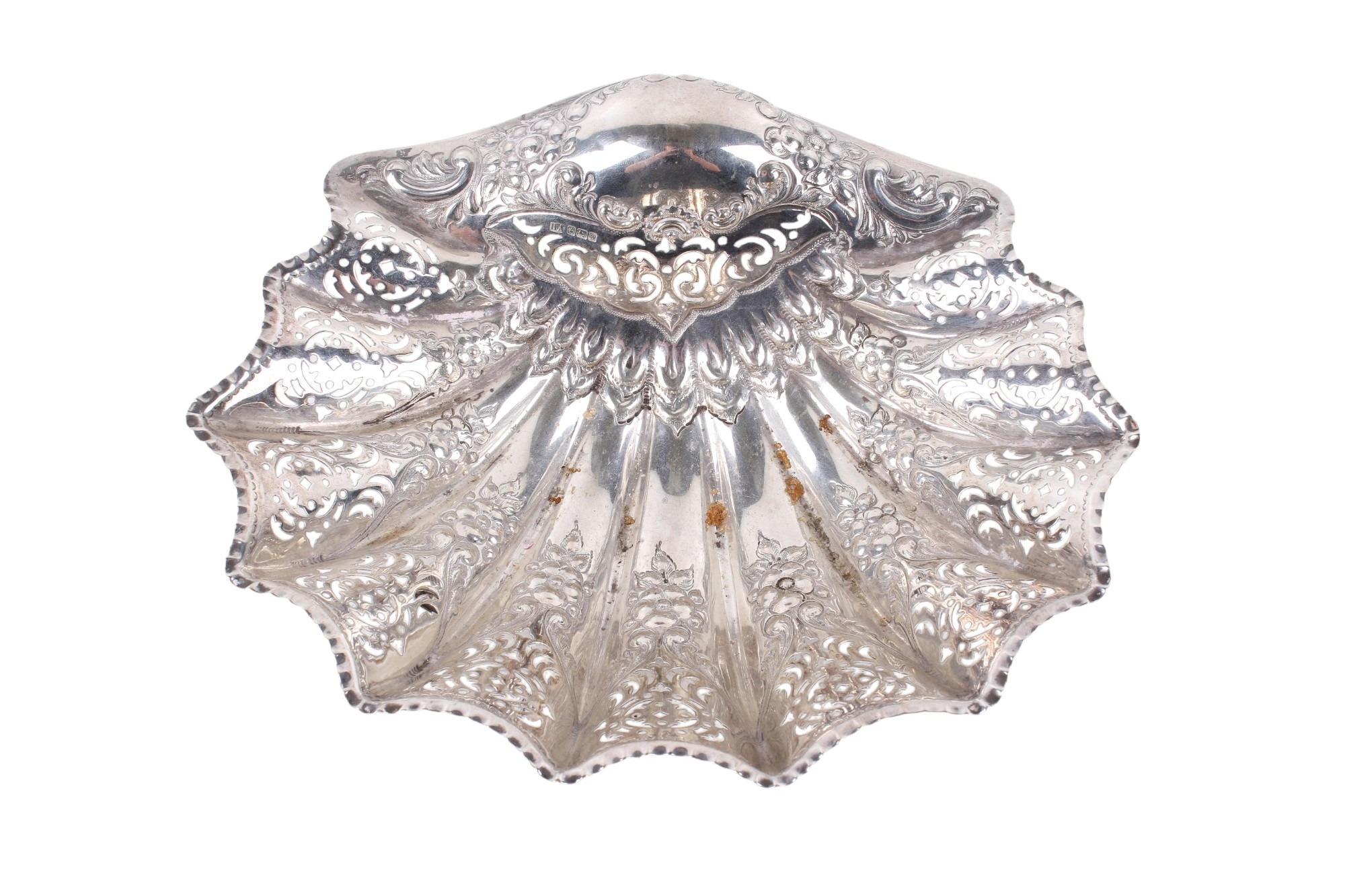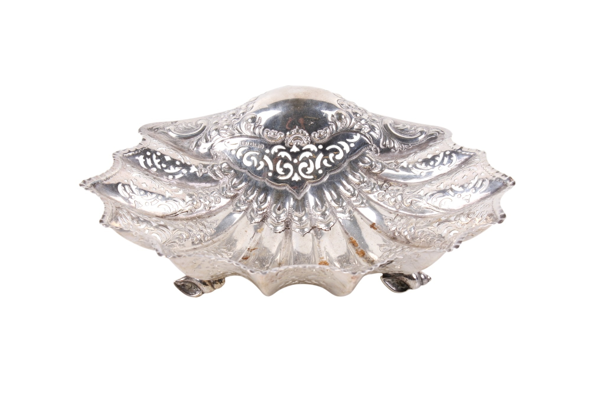 A George V silver bowl. Of shell shape and pierced and embossed foliate decoration, on three conch shell feet', hallmarked Atkin Brothers, Sheffield 1912, L25.5cm, weight 292.2g
