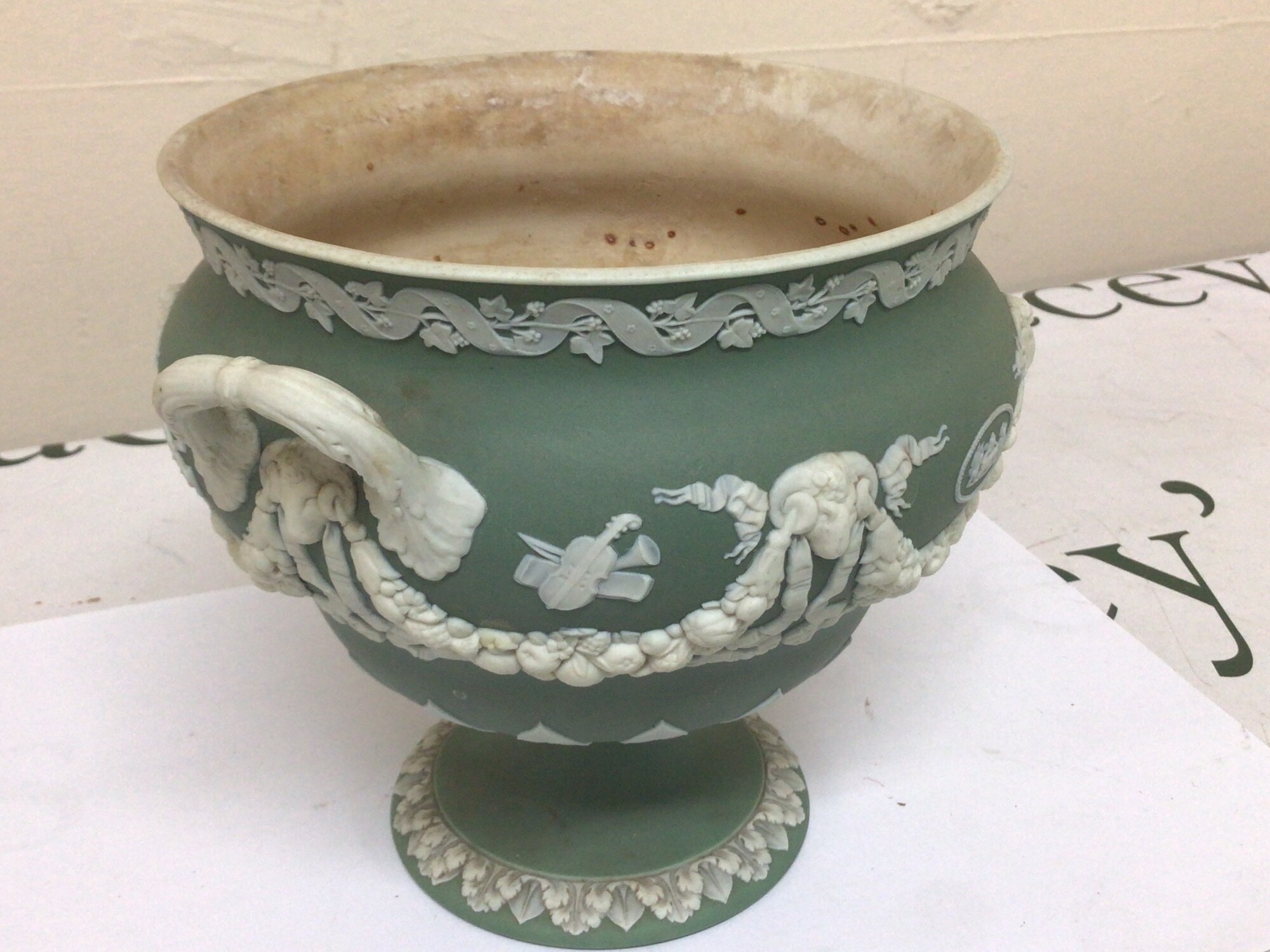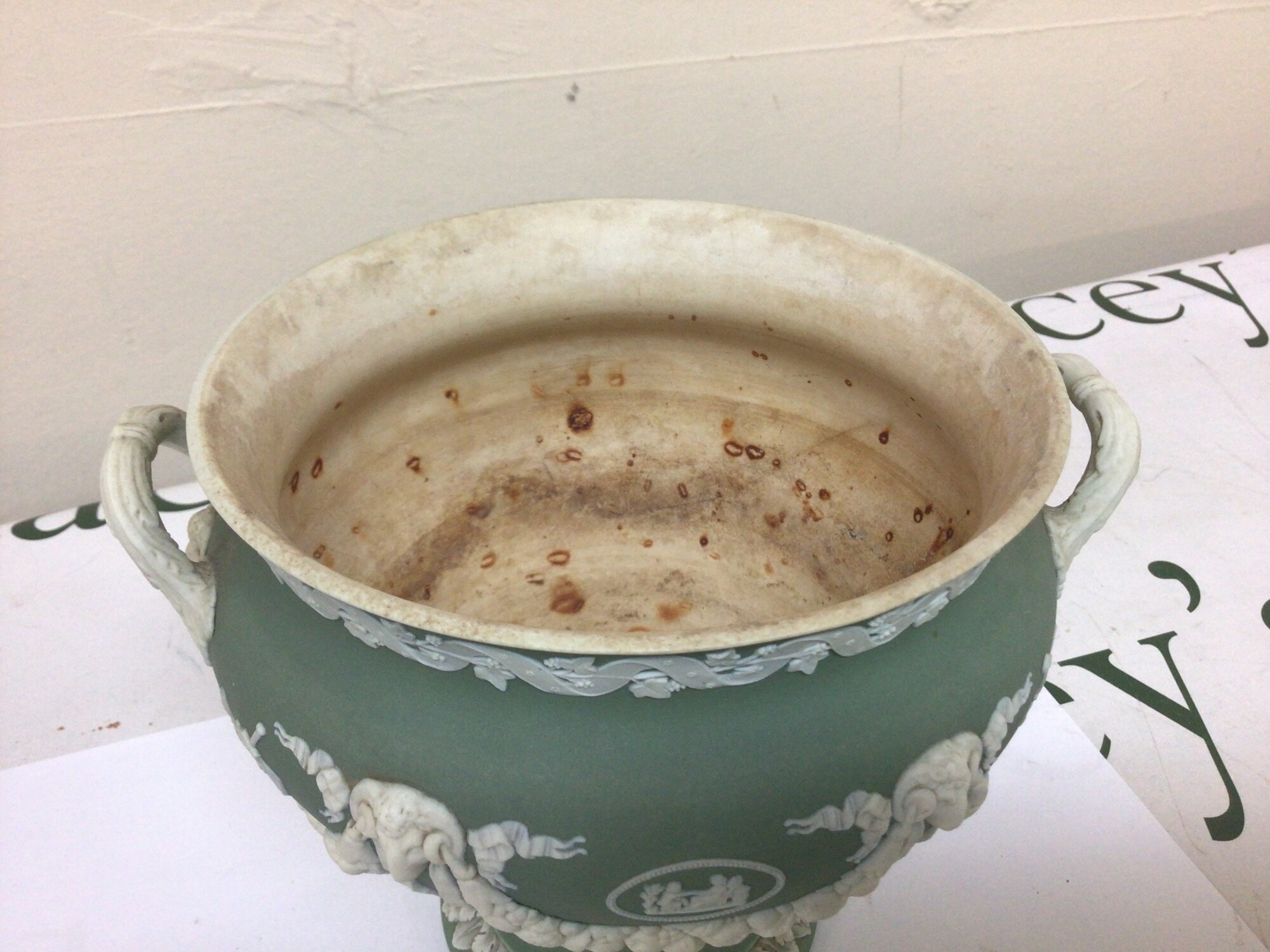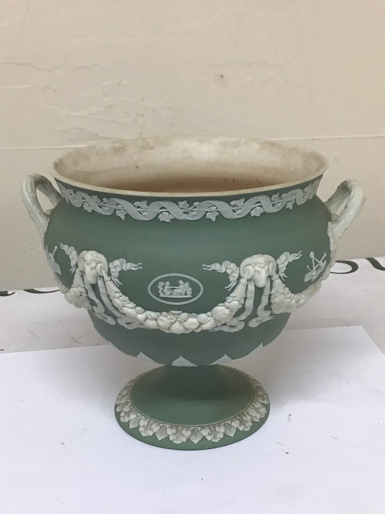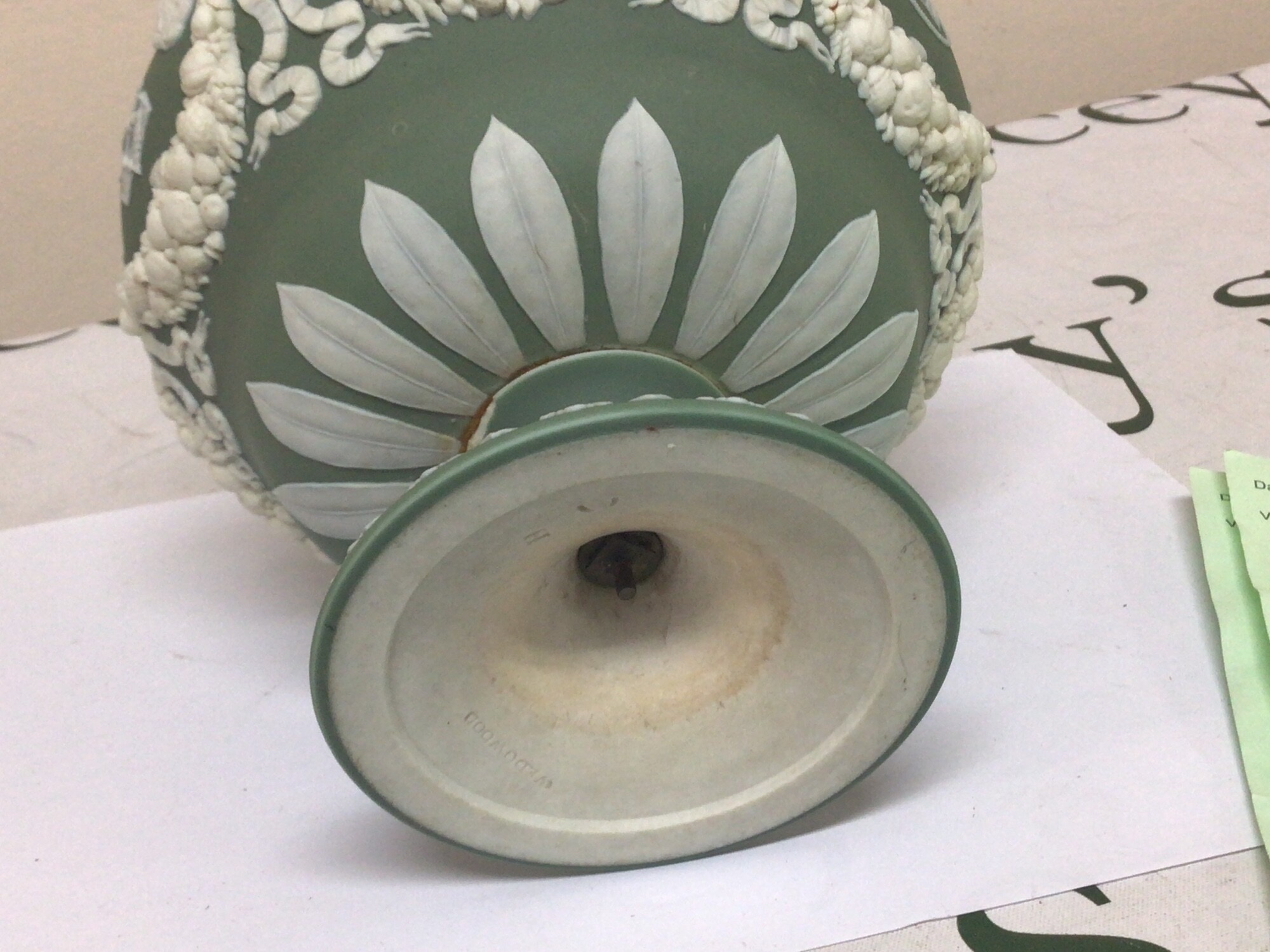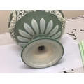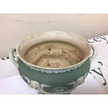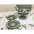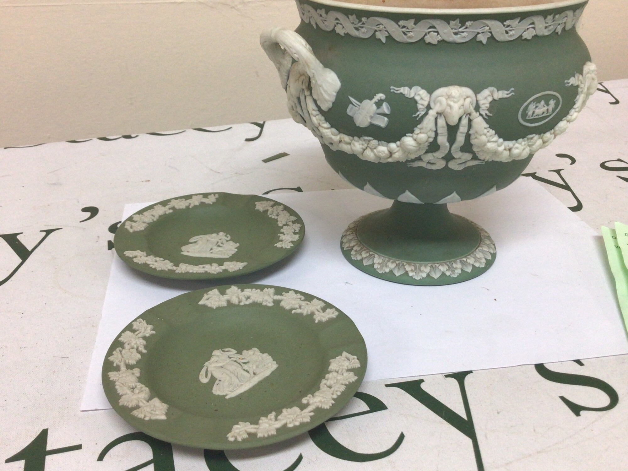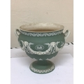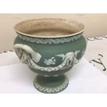 A 19th century Wedgwood green jasper ware urn with neo classical decoration impressed marks Wedgwood to the base the interior with stains Hight 15cm and two 20th century ash trays (3)