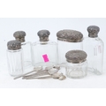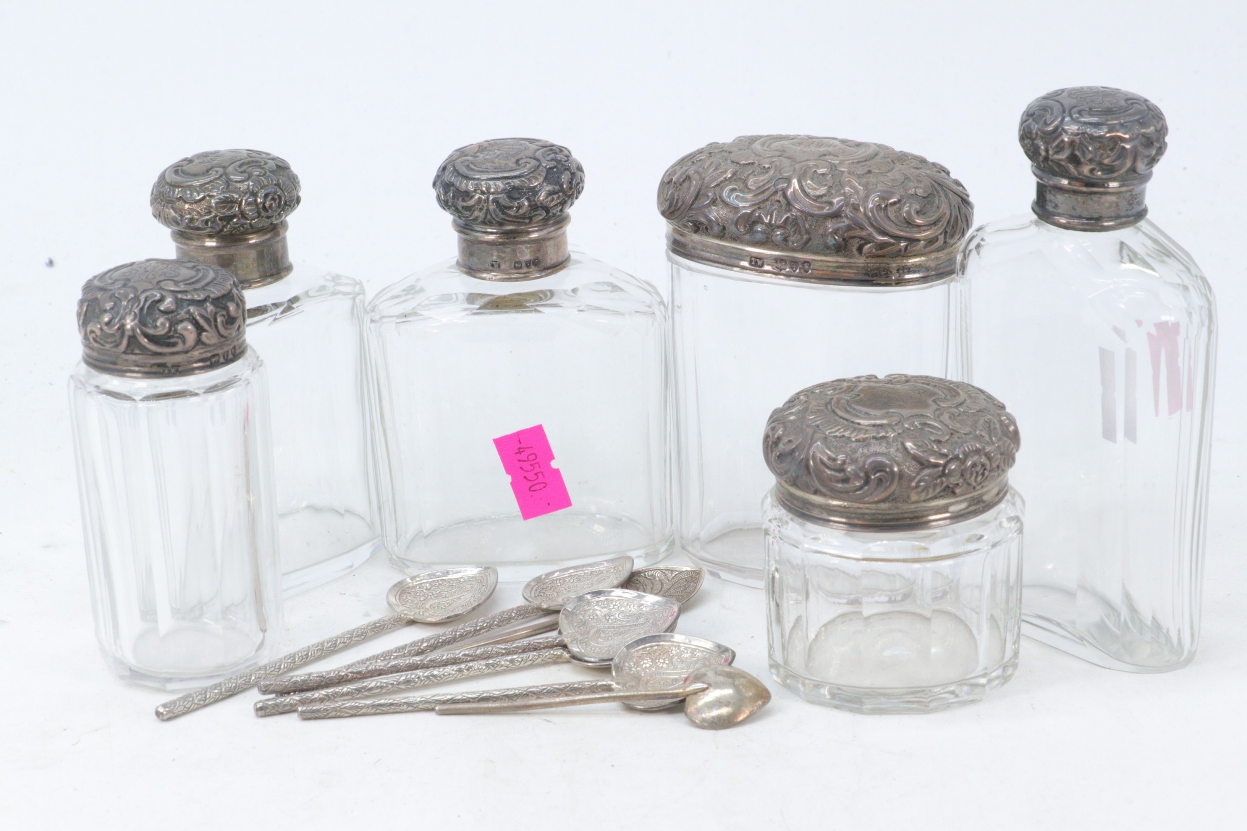 A selection of silver topped toiletry bottles, together with a selection of decorative white metal spoons etc