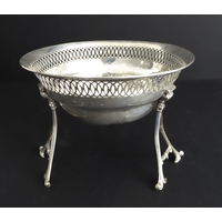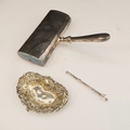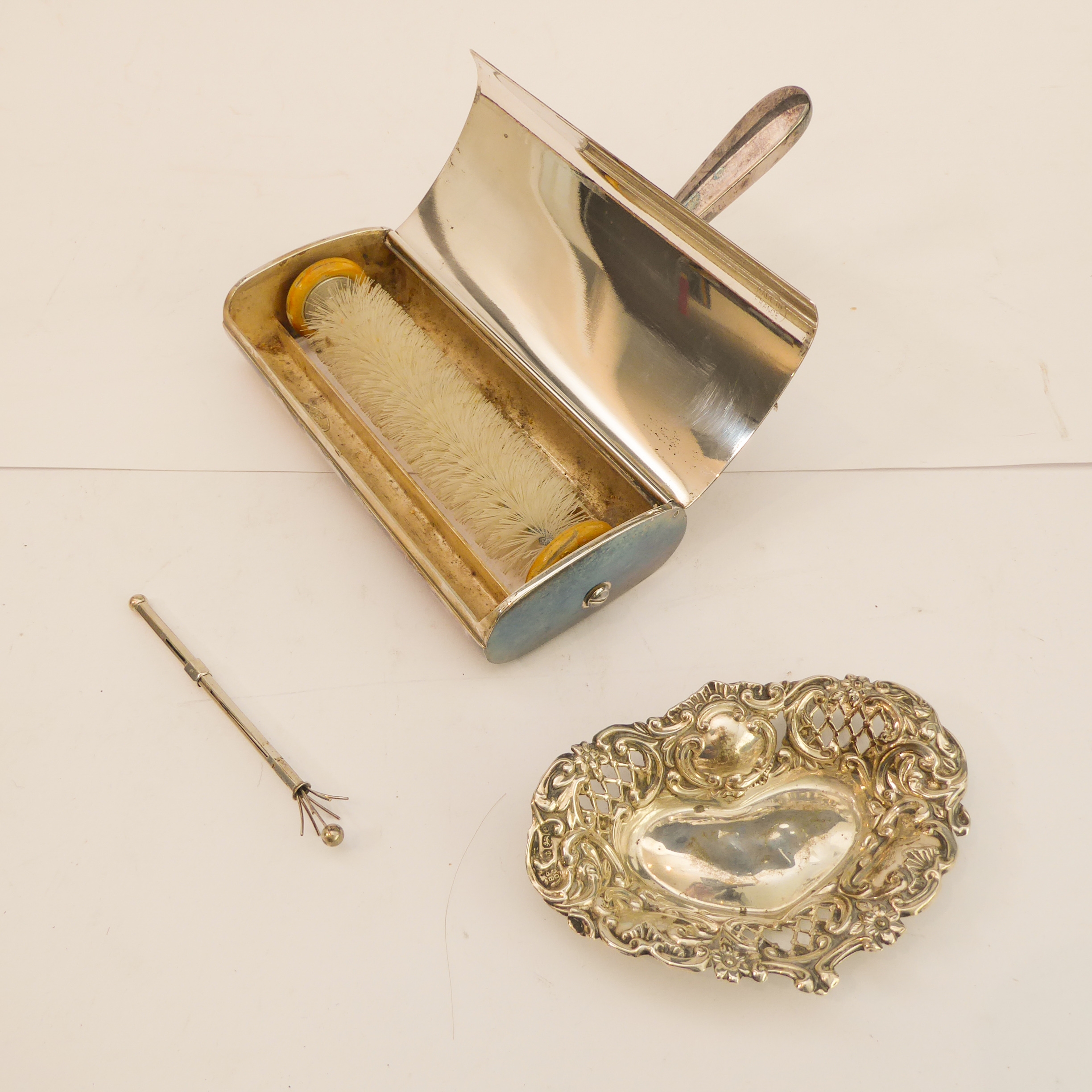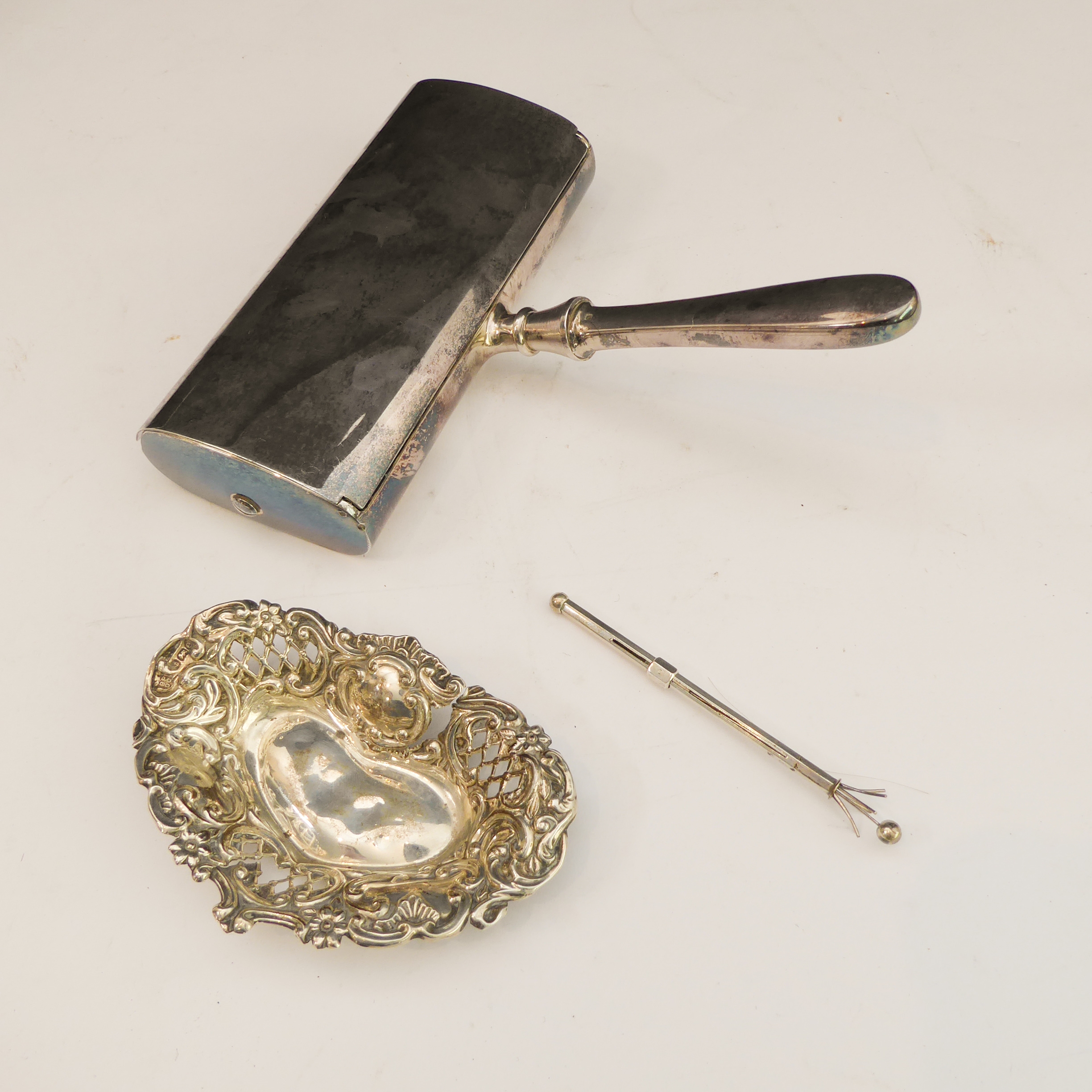 A small early 20th century heart-shaped reticulated bon-bon dish (some damage), a retractable swizzle-stick marked 'sterling' and a silver-plated crumb-sweeper (3)