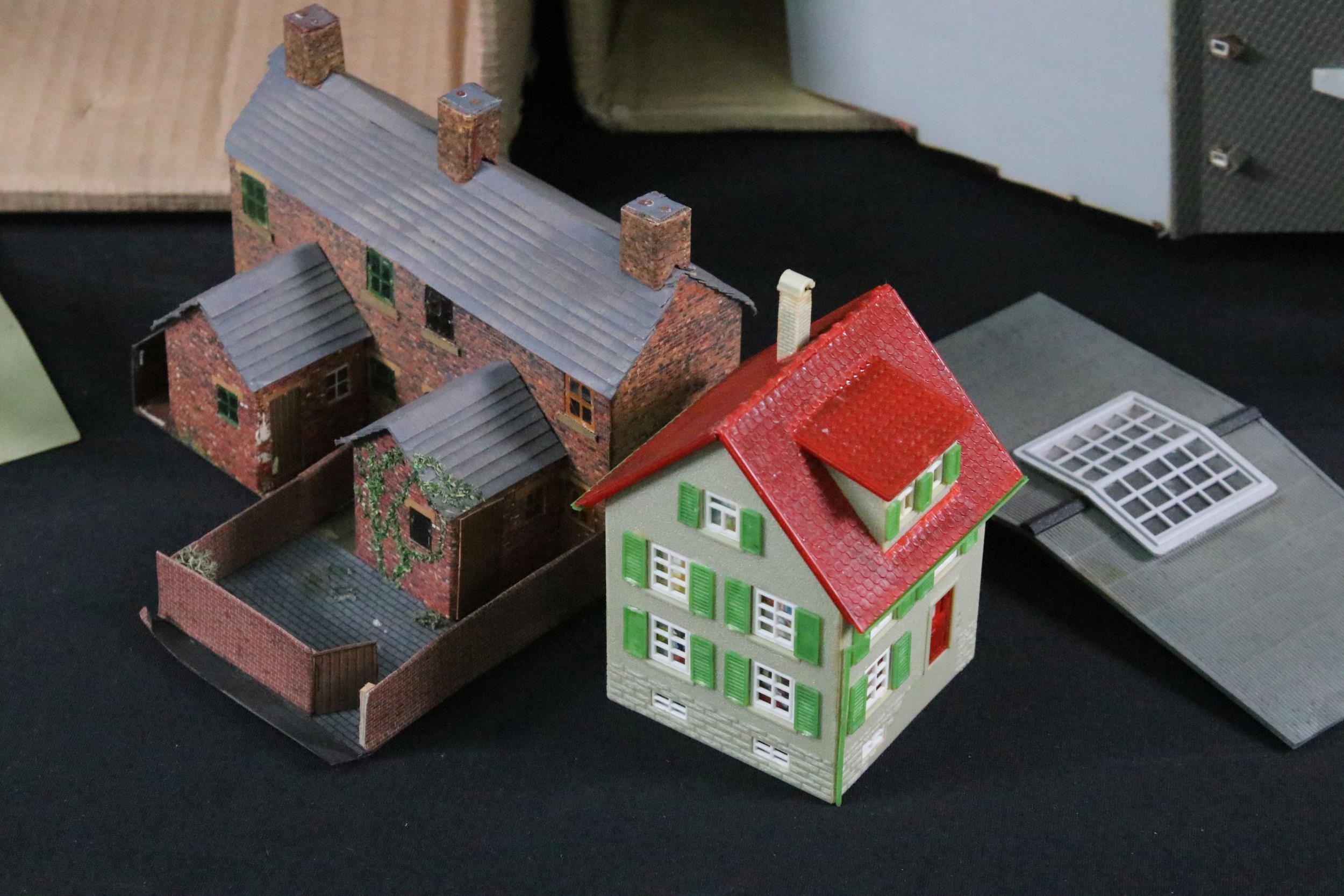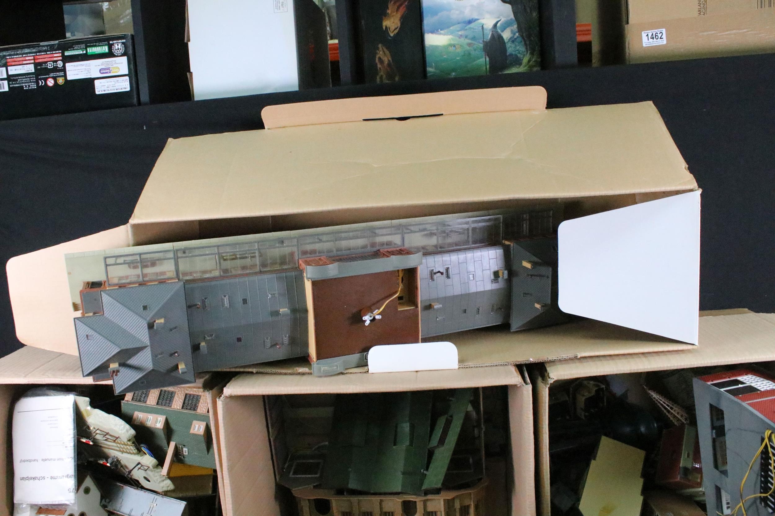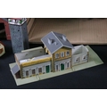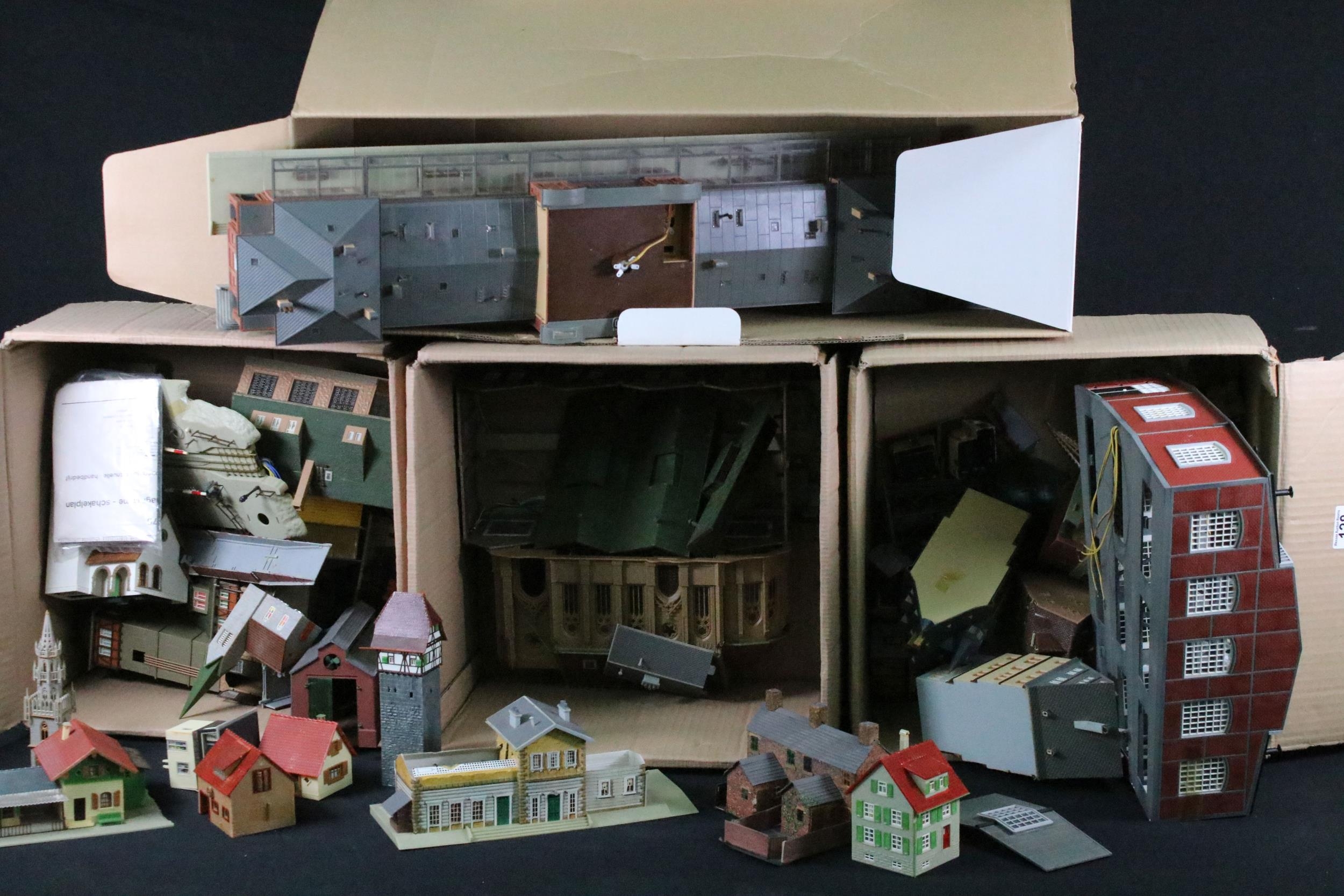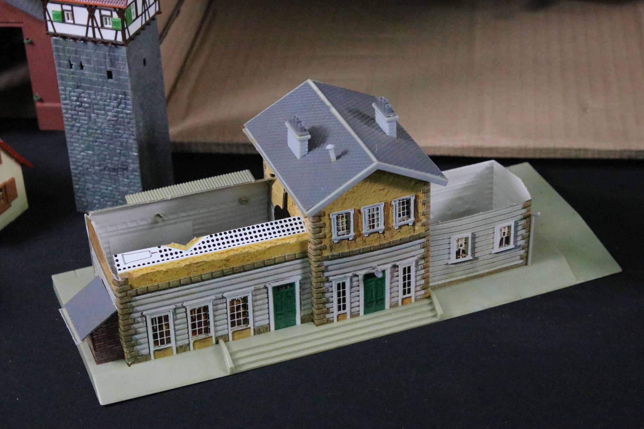 Large quantity of built HO / OO gauge plastic trackside buildings featuring large Vollmer Baden Baden station, plus card examples (5 boxes)
