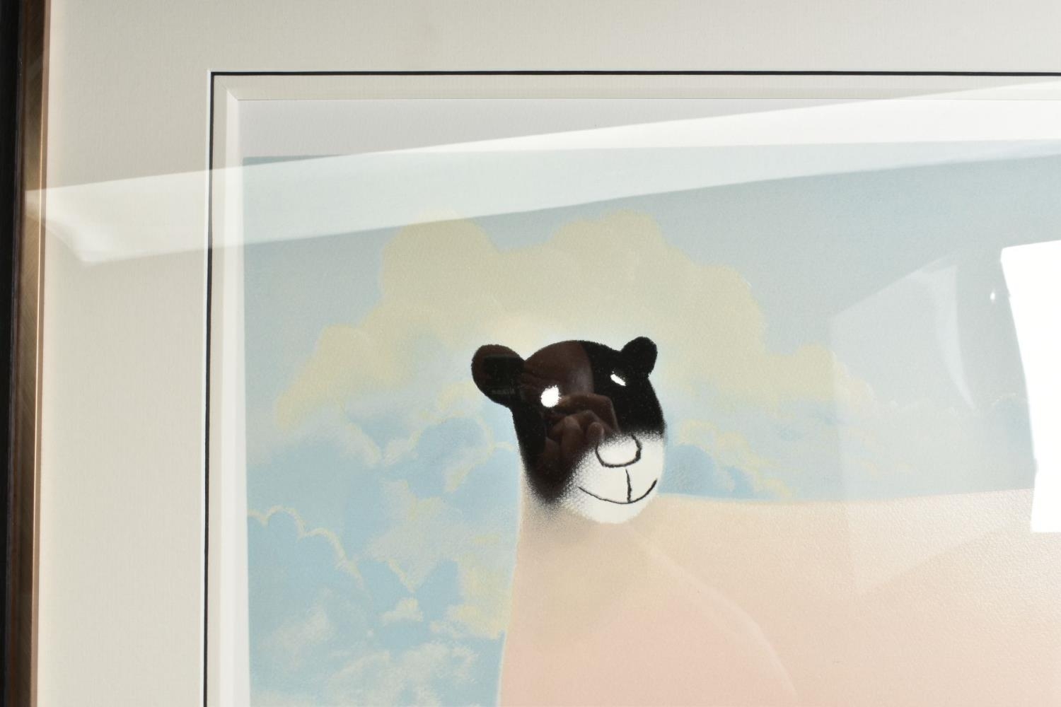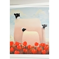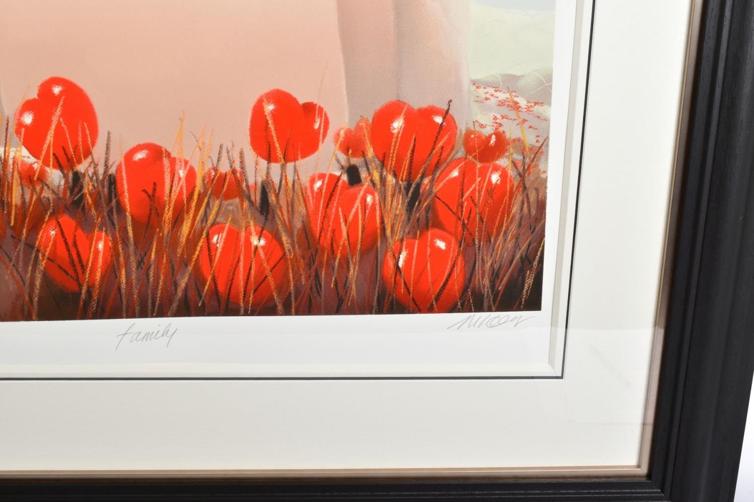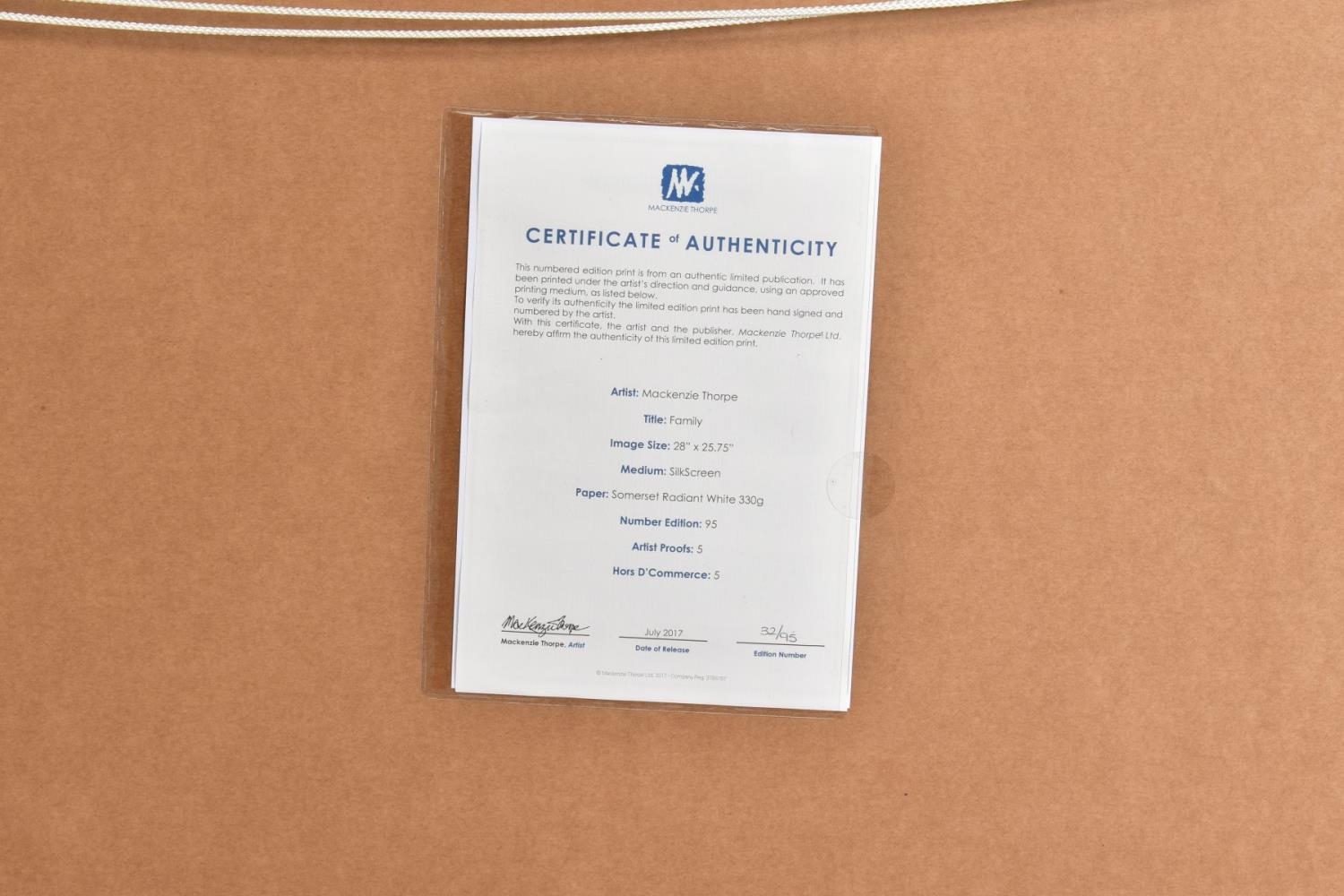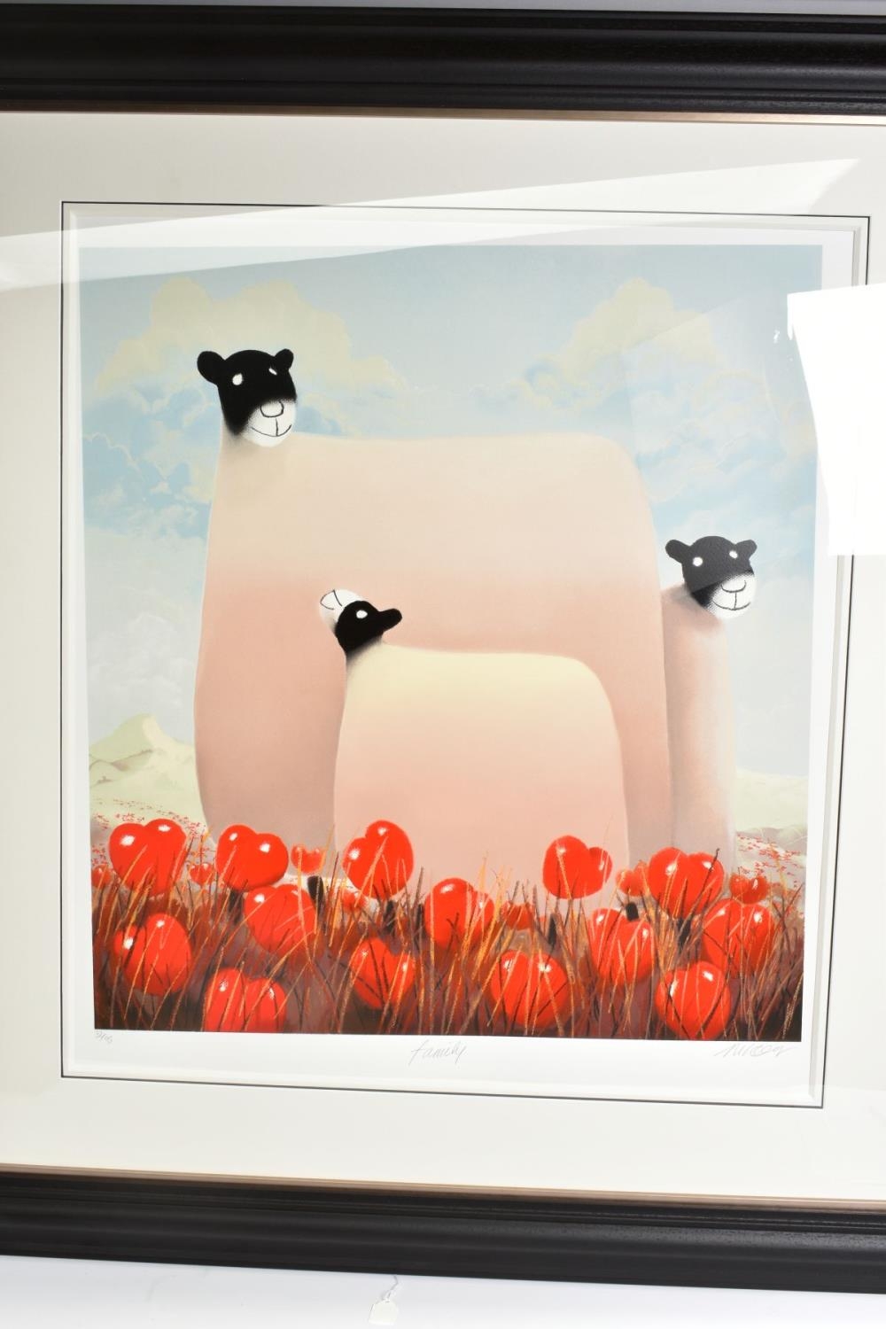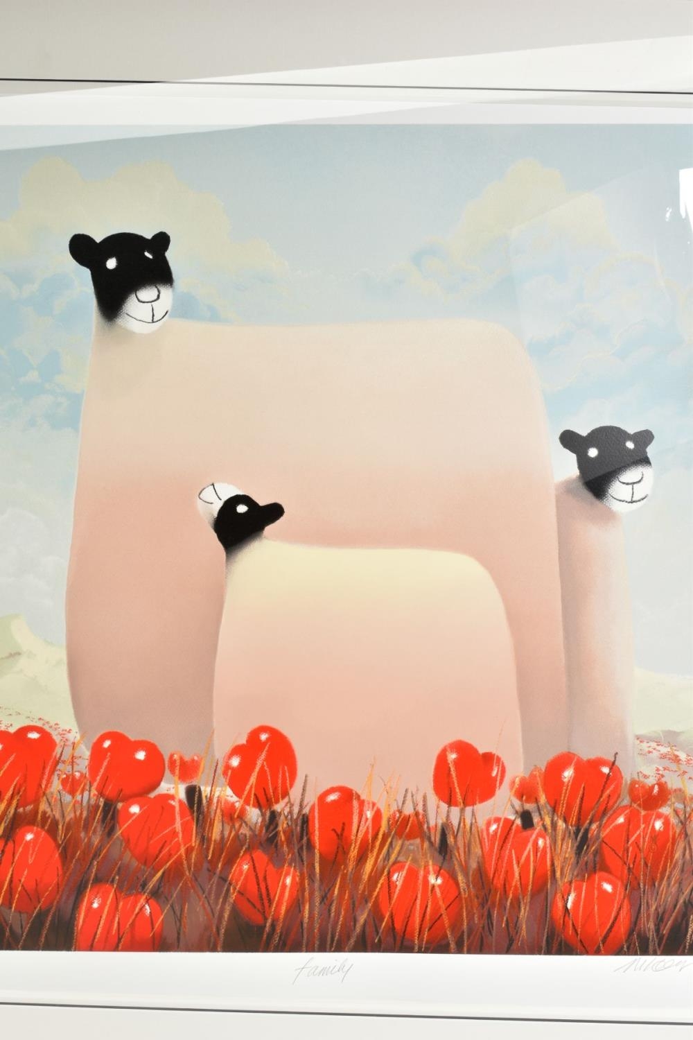 MACKENZIE THORPE (BRITISH 1956) 'FAMILY', a limited edition print 32/95 depicting a ewe and two lambs, signed to lower margin, with certificate, mounted, framed and glazed, approximate sizes: image 77cm x 68cm, frame 104cm x 104cm (condition: print in good condition, but is loose in the mount, frame in good condition) (A)