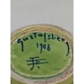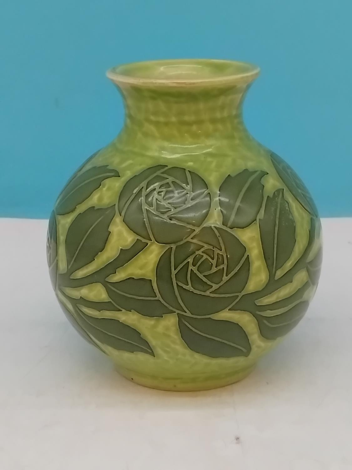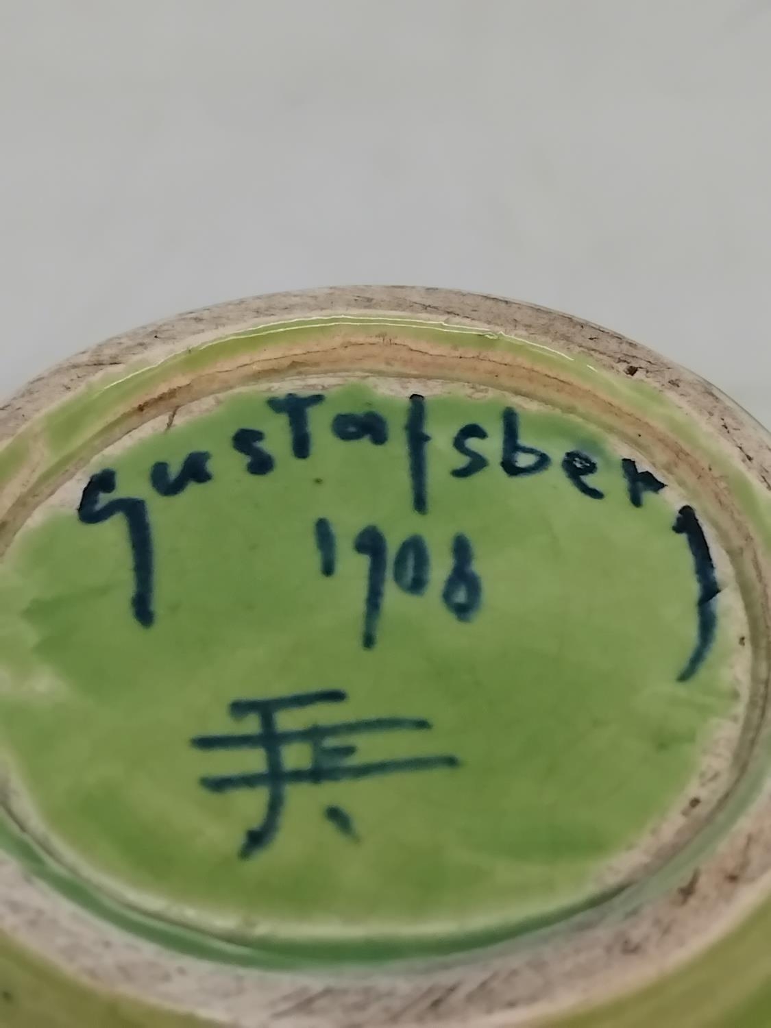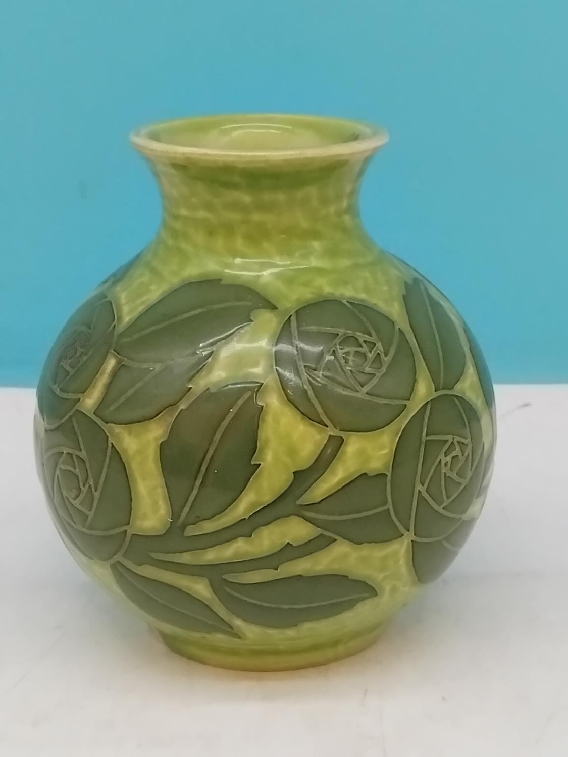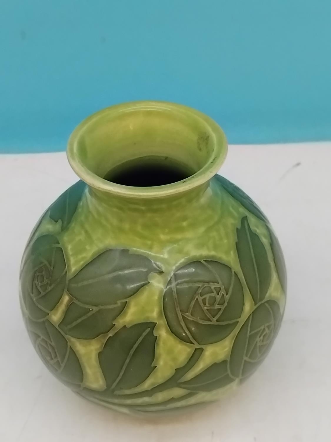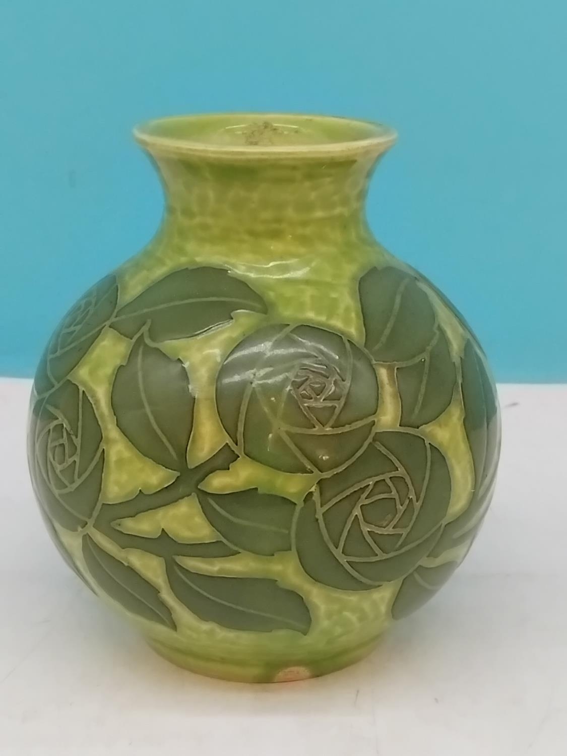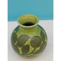 Gustavsberg Sgraffito Art Nouveau Green on Green Floral Decorated 12cm Vase by Josef Ekberg. Signed to Base. Dated 1906. Overglazed Factory Fault to Base.