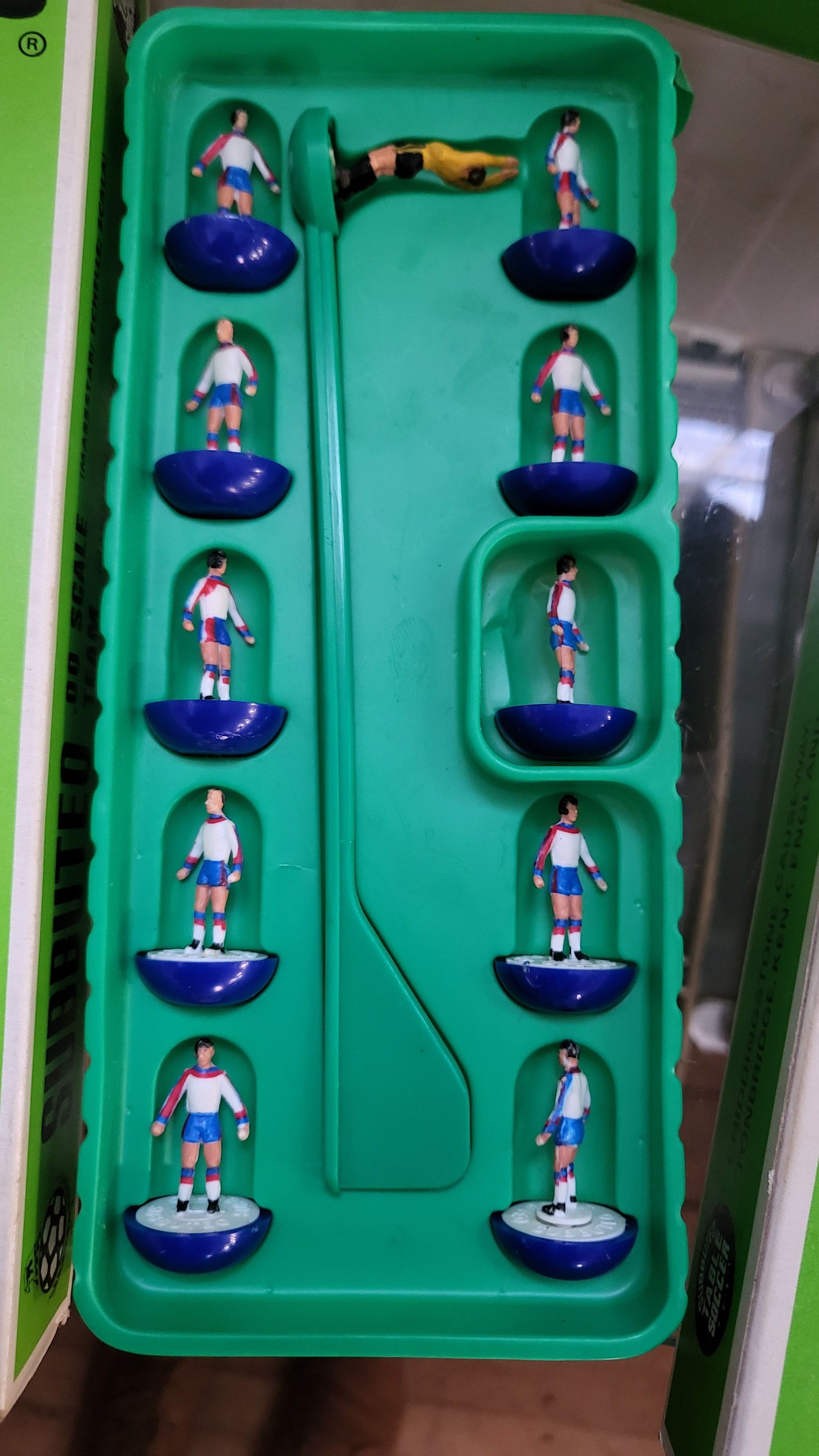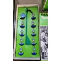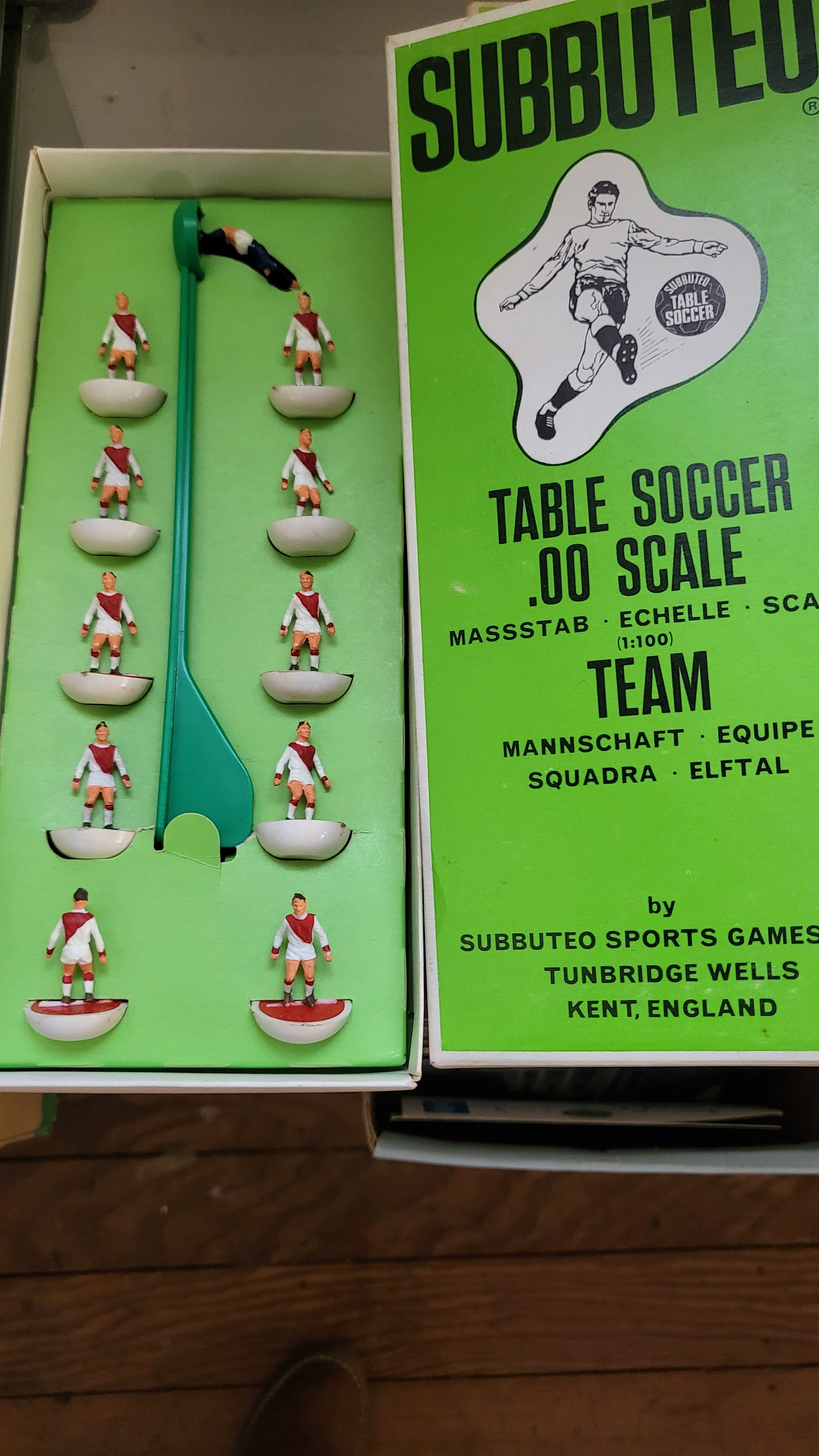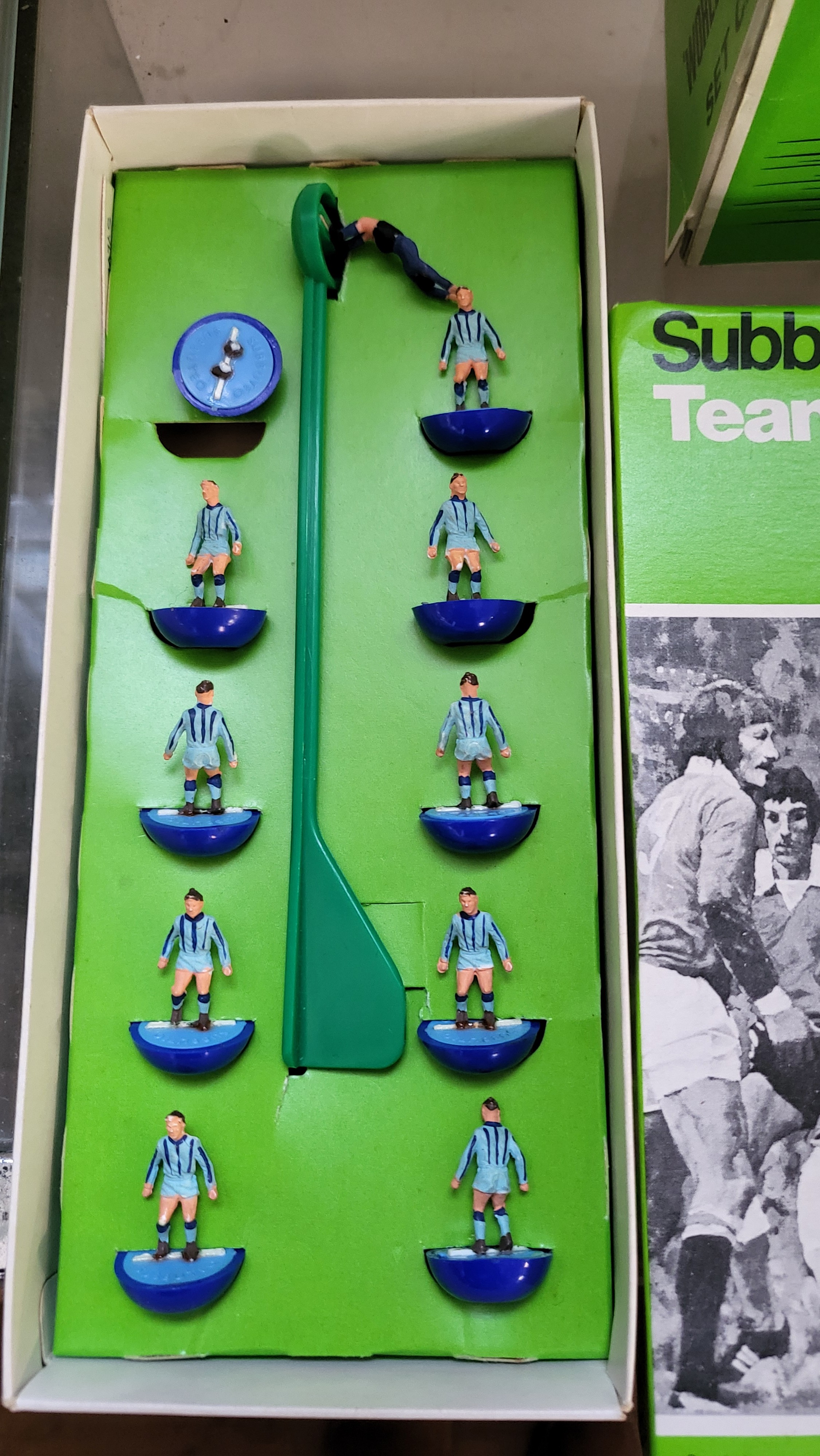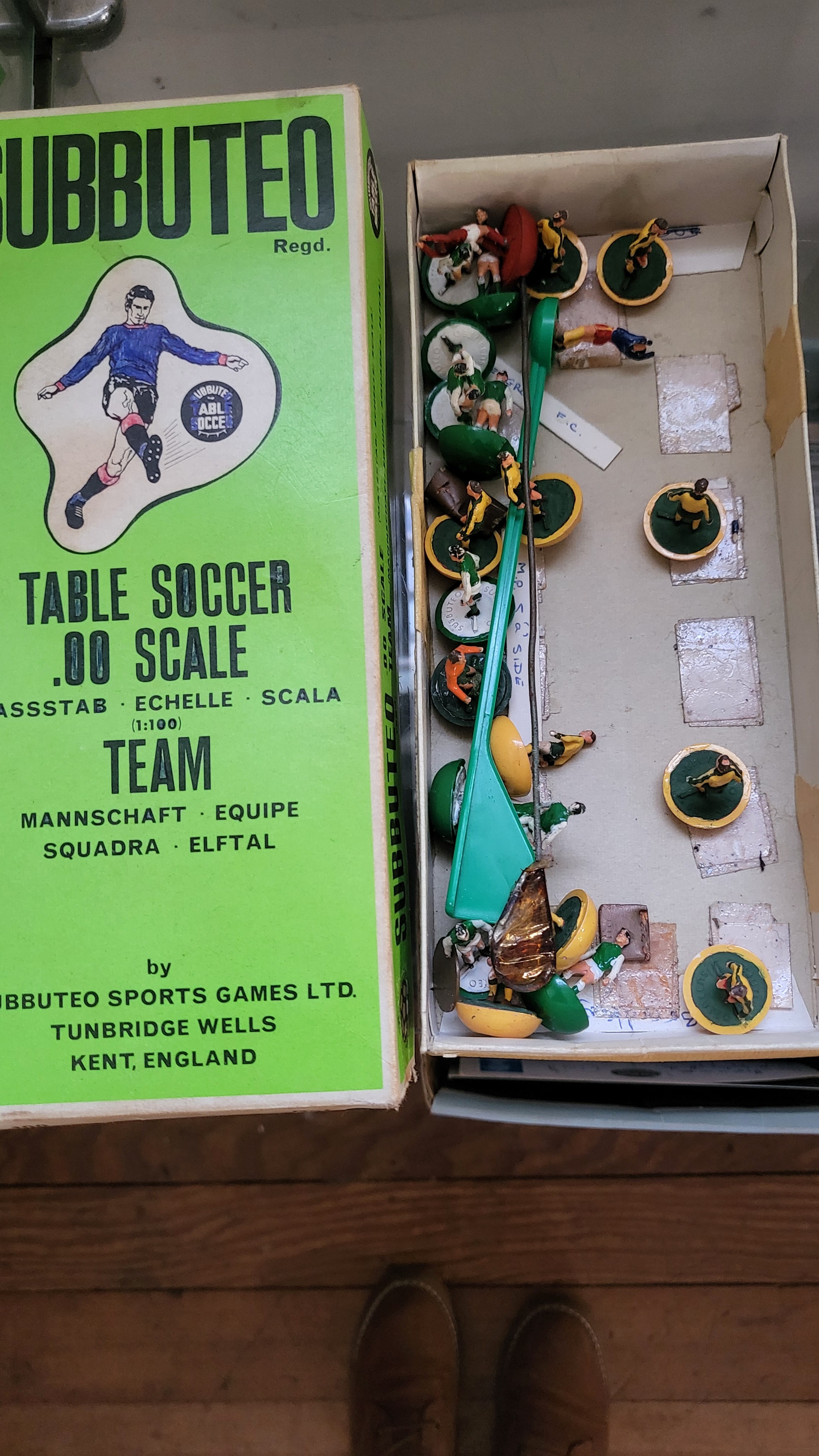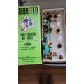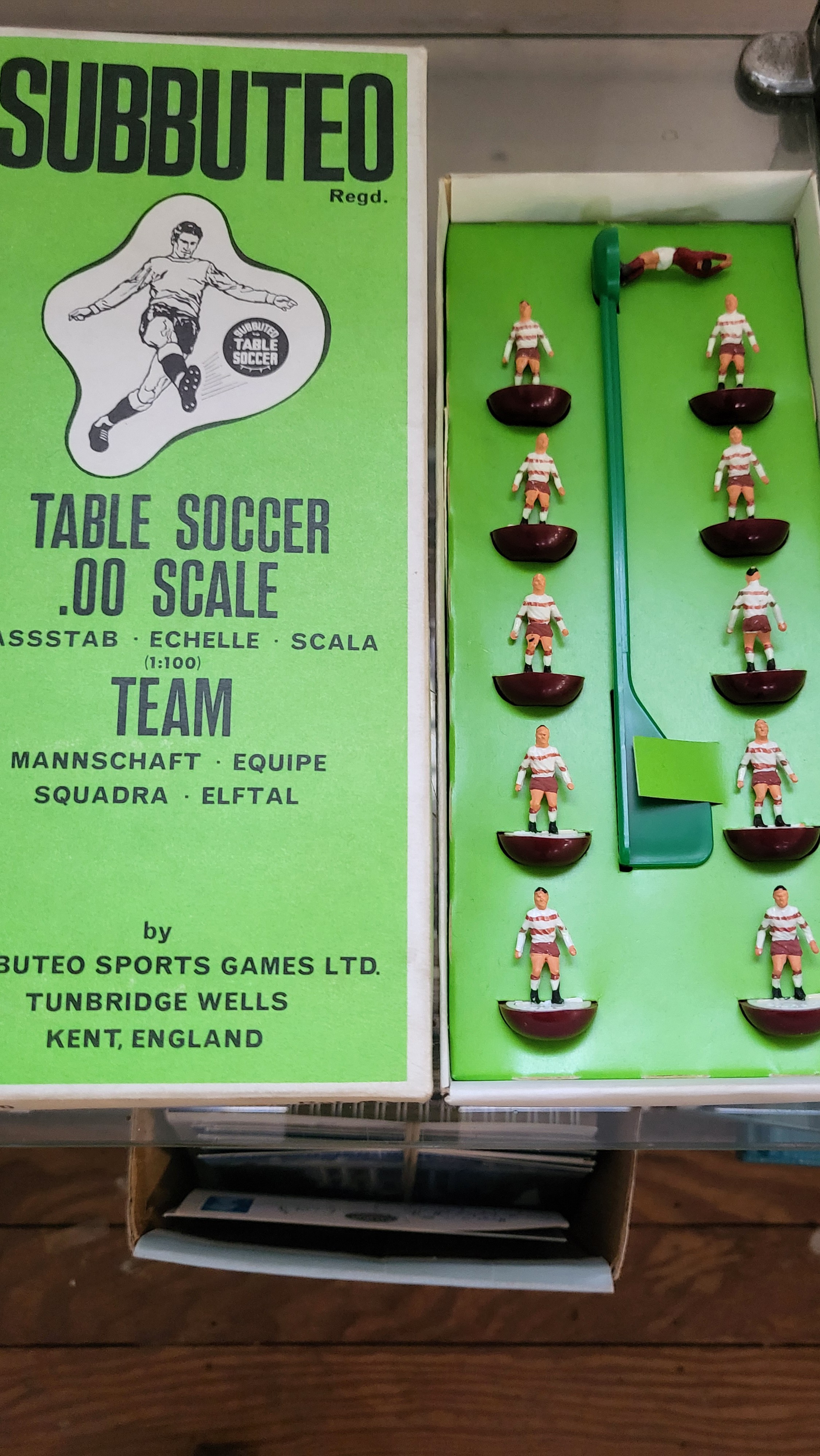 Subbuteo OO scale football figures in boxes, components, three pitch cloths, and 1978 catalogue.