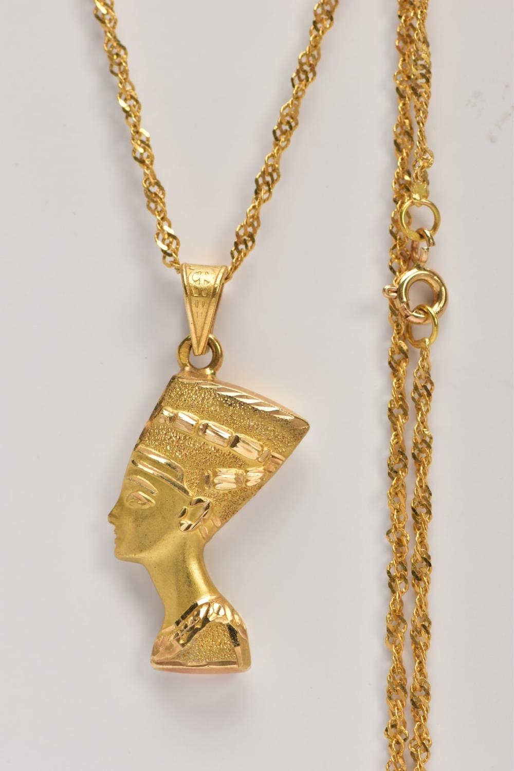 A YELLOW METAL PENDANT NECKLACE, the pendant in the form of the Egyptian Queen Nefertiti fitted with a tapered bail, Egyptian control marks, suspended from a fine curb link twist chain, fitted with a spring clasp, stamped '750', length 600mm, approximate gross weight 6.1 grams