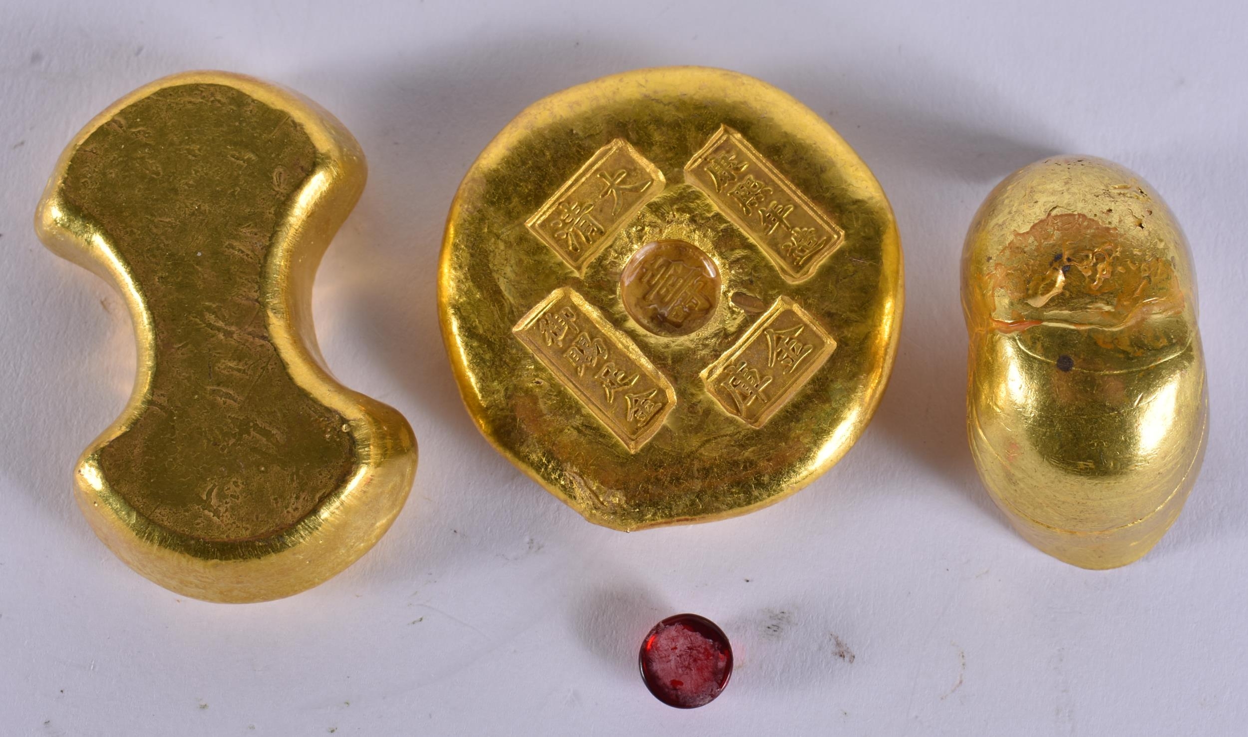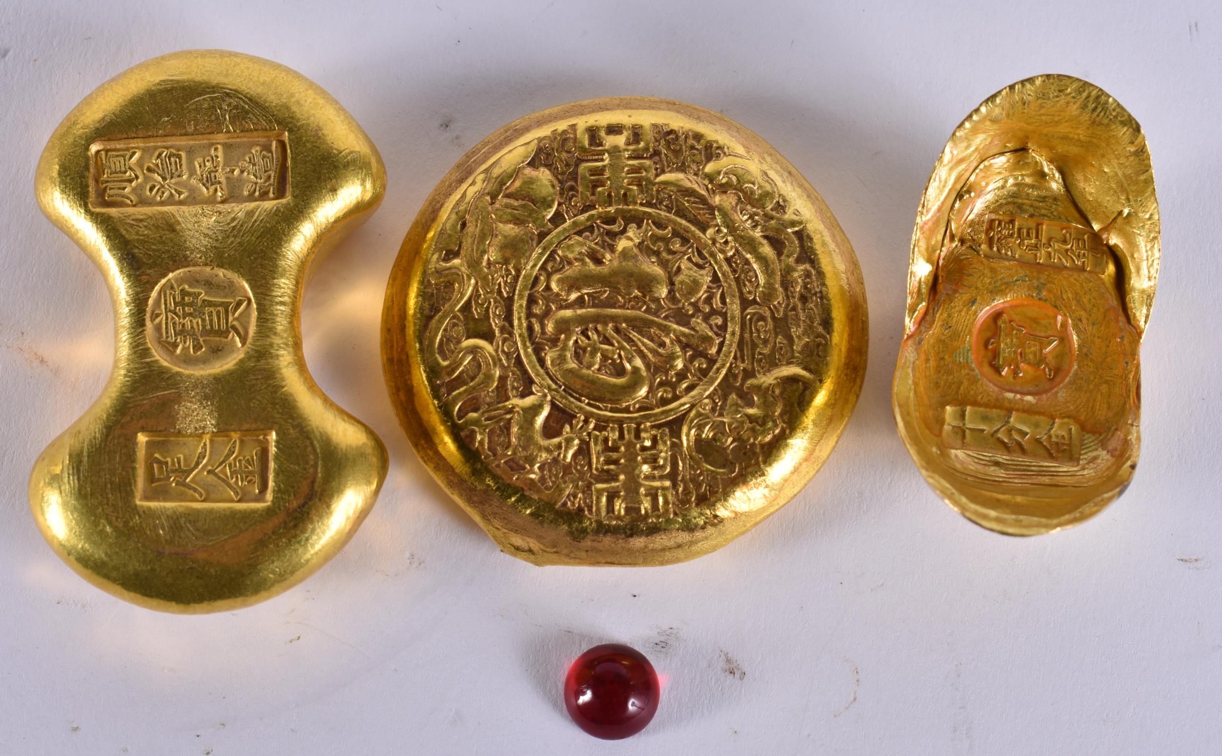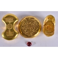 THREE CHINESE YELLOW METAL SCROLL WEIGHTS. 375 grams. Largest 5 cm wide. (3)