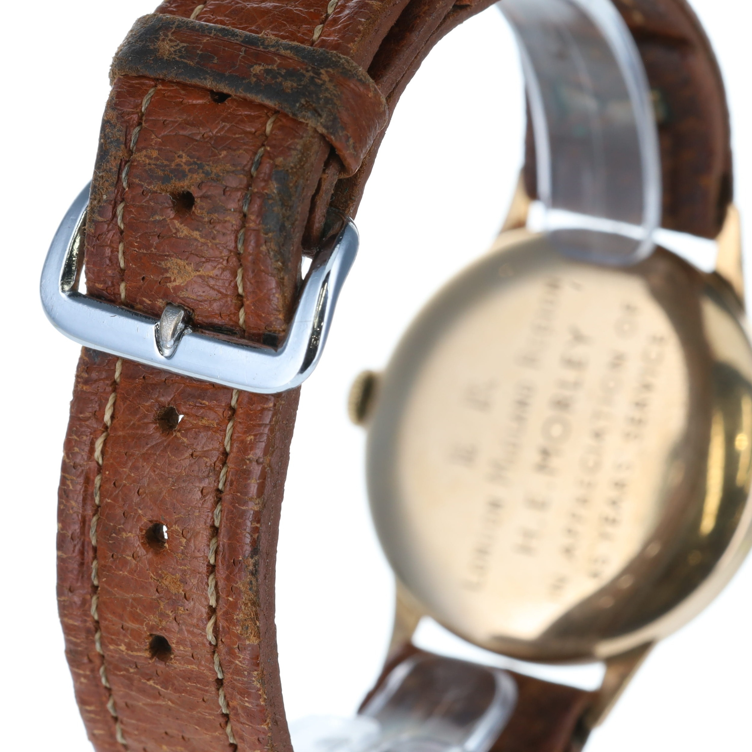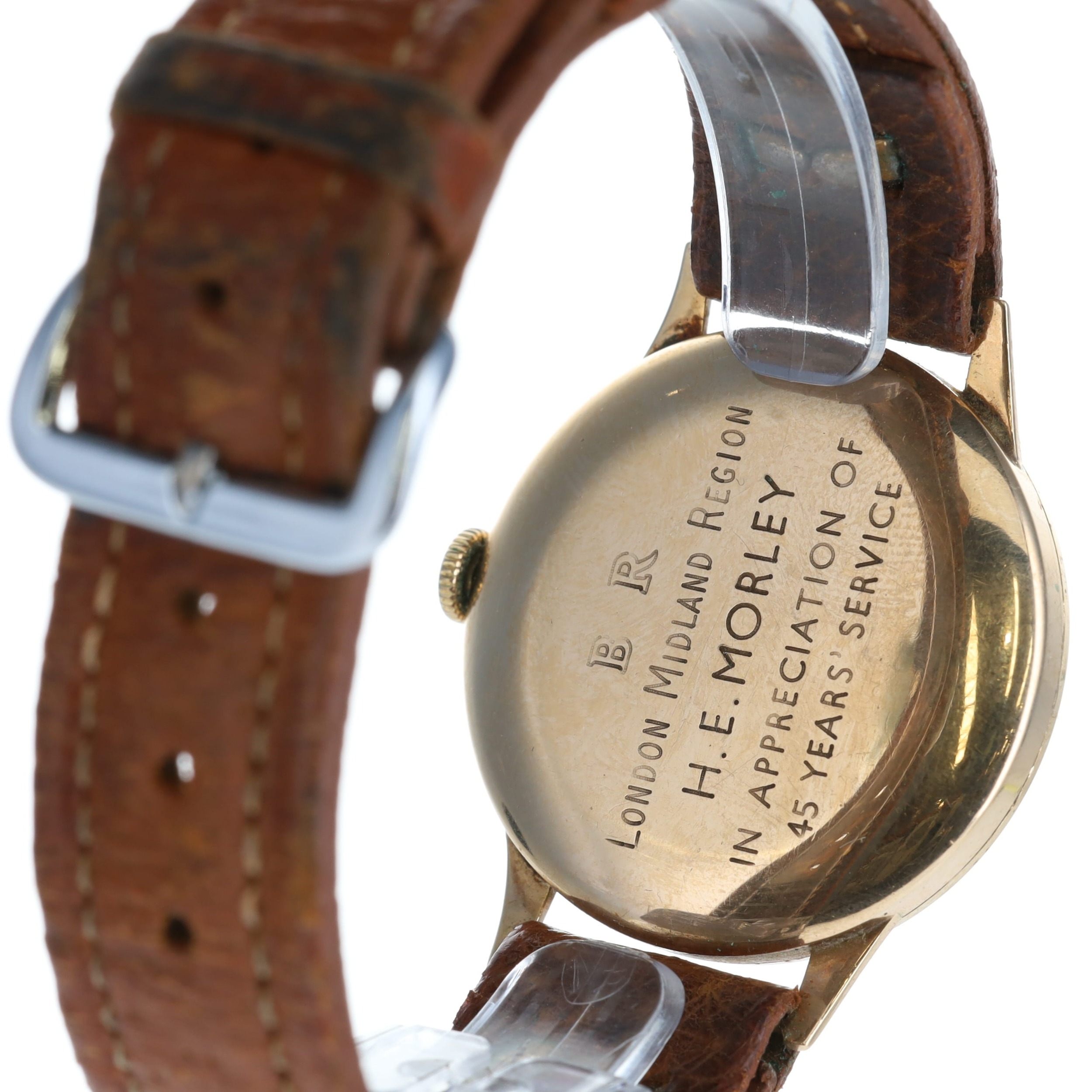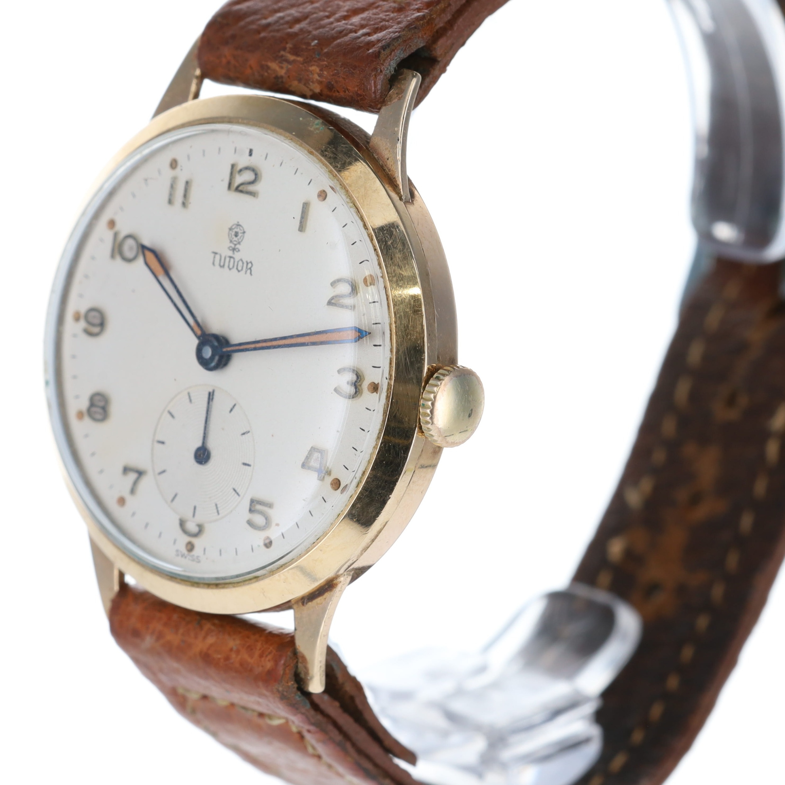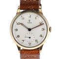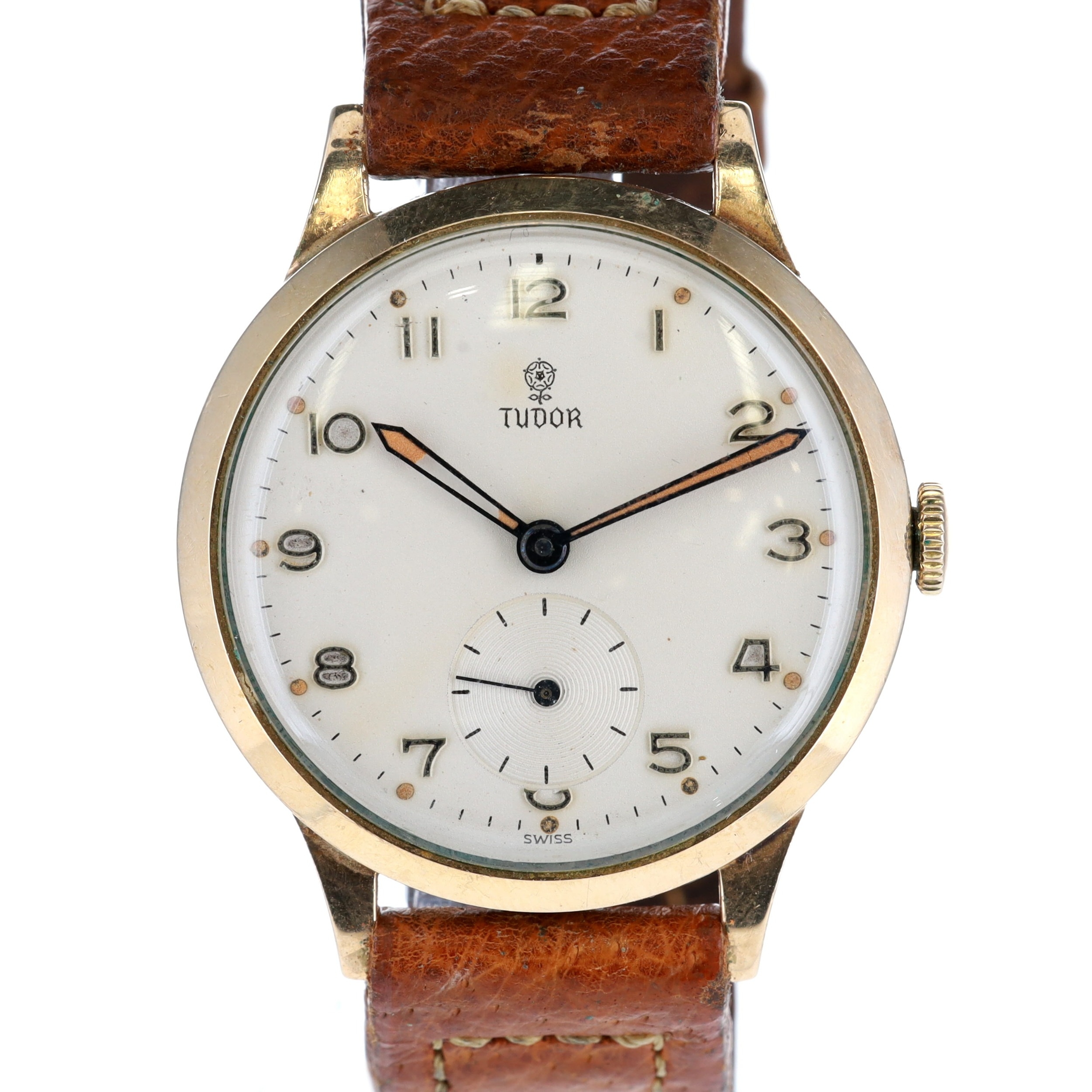 Tudor - 9ct Railway Presentation Manual Wind Dress Watch. Tudor Cal. 1260 17 Jewels manual wind movement. 9ct yellow gold Rolex made case, aftermarket brown leather strap. Off white dial featuring gold tone Arabic numerals with lumed dots, sub-second dial at 6 o'clock. Dial signed signed 'Tudor' in black font. Caseback signed with presentation message for 45 years service at the British Rail. No box or papers. Works well, winds up and holds time.