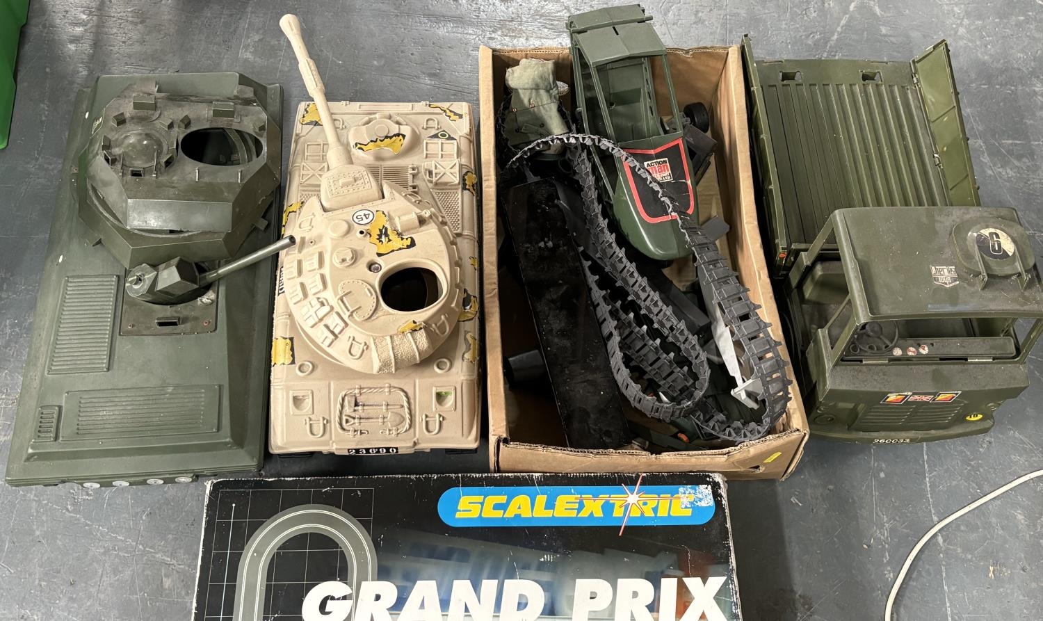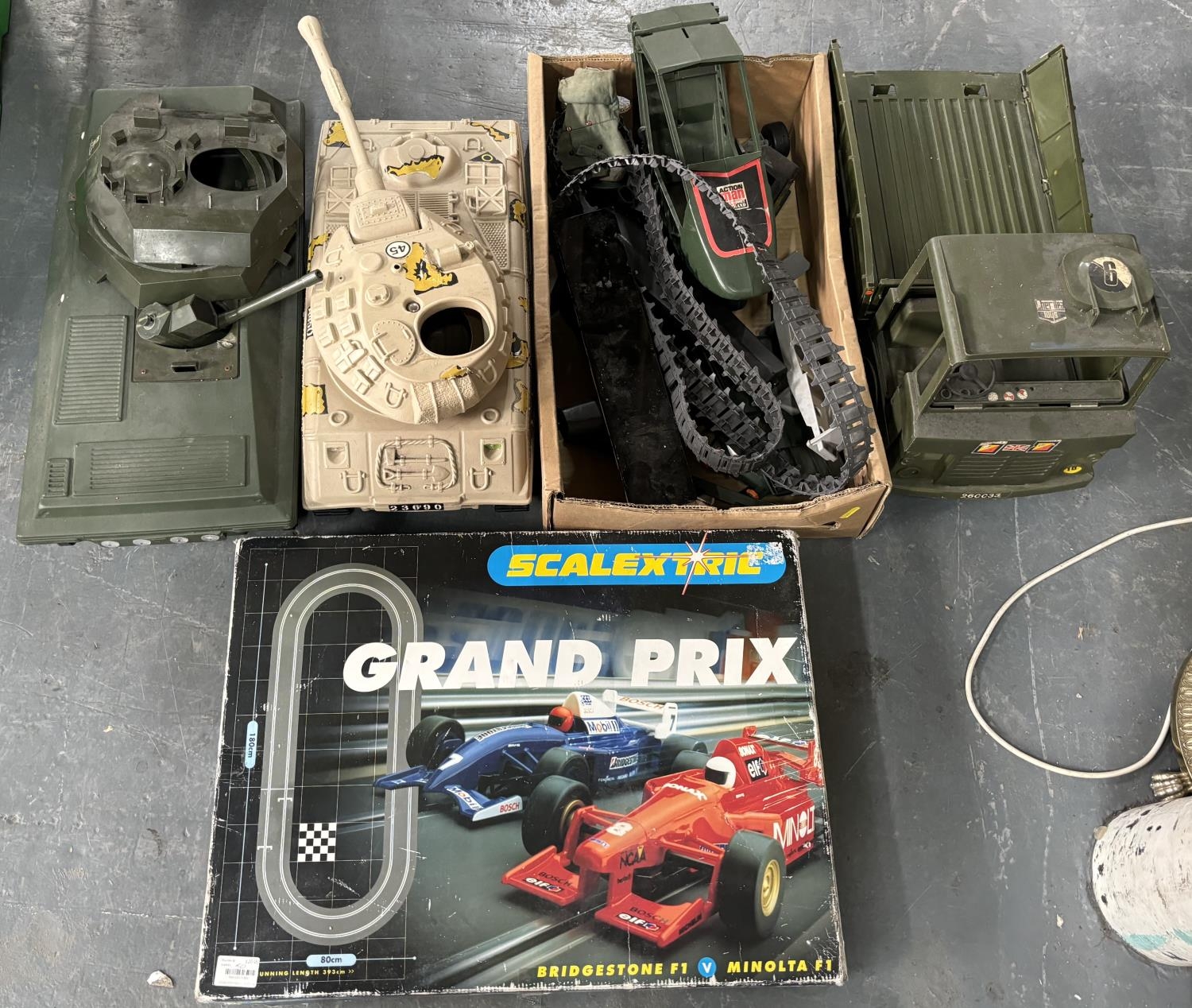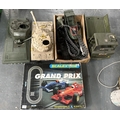 2 Toy tanks with jeep and other and boxed Scalextric Grand Prix