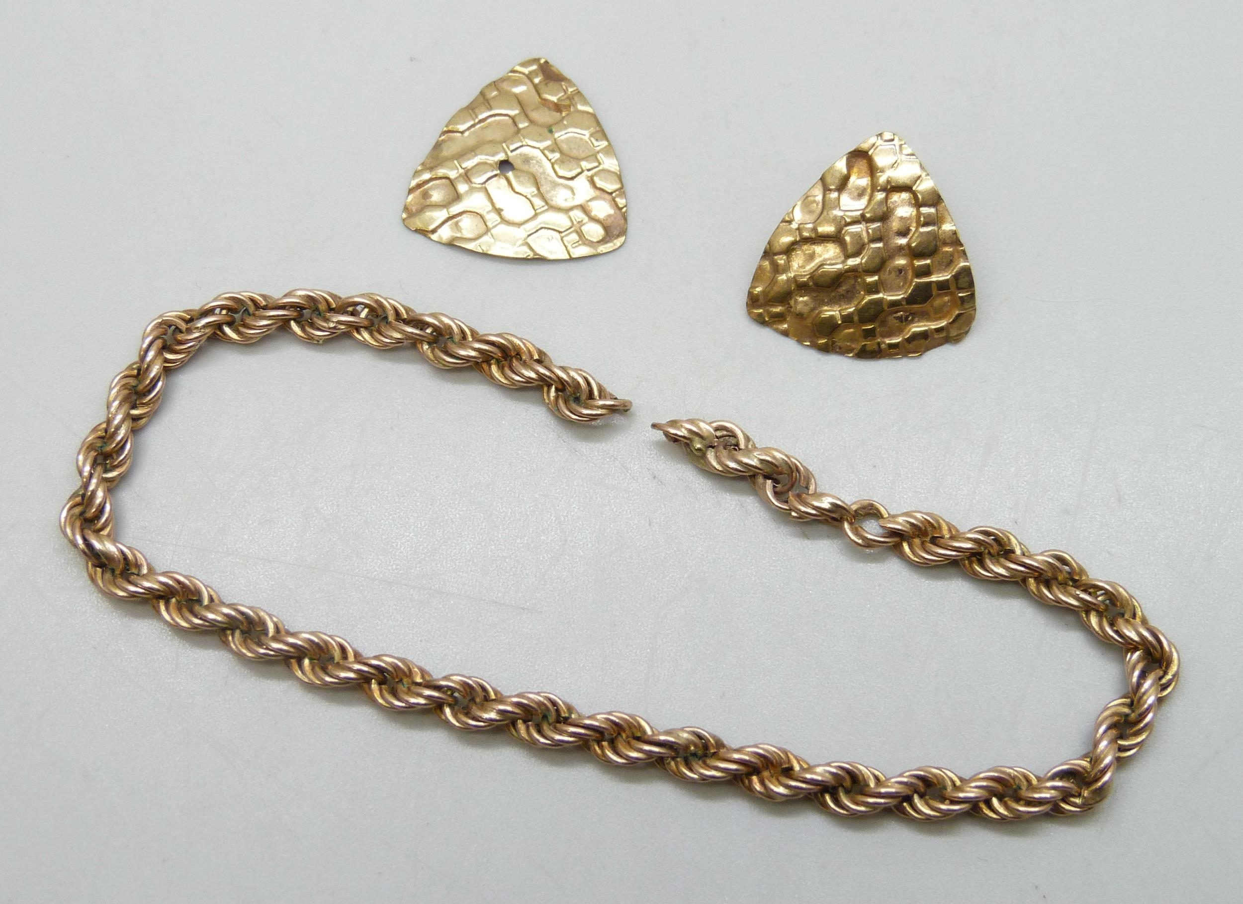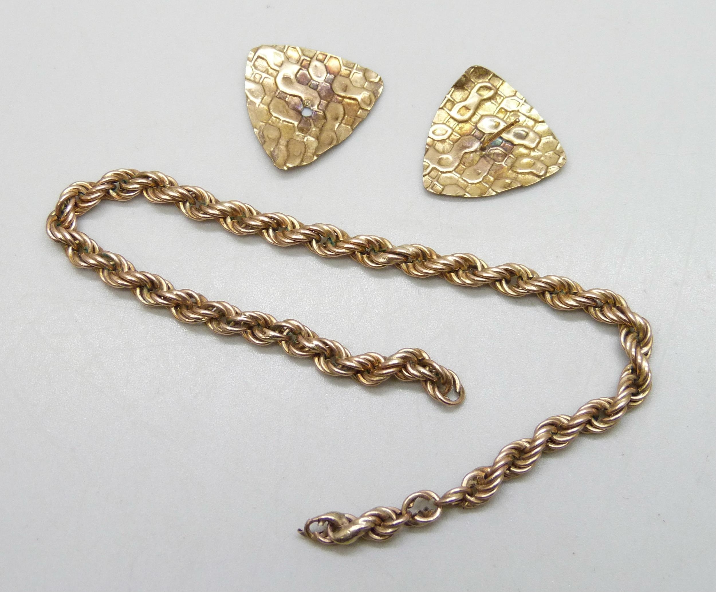 A yellow metal rope chain, and a pair of 9ct gold earrings, both a/f, 7.6g total weight