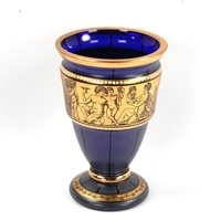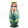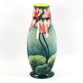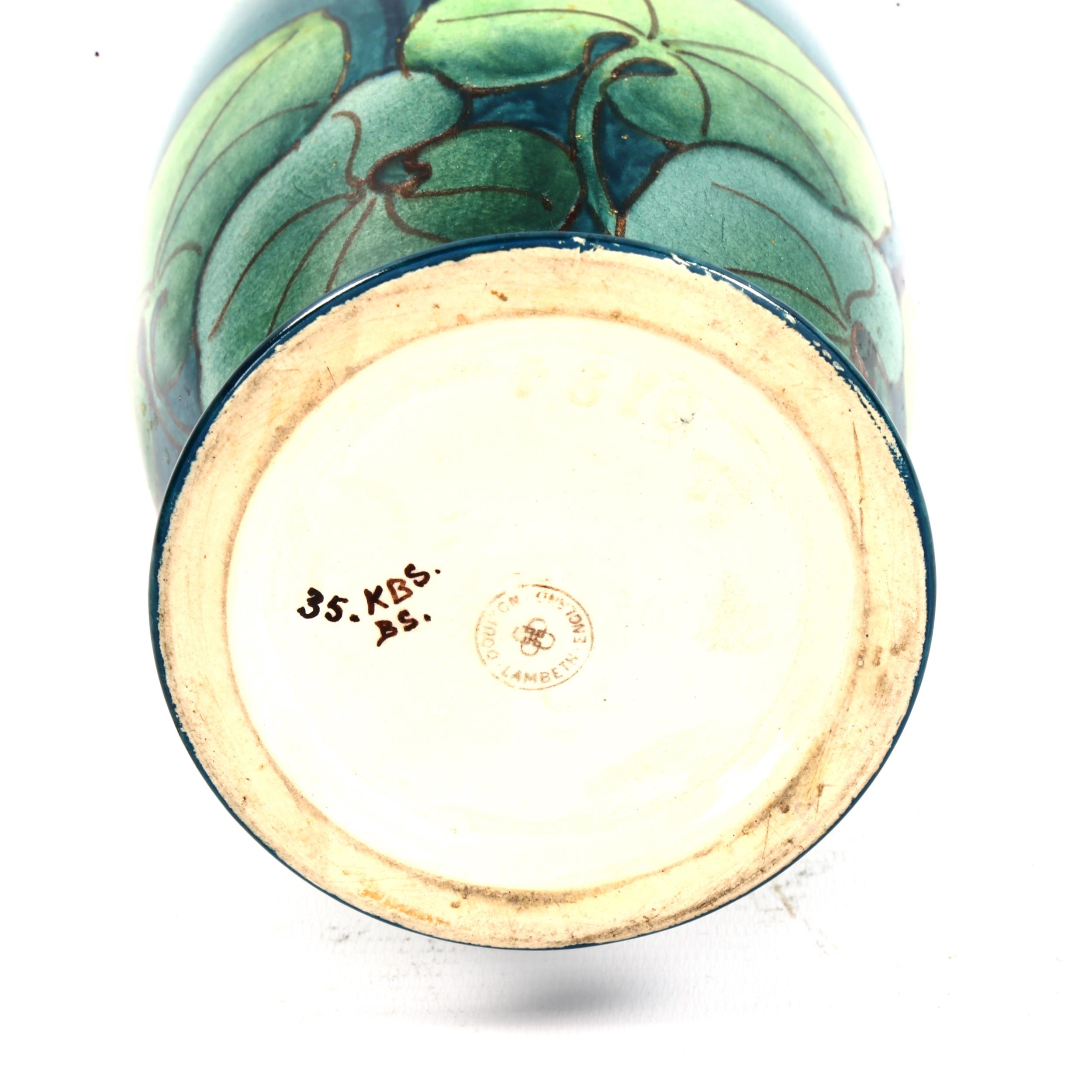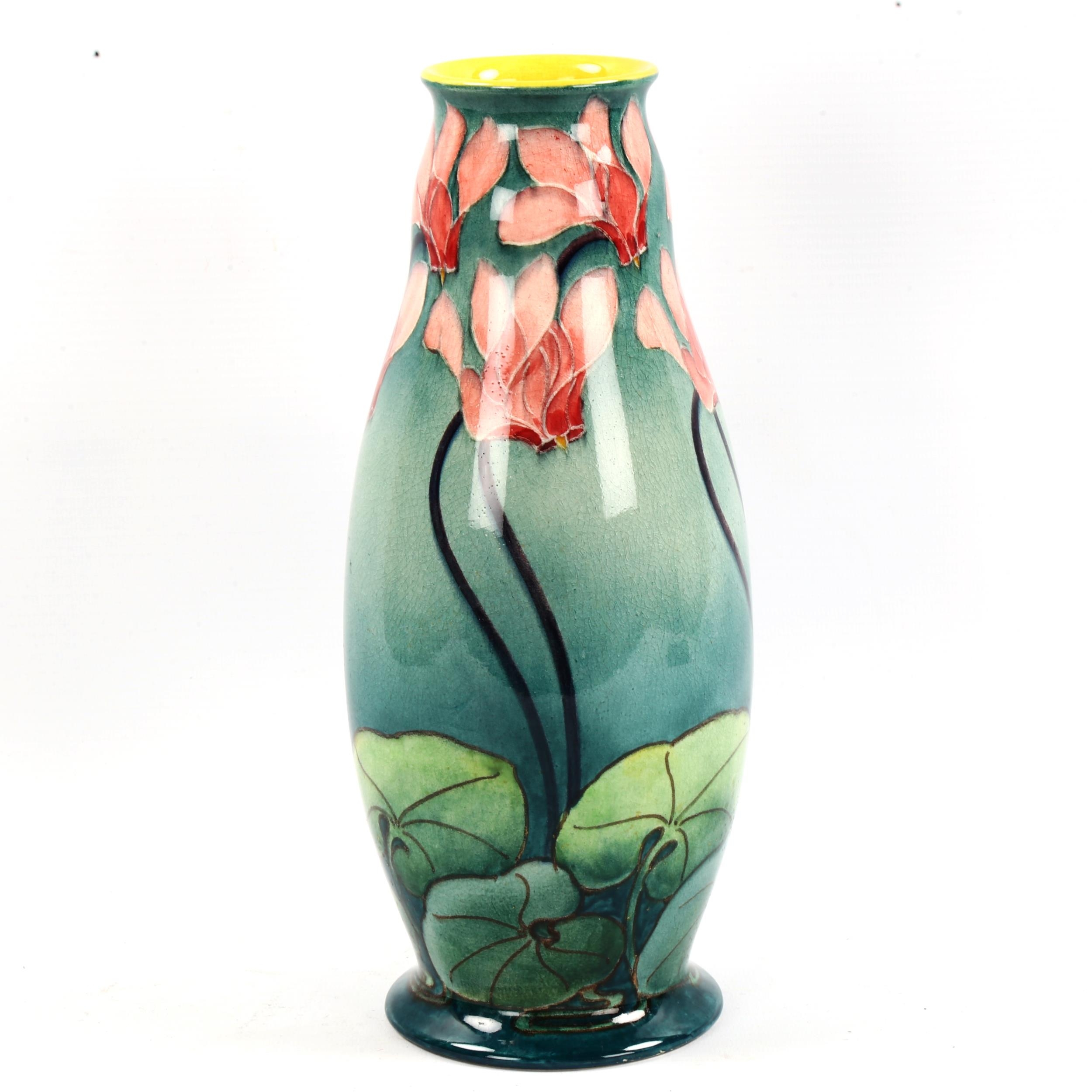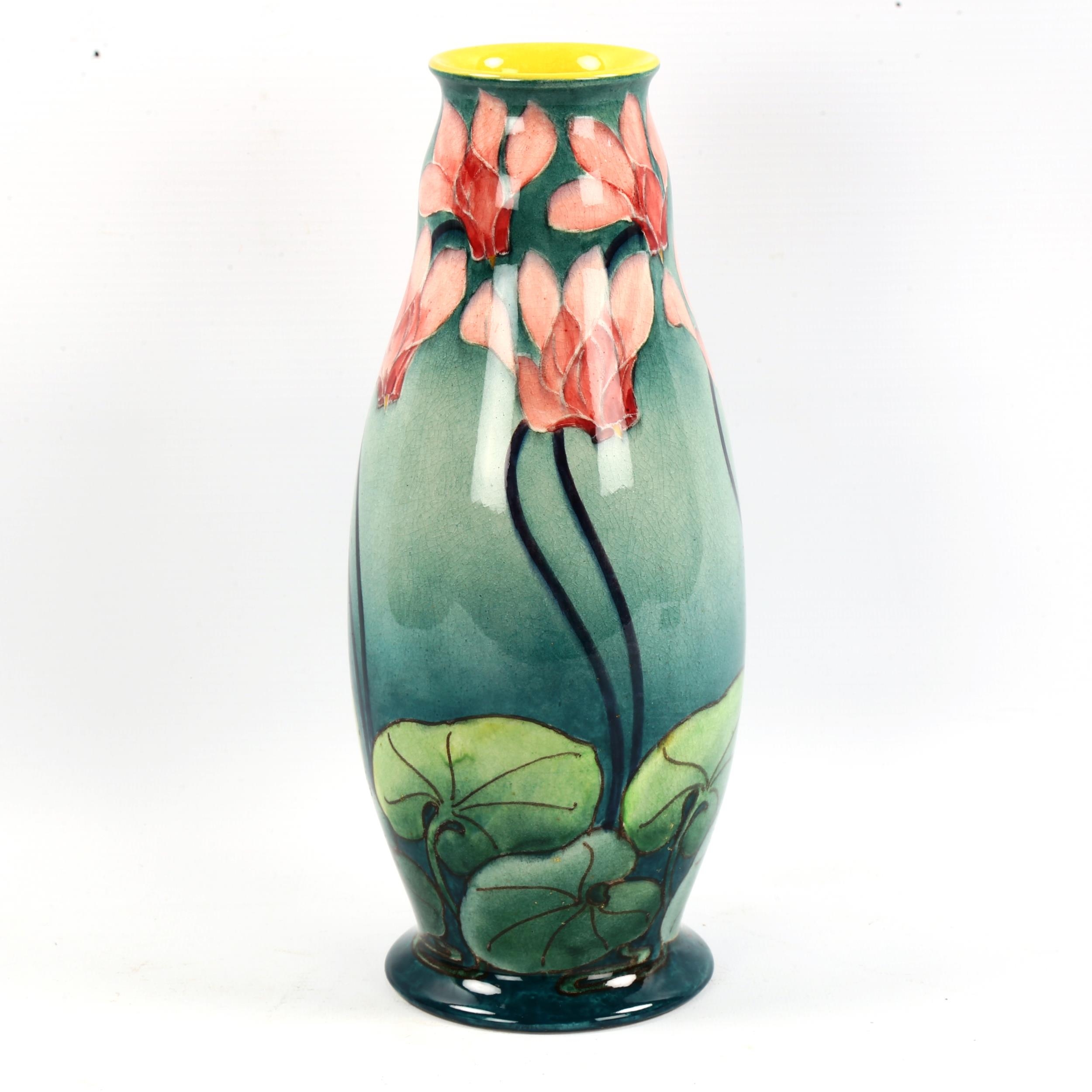 Doulton Lambeth faience baluster vase, late 19th century, hand painted cyclamen on green ground, height 27cm