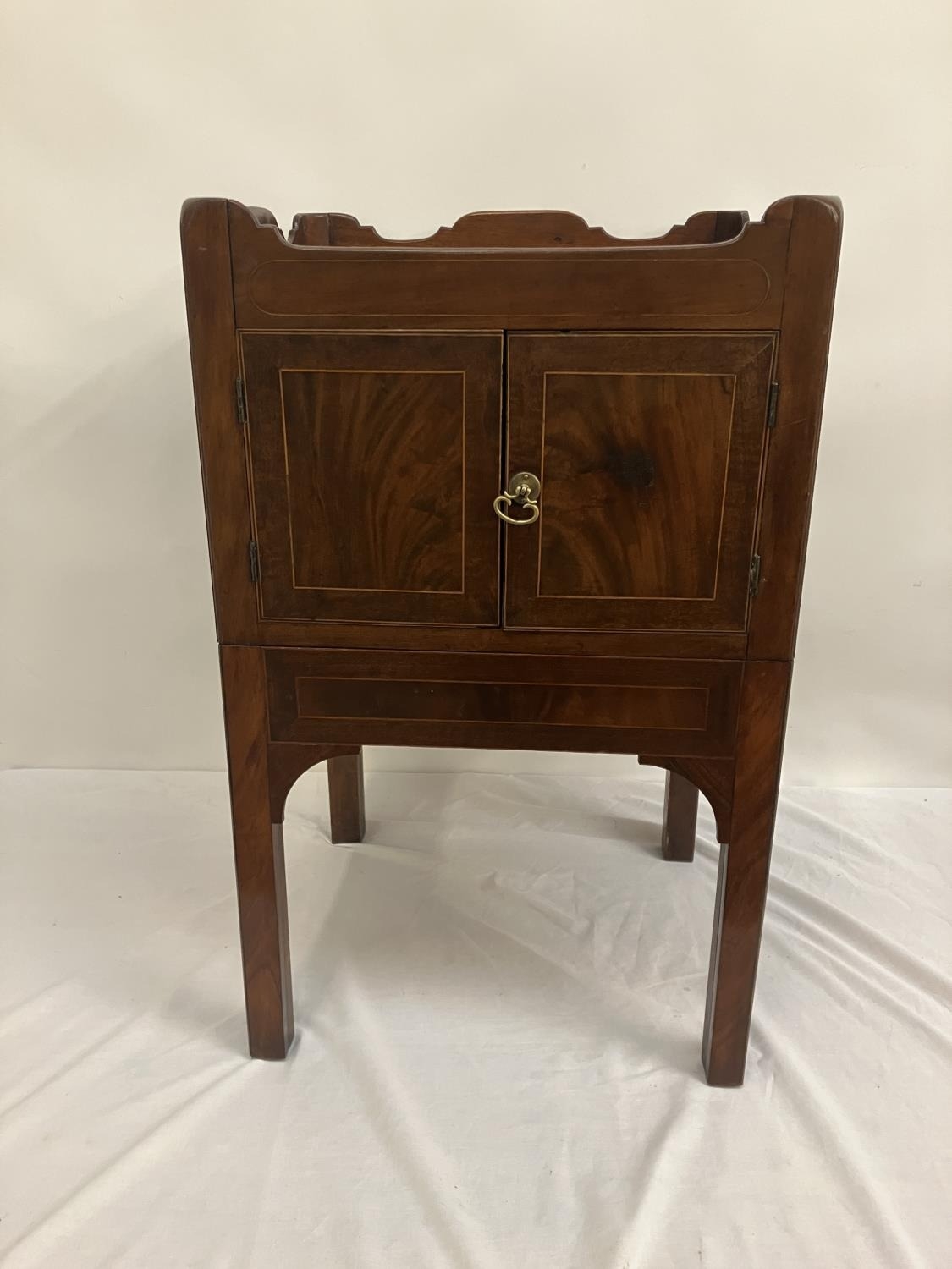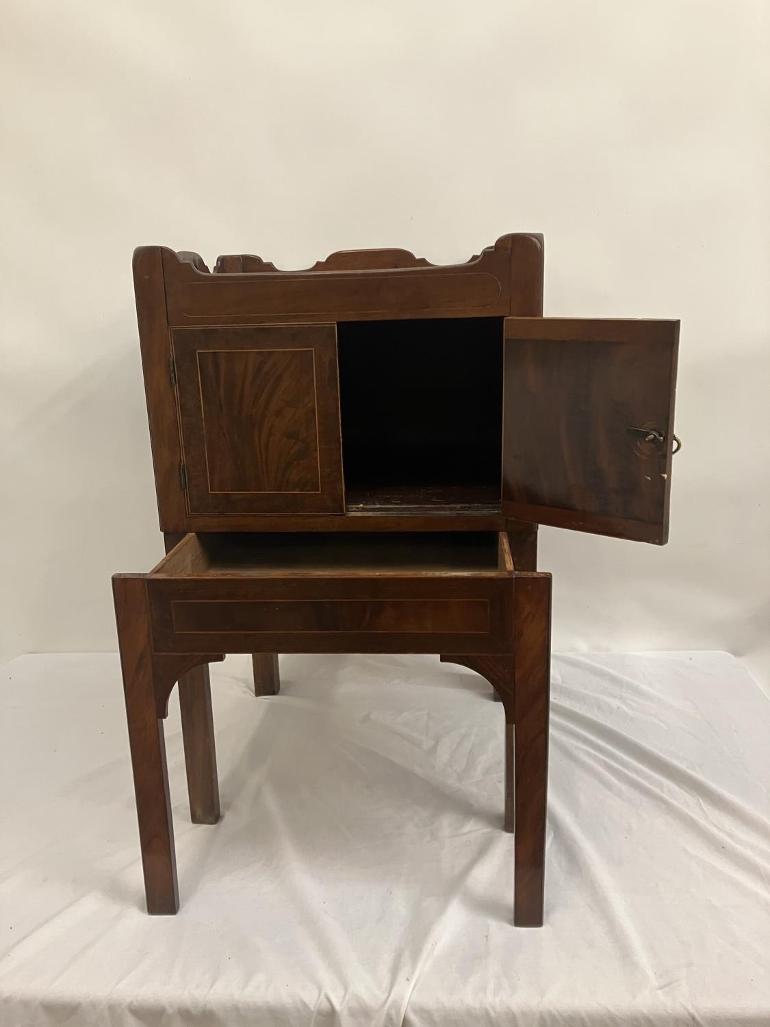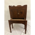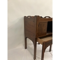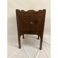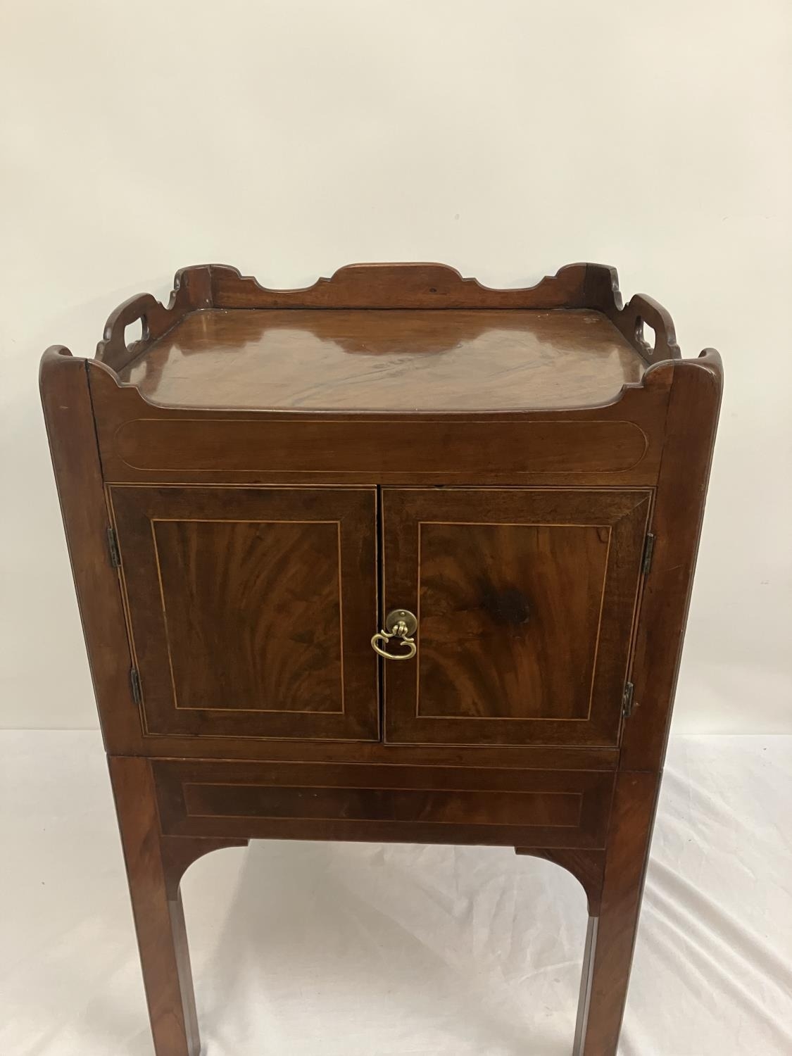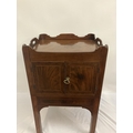 Georgian mahogany bedside locker or lamp table, the gallery top over two cupboard doors and slim drawer and raised on square legs. W. 50cm, D. 45cm, H. 80cm approx.