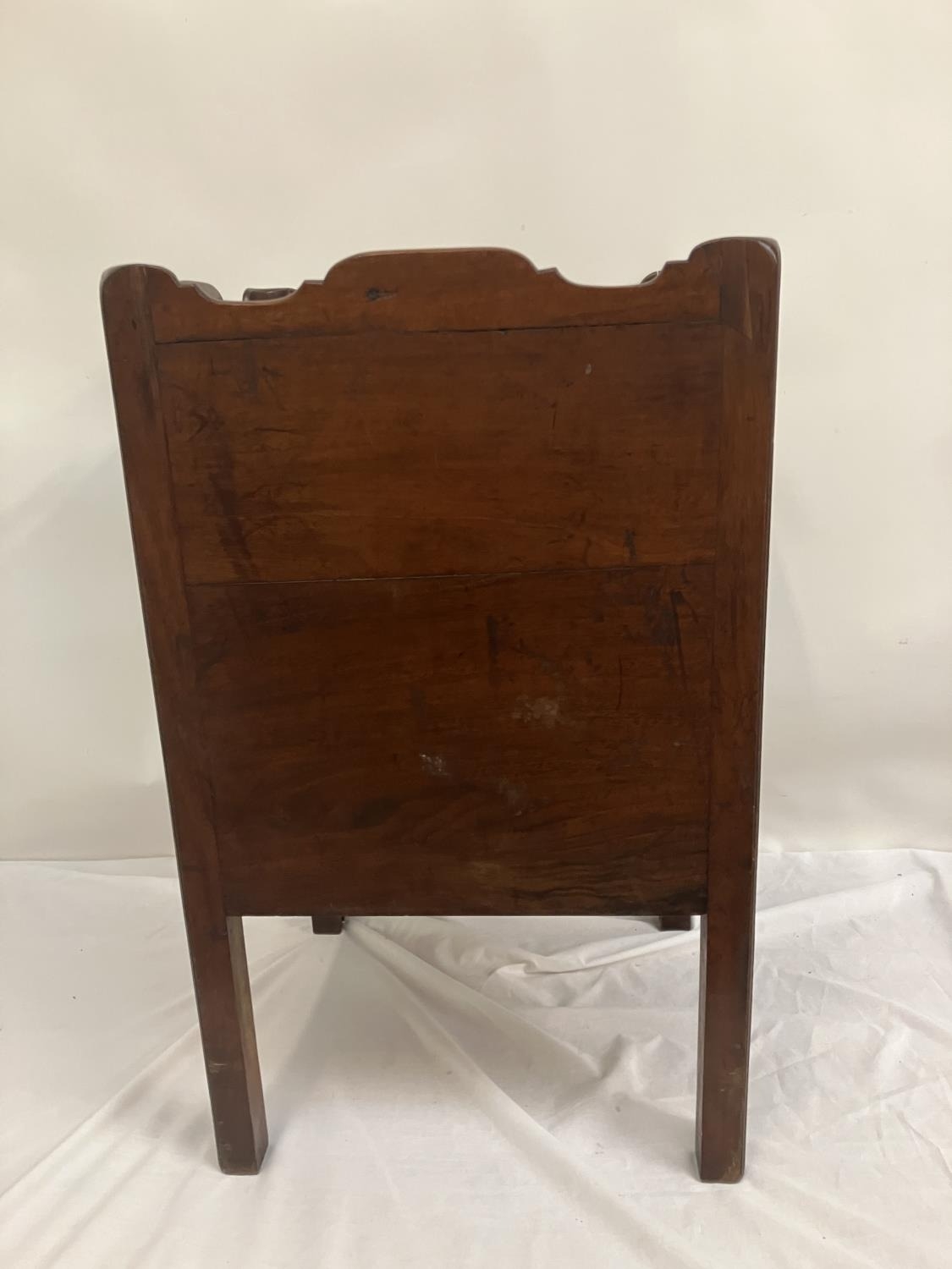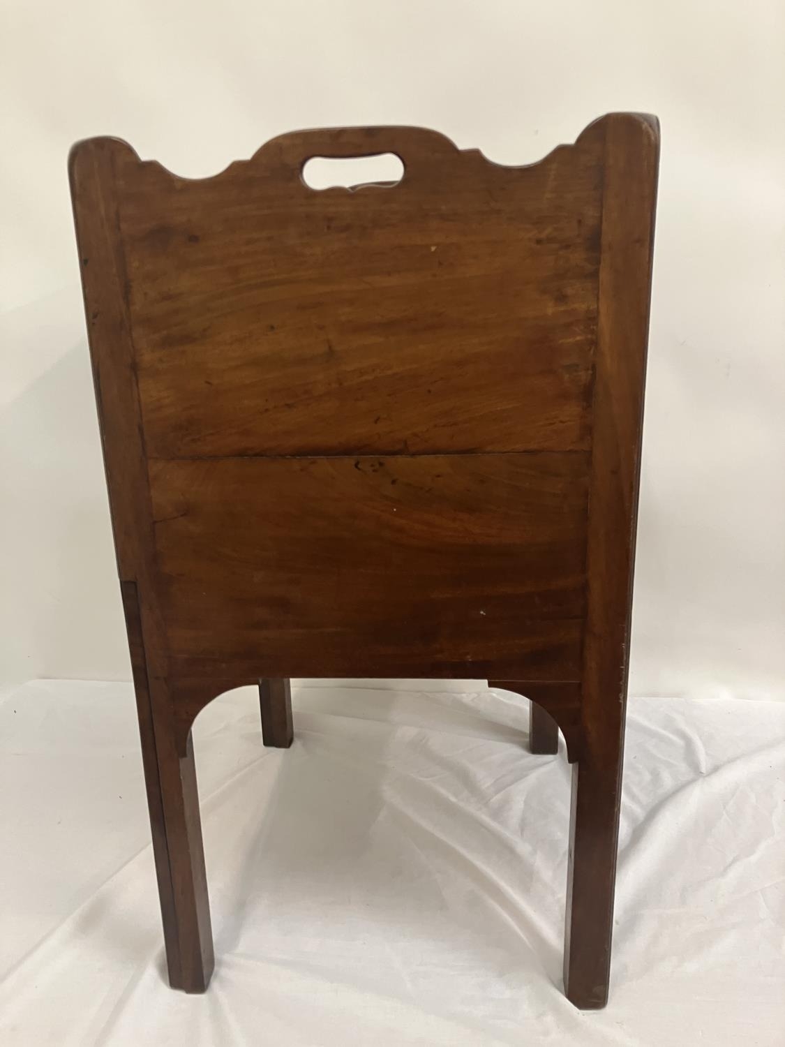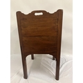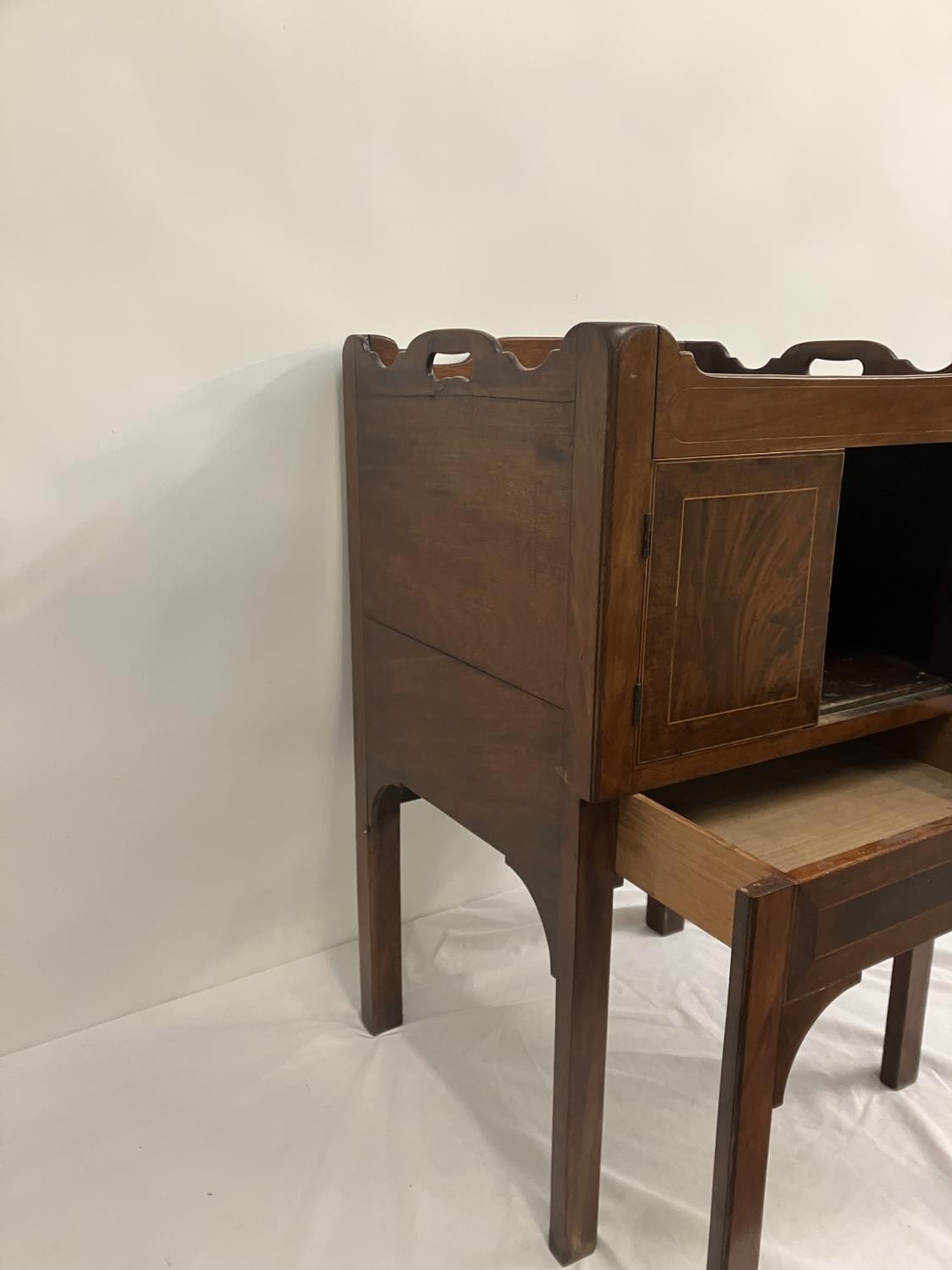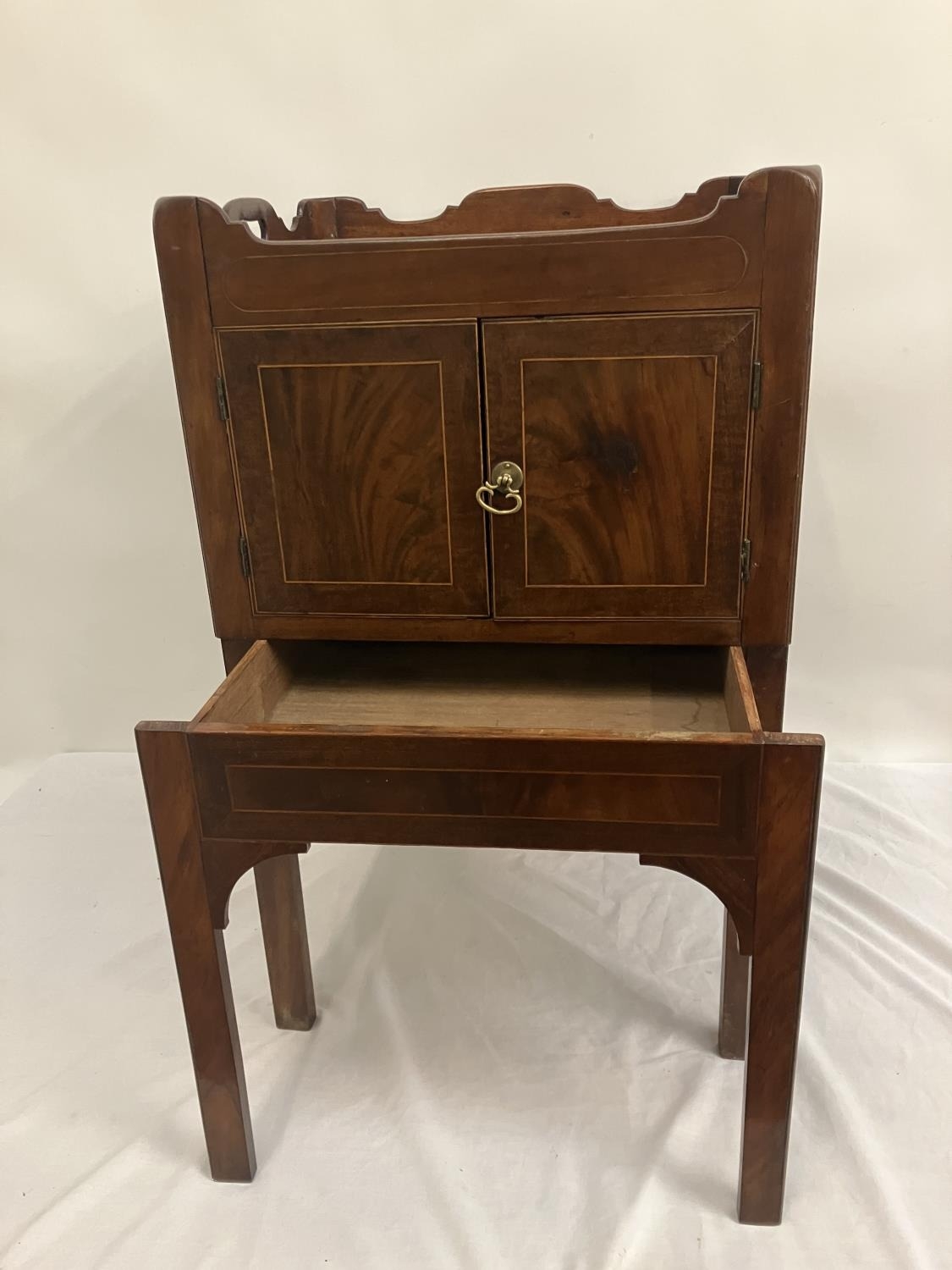 Georgian mahogany bedside locker or lamp table, the gallery top over two cupboard doors and slim drawer and raised on square legs. W. 50cm, D. 45cm, H. 80cm approx.