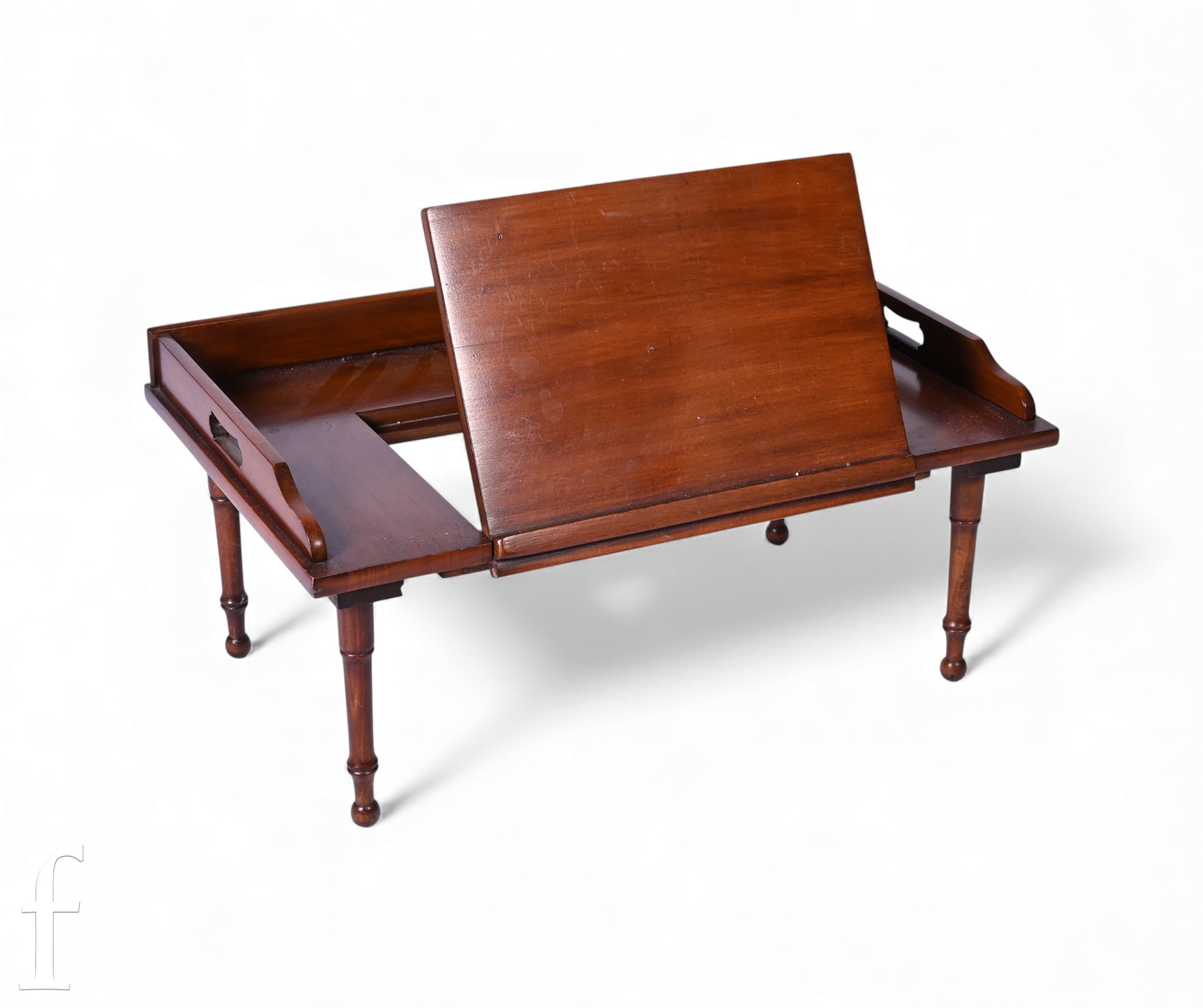 A reproduction mahogany lap table or desk, the gallery sides with pierced grip handles with a central ratcheted slope over turned legs, height 29cm, width 64cm and depth 41cm.