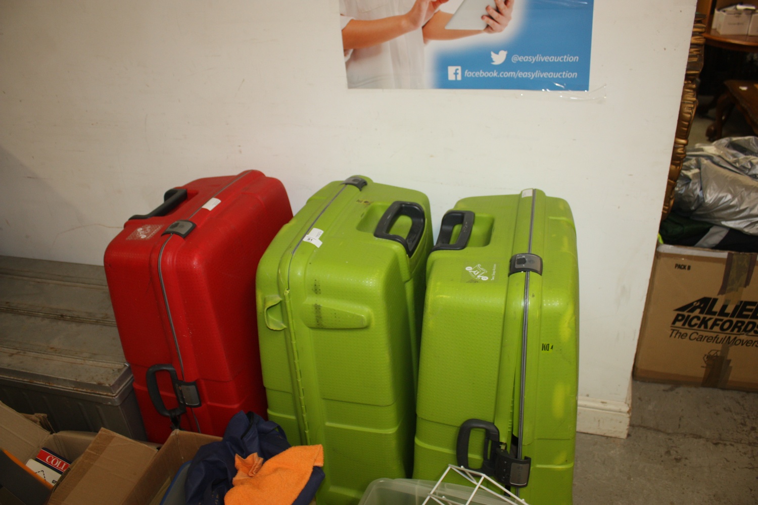 Three Hard Plastic Combination Suitcases: Two in Lime Green and One in Red