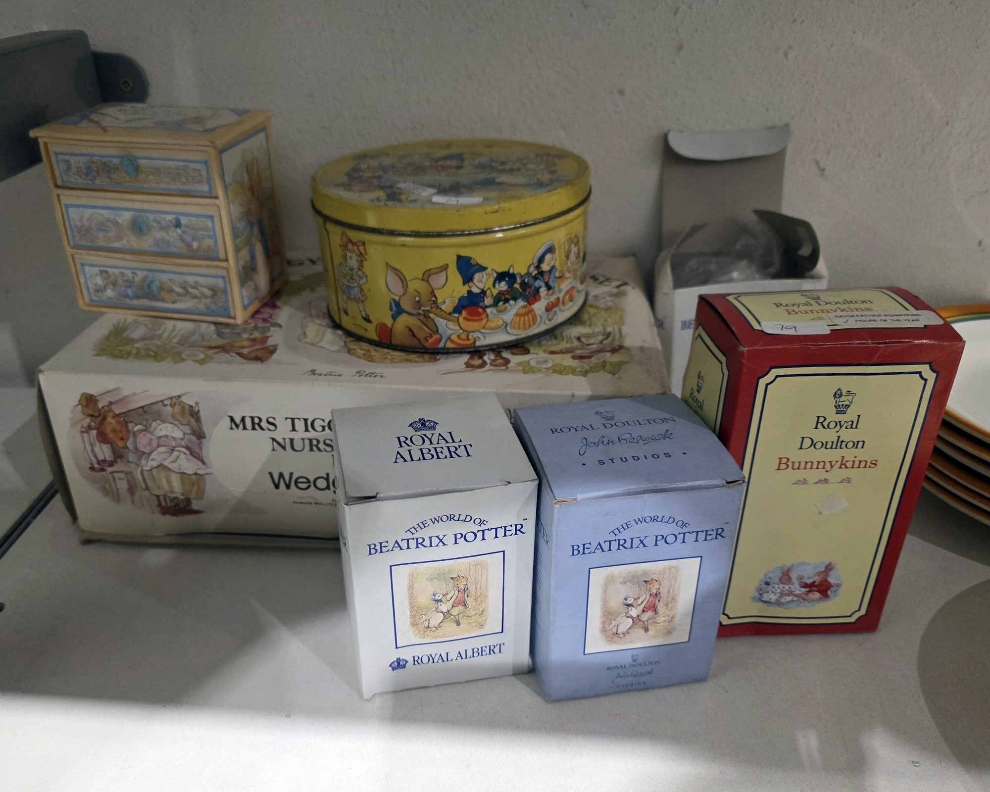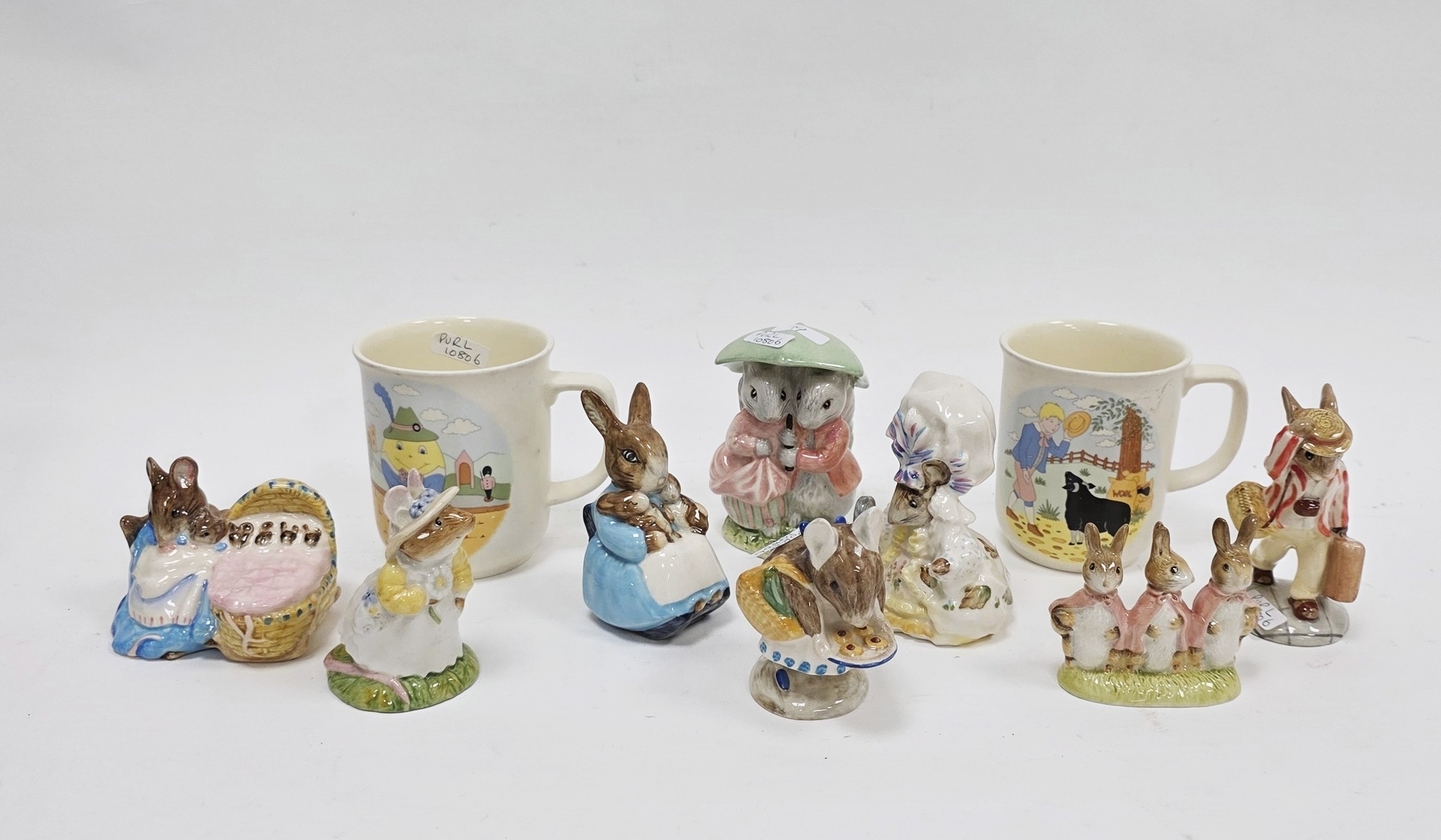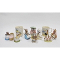 Collection of Beatrix Potter figures including Royal Albert Goody and Timmy Tiptoes, Royal Doulton Primrose Woodmouse, Royal Albert Flopsy, Mopsy and Cottontail, Beswick Apperley Dapperley, Beswick Mrs Rabbit Buns, Beswick Lady Mouse, Royal Doulton Father Bunnykins (boxed), Royal Albert Hunka Munka, a Noddy biscuit tin, a Wedgwood Mrs Tigglewinkle nursery set (boxed), various nurseryware mugs and other items