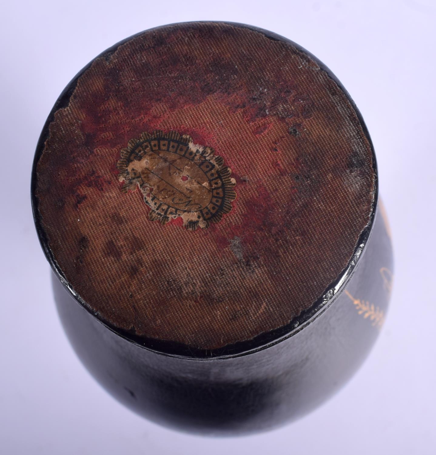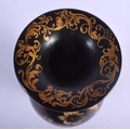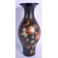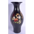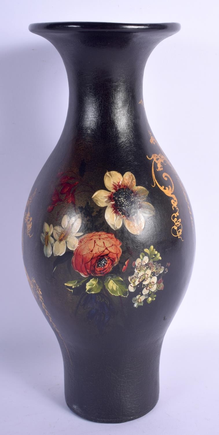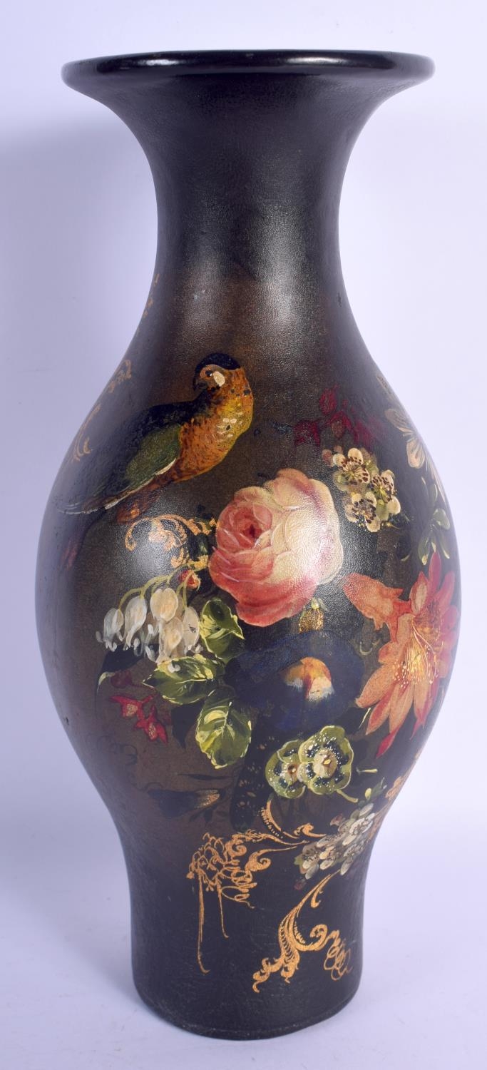 A LARGE EARLY VICTORIAN BLACK LACQUER VASE painted with a bird amongst foliage. 27 cm high.