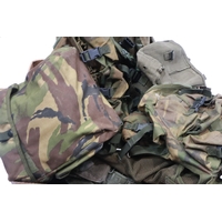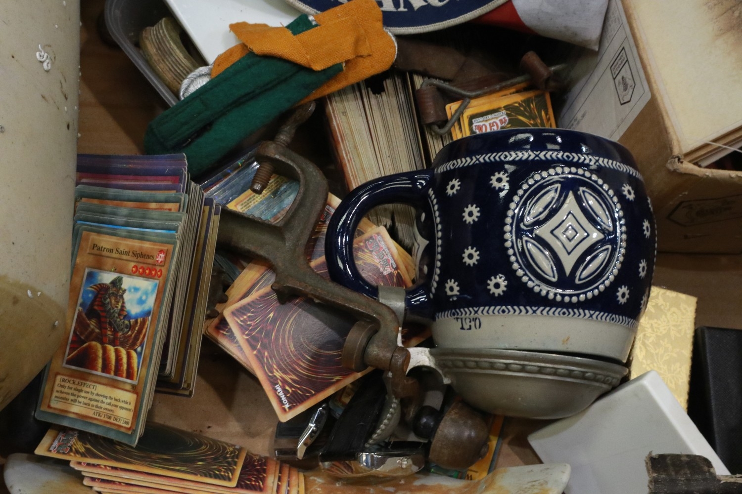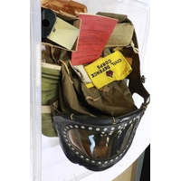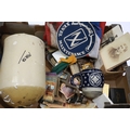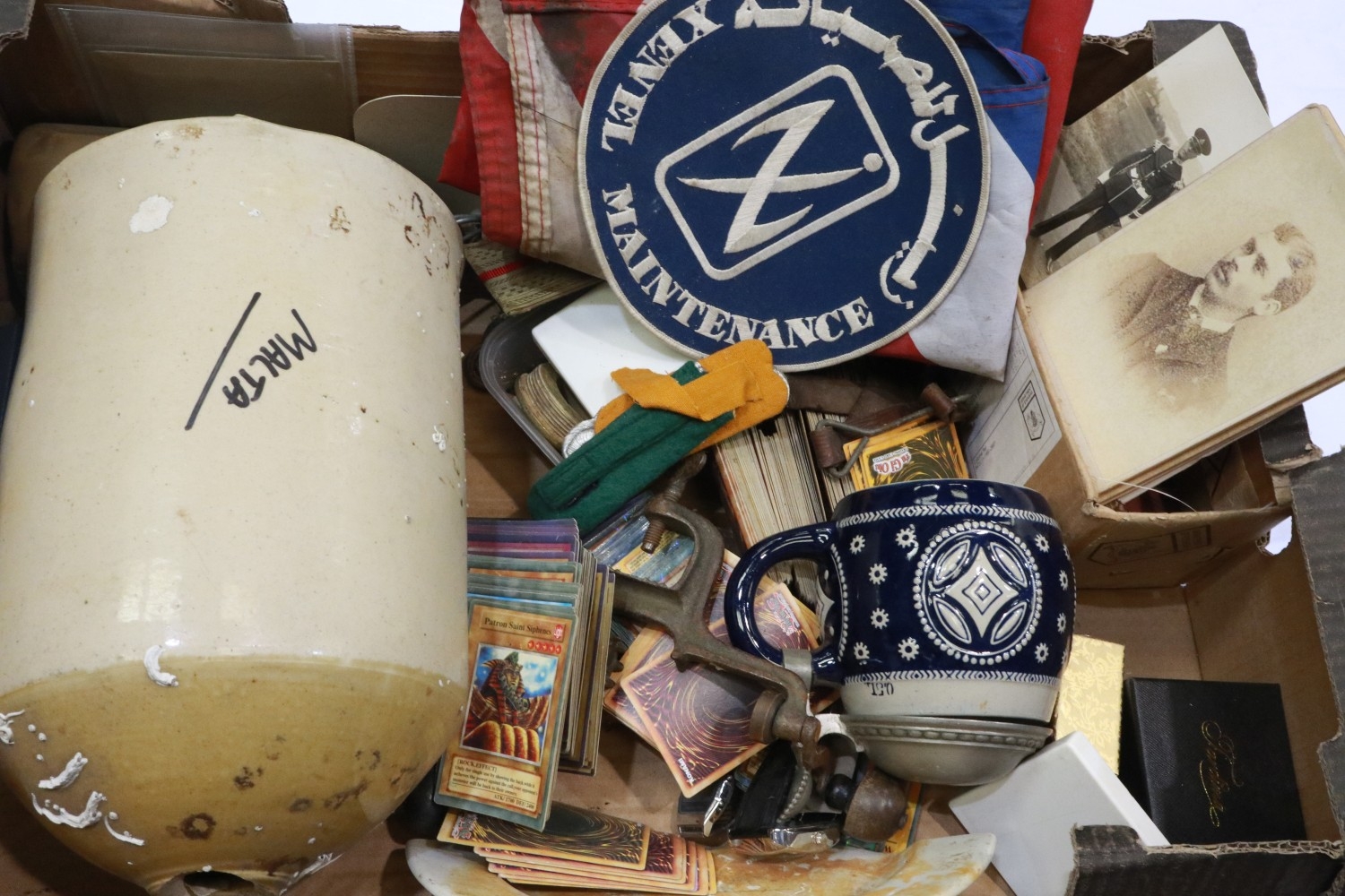 Box of militaria including Iron Cross 2nd Class Packets, DAK Water bottle, German made salt glaze lidded stein with star, misc badges and Ephemera. Not available for in-house P&P