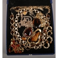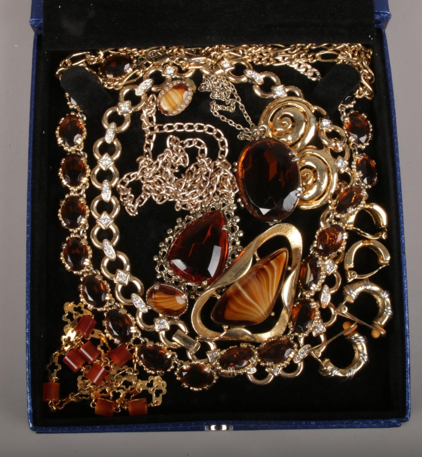A jewellery box containing vintage costume jewellery, brown paste set Hollywood brooch and similar necklace etc.