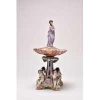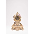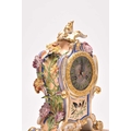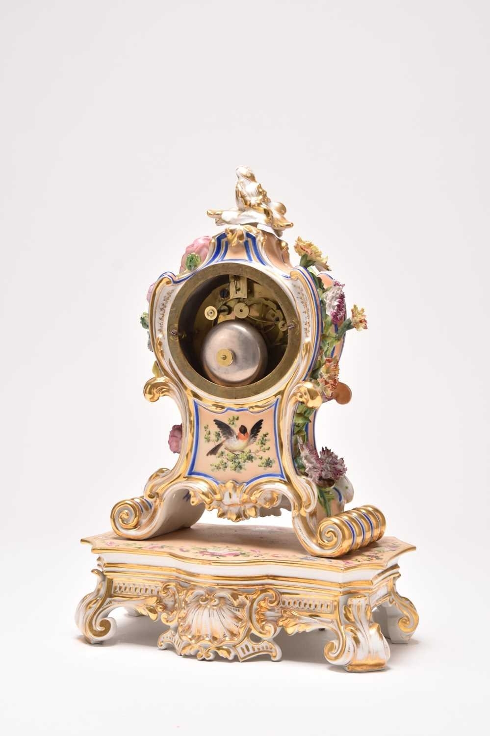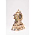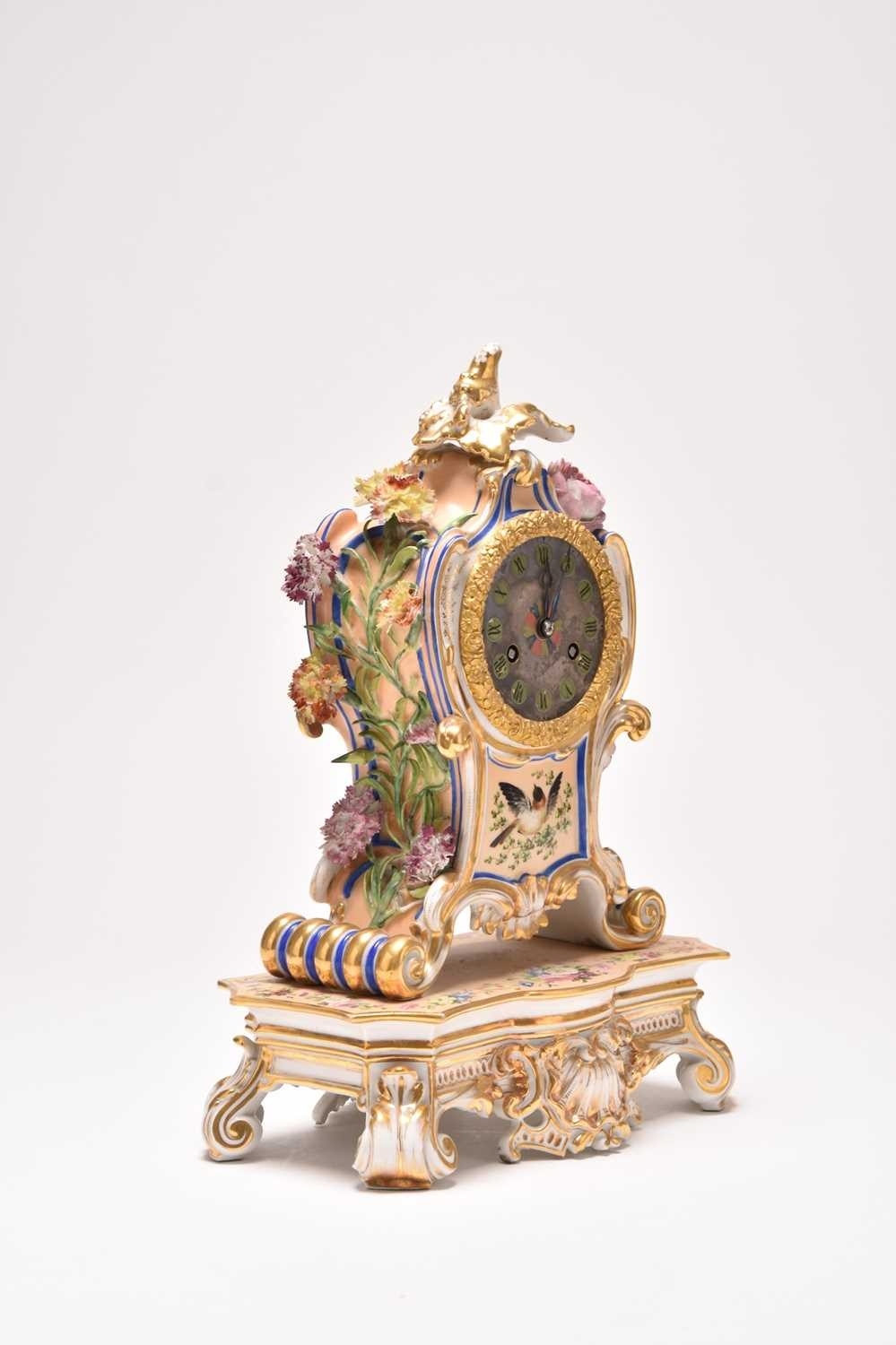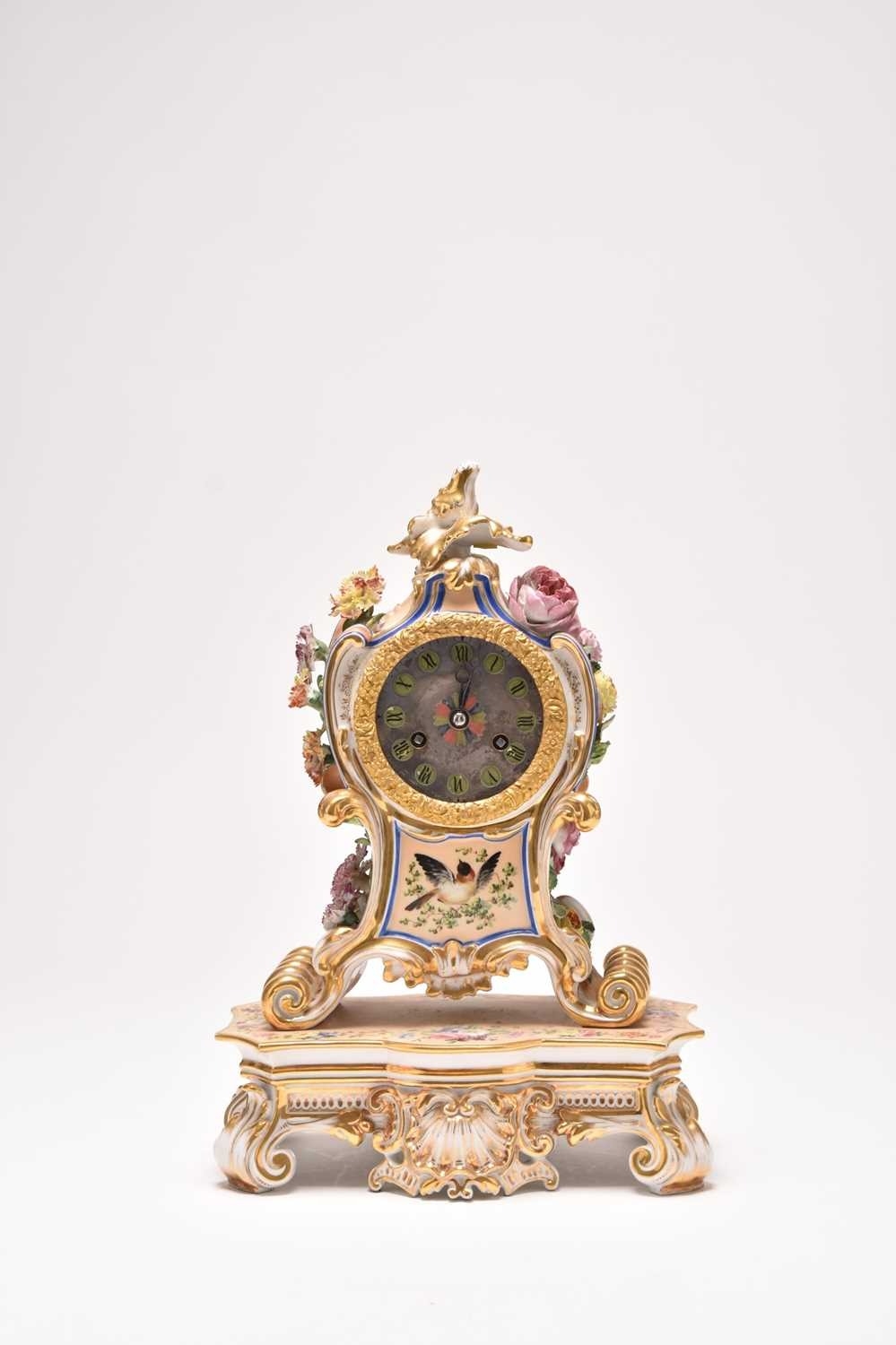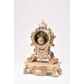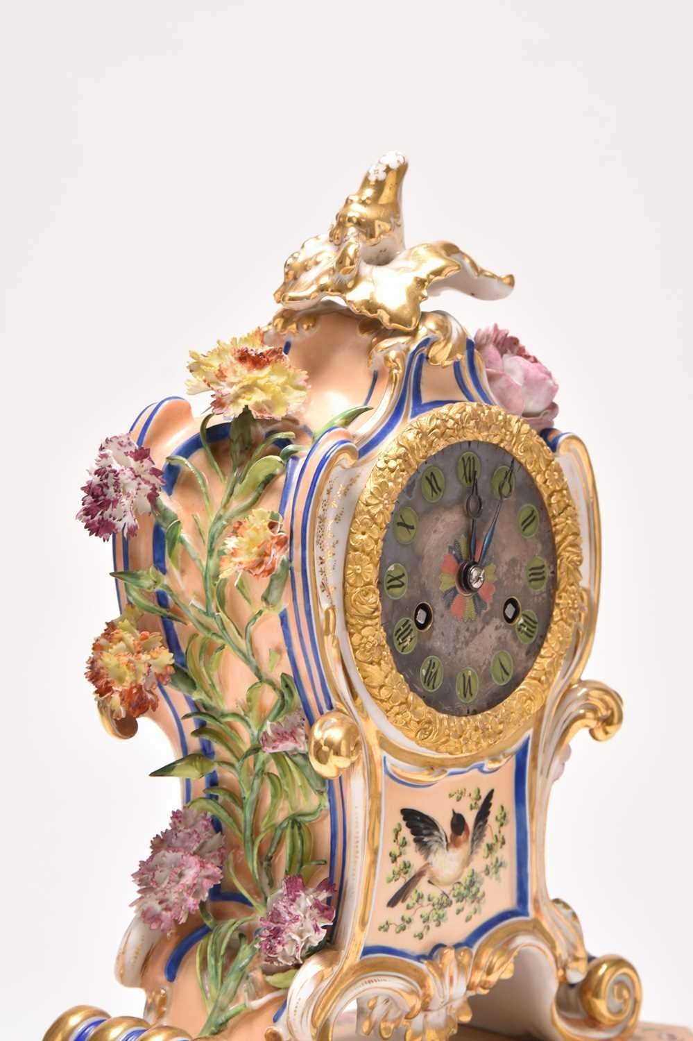 A Jacob Petit (France) porcelain mantel clock, mid to late 19th century, the balloon-shaped case adorned with flowers, painted with a bird and sprays of flowers in polychrome, the movement signed 'Wilkinson Paris', the base with central shell and raised scrolling feet, underglaze blue J.P mark to the base, 35cm high